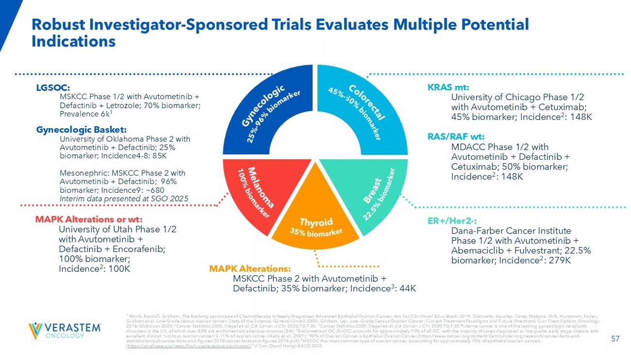 57 1 Monk, Randall, Grisham, The Evolving Landscape of Chemotherapy in Newly Diagnosed Advanced Epithelial Ovarian Cancer, Am Soc Cl in Oncol Educ Book; 2019; Slomovitz , Gourley, Carey, Malpica, Shih, Huntsman, Fader., Grisham et al, Low - Grade serous ovarian cancer: State of the Science; Gynecol Oncol; 2020. Grisham, Iyer, Low - Grade Serous Ovarian Cancer: Current Treatment Paradigms and Future Directions; Curr Treat Opti ons Oncology; 2018; Globocan 2020; 2 Cancer Statistics 2020, Siegel et. al. CA Cancer J Clin 2020;70:7 - 30 ​ ; 3 Cancer Statistics 2020, Siegel et. al. CA Cancer J Clin 2020;70:7 - 30 4 Uterine cancer is one of the leading gynecologic neoplastic disorders in the US, of which over 80% are endometrioid adenocarcinomas (EA); 5 Endometrioid OC ( EnOC ) accounts for approximately 10% of all OC, with the majority of cases diagnosed as low grade, early stage disease with excellent clinical; 6 ucinous ovarian cancer: 3 - 11% of ovarian cancer (Hada et al., 2021); 7 90% of Ovarian Cancer is Epithelial Ovarian Cancer (https:// www.cancer.org /content/dam/cancer - org/research/cancer - facts - and - statistics/annual - cancer - facts - and - figures/2018/cancer - facts - and - figures - 2018.pdf); 8 HGSOC the most common type of ovarian cancer, accounting for approximately 75% of epithelial ovarian cancers. ( https://ocrahope.org/news/high - grade - serous - carcinoma/ ) 9 Ji Son (David Hong) ASCO 2023 Robust Investigator - Sponsored Trials Evaluates Multiple Potential Indications LGSOC: MSKCC Phase 1/2 with Avutometinib + Defactinib + Letrozole; 70% biomarker; Prevalence 6k 1 Gynecologic Basket: University of Oklahoma Phase 2 with Avutometinib + Defactinib ; 25% biomarker; Incidence4 - 8: 85K Mesonephric: MSKCC Phase 2 with Avutometinib + Defactinib; 96% biomarker; Incidence9: ~680 Interim data presented at SGO 2025 KRAS mt: University of Chicago Phase 1/2 with Avutometinib + Cetuximab; 45% biomarker; Incidence 2 : 148K RAS/RAF wt : MDACC Phase 1/2 with Avutometinib + Defactinib + Cetuximab; 50% biomarker; Incidence 2 : 148K ER+/Her2 - : Dana - Farber Cance r Institute Phase 1/2 with Avutometinib + Abemaciclib + Fulvestrant ; 22.5% biomarker; Incidence 2 : 279K MAPK Alterations or wt : University of Utah Phase 1/2 with Avutometinib + Defactinib + Encorafenib ; 100% biomarker; Incidence 2 : 100K MAPK Alterations: MSKCC Phase 2 with Avutometinib + Defactinib ; 35% biomarker; Incidence 3 : 44K