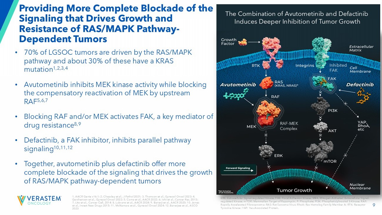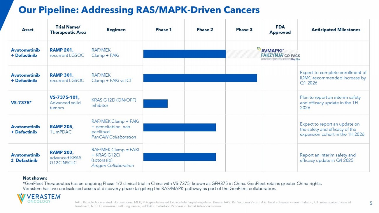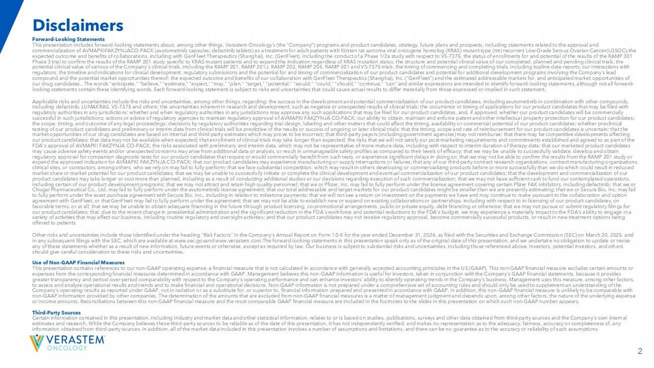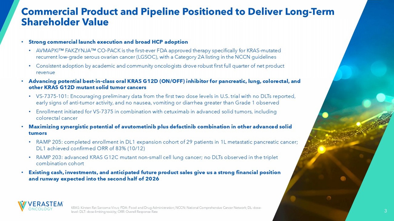 2 Forward - Looking Statements This presentation includes forward - looking statements about, among other things, Verastem Oncology’s (the “Company”) programs an d product candidates, strategy, future plans and prospects, including statements related to the approval and commercialization of AVMAPKIFAKZYNJACO - PACK ( avutometinib capsules; defactinib tablets) as a treatment for adult patients with Kirsten rat sarcoma viral oncogene homolog (KRAS) mutant - type (mt) recurrent Lo w - Grade Serous Ovarian Cancer(LGSOC),the expected outcome and benefits of collaborations, including with GenFleet Therapeutics (Shanghai), Inc. ( GenFleet ), including the conduct of a Phase 1/2a study with respect to VS - 7375, the status of enrollments for and potential of the resul ts of the RAMP 301 Phase 3 trial to confirm the results of the RAMP 201 study specific to KRAS mutant patients and to expand the indication rega rdl ess of KRAS mutation status, the structure and potential clinical value of our completed, planned and pending clinical trials , t he potential clinical value of various of the Company's clinical trials, including the RAMP 201, RAMP 201J, RAMP 203, RAMP 205, RAM P 301 and VS - 7375 trials, the timing of commencing and completing trials, including topline data reports, our interactions with regulators, the timeline and indications for clinical development, regulatory submissions and the potential for and timing of co mmercialization of our product candidates and potential for additional development programs involving the Company’s lead compound and the potential market opportunities thereof; the expected outcome and benefits of our collaboration with GenFleet Therapeutics (Shanghai), Inc. (“ GenFleet ”) and the estimated addressable markets for, and anticipated market opportunities of our drug candidates.. The words "anticipate," "believe," "estimate," "expect," "may," "plan," "target," "potential," "would," "c ould," "should," "continue," “can” and similar expressions are intended to identify forward - looking statements, although not all forward - looking statements contain these identifying words. Each forward - looking statement is subject to risks and uncertainties that co uld cause actual results to differ materially from those expressed or implied in such statement. Applicable risks and uncertainties include the risks and uncertainties, among other things, regarding: the success in the dev elo pment and potential commercialization of our product candidates, including avutometinib in combination with other compounds, including defactinib , LUMAKRAS, VS - 7375 and others; the uncertainties inherent in research and development, such as negative or unexpected results o f clinical trials; the occurrence or timing of applications for our product candidates that may be filed with regulatory authorities in any jurisdictions; whether and when regulatory authorities in any jurisdictions may approve any suc h a pplications that may be filed for our product candidates, and, if approved, whether our product candidates will be commercial ly successful in such jurisdictions; actions or advice of regulatory agencies to maintain regulatory approval of AVMAPKI FAKZYNJ A C O - PACK; our ability to obtain, maintain and enforce patent and other intellectual property protection for our product candidate s ; the scope, timing, and outcome of any legal proceedings; decisions by regulatory authorities regarding trial design, labeling an d other matters that could affect the timing, availability or commercial potential of our product candidates; whether preclin ica l testing of our product candidates and preliminary or interim data from clinical trials will be predictive of the results or s ucc ess of ongoing or later clinical trials; that the timing, scope and rate of reimbursement for our product candidates is uncer tai n; that the market opportunities of our drug candidates are based on internal and third - party estimates which may prove to be incorrect; tha t third - party payors (including government agencies) may not reimburse; that there may be competitive developments affecting our product candidates; that data may not be available when expected; that enrollment of clinical trials may take longer than ex pected; the risks that we will not satisfy our post - marketing requirements and commitments established and agreed to as part of the FDA's approval of AVMAPKI FAKZYNJA CO - PACK; the risks associated with preliminary and interim data, which may not be representat ive of more mature data, including with respect to interim duration of therapy data; that our marketed product candidates may cause adverse safety events and/or unexpected concerns may arise from additional data or analysis, or result in unmanagea ble safety profiles as compared to their levels of efficacy; that we may be unable to successfully validate, develop and obtain regulatory approval for companion diagnostic tests for our product candidates that require or would commercially benefit from su ch tests, or experience significant delays in doing so; that we may not be able to confirm the results from the RAMP 201 stud y o r expand the approved indication for AVMAPKI FAKZYNJA CO - PACK; that our product candidates may experience manufacturing or supply interruptions or failures; that any of our third - party contract research organizations, contract manufacturing organizations, clinical sites, or contractors, among others, who we rely on may fail to fully perform; that we face substantial competition, wh ich may result in others developing or commercializing products before or more successfully than we do which could result in red uced market share or market potential for our product candidates; that we may be unable to successfully initiate or complete the c lin ical development and eventual commercialization of our product candidates; that the development and commercialization of our product candidates may take long