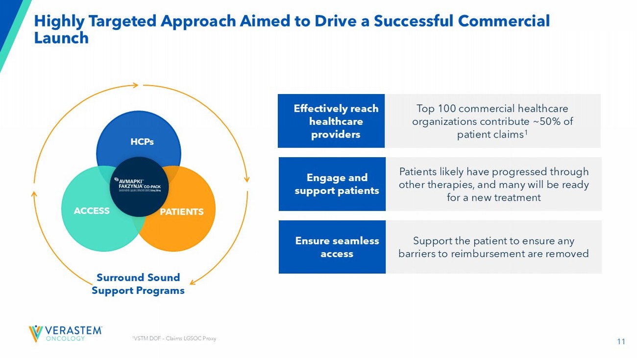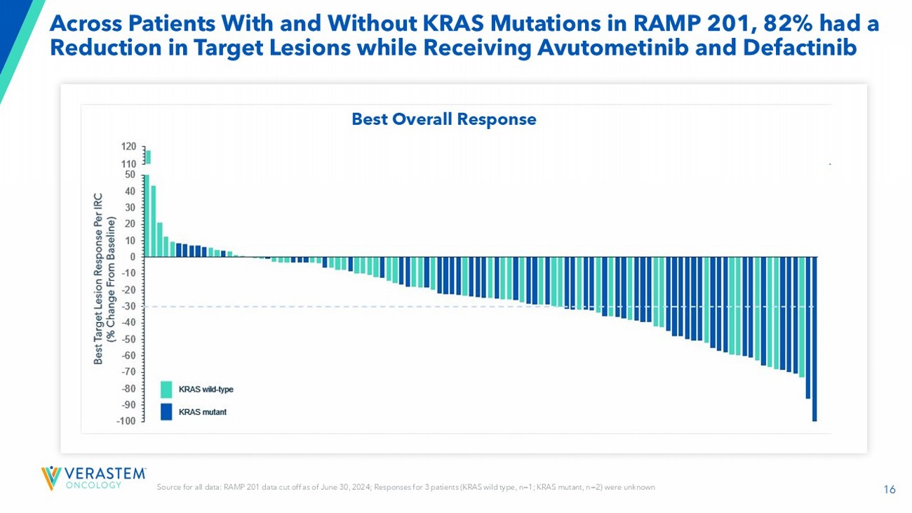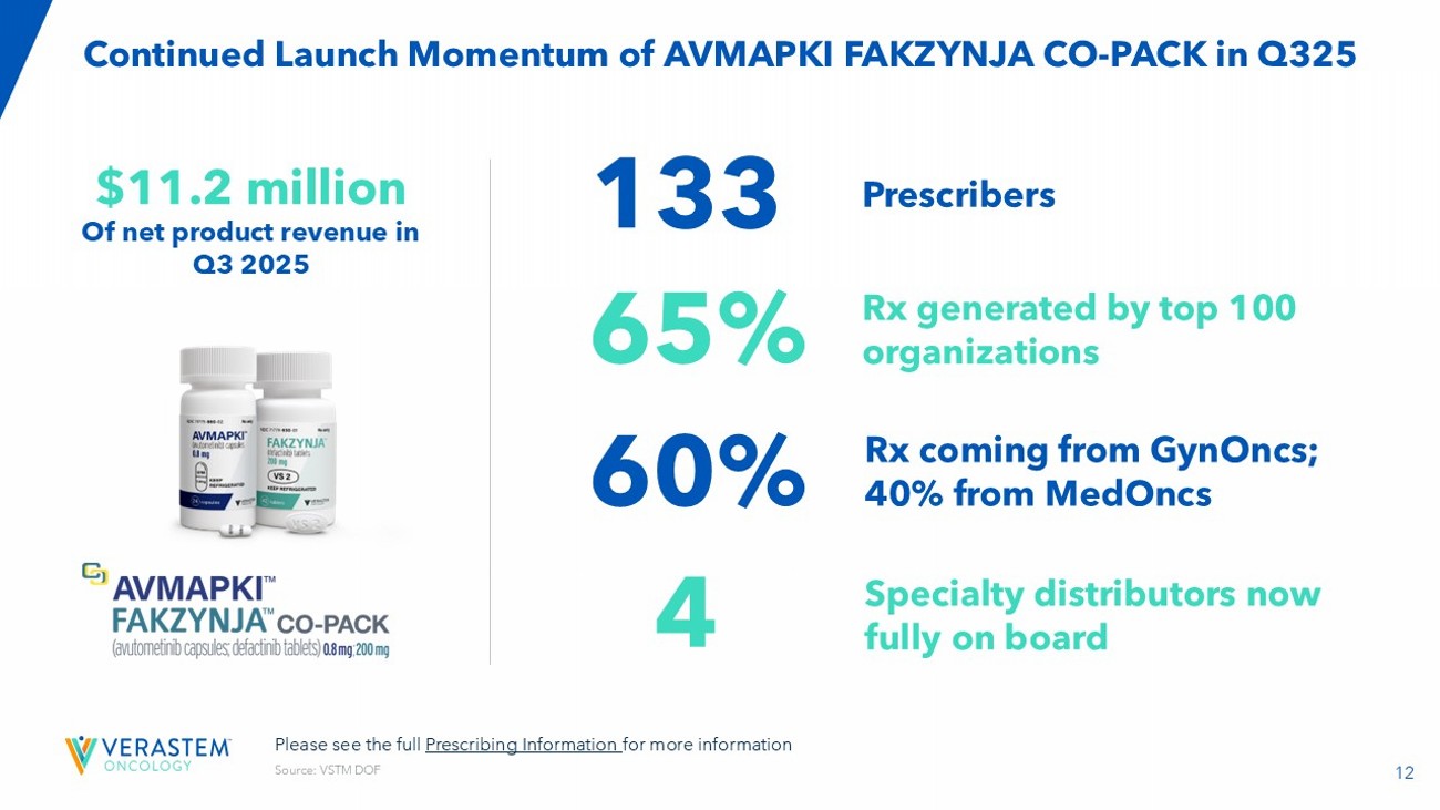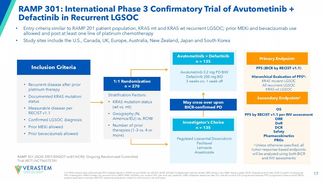 2 Forward - Looking Statements This presentation includes forward - looking statements about, among other things, Verastem Oncology’s (the “Company”) programs an d product candidates, strategy, future plans and prospects, including statements related to the approval and commercialization of AVMAPKIFAKZYNJACO - PACK ( avutometinib capsules; defactinib tablets) as a treatment for adult patients with Kirsten rat sarcoma viral oncogene homolog (KRAS) mutant - type (mt) recurrent Lo w - Grade Serous Ovarian Cancer(LGSOC),the expected outcome and benefits of collaborations, including with GenFleet Therapeutics (Shanghai), Inc. ( GenFleet ), including the conduct of a Phase 1/2a study with respect to VS - 7375, the status of enrollments for and potential of the resul ts of the RAMP 301 Phase 3 trial to confirm the results of the RAMP 201 study specific to KRAS mutant patients and to expand the indication rega rdl ess of KRAS mutation status, the structure and potential clinical value of our completed, planned and pending clinical trials , t he potential clinical value of various of the Company's clinical trials, including the RAMP 201, RAMP 201J, RAMP 203, RAMP 205, RAM P 301 and VS - 7375 trials, the timing of commencing and completing trials, including topline data reports, our interactions with regulators, the timeline and indications for clinical development, regulatory submissions and the potential for and timing of co mmercialization of our product candidates and potential for additional development programs involving the Company’s lead compound and the potential market opportunities thereof; the expected outcome and benefits of our collaboration with GenFleet Therapeutics (Shanghai), Inc. (“ GenFleet ”) and the estimated addressable markets for, and anticipated market opportunities of our drug candidates.. The words "anticipate," "believe," "estimate," "expect," "may," "plan," "target," "potential," "would," "c ould," "should," "continue," “can” and similar expressions are intended to identify forward - looking statements, although not all forward - looking statements contain these identifying words. Each forward - looking statement is subject to risks and uncertainties that co uld cause actual results to differ materially from those expressed or implied in such statement. Applicable risks and uncertainties include the risks and uncertainties, among other things, regarding: the success in the dev elo pment and potential commercialization of our product candidates, including avutometinib in combination with other compounds, including defactinib , LUMAKRAS, VS - 7375 and others; the uncertainties inherent in research and development, such as negative or unexpected results o f clinical trials; the occurrence or timing of applications for our product candidates that may be filed with regulatory authorities in any jurisdictions; whether and when regulatory authorities in any jurisdictions may approve any suc h a pplications that may be filed for our product candidates, and, if approved, whether our product candidates will be commercial ly successful in such jurisdictions; actions or advice of regulatory agencies to maintain regulatory approval of AVMAPKI FAKZYNJ A C O - PACK; our ability to obtain, maintain and enforce patent and other intellectual property protection for our product candidate s ; the scope, timing, and outcome of any legal proceedings; decisions by regulatory authorities regarding trial design, labeling an d other matters that could affect the timing, availability or commercial potential of our product candidates; whether preclin ica l testing of our product candidates and preliminary or interim data from clinical trials will be predictive of the results or s ucc ess of ongoing or later clinical trials; that the timing, scope and rate of reimbursement for our product candidates is uncer tai n; that the market opportunities of our drug candidates are based on internal and third - party estimates which may prove to be incorrect; tha t third - party payors (including government agencies) may not reimburse; that there may be competitive developments affecting our product candidates; that data may not be available when expected; that enrollment of clinical trials may take longer than ex pected; the risks that we will not satisfy our post - marketing requirements and commitments established and agreed to as part of the FDA's approval of AVMAPKI FAKZYNJA CO - PACK; the risks associated with preliminary and interim data, which may not be representat ive of more mature data, including with respect to interim duration of therapy data; that our marketed product candidates may cause adverse safety events and/or unexpected concerns may arise from additional data or analysis, or result in unmanagea ble safety profiles as compared to their levels of efficacy; that we may be unable to successfully validate, develop and obtain regulatory approval for companion diagnostic tests for our product candidates that require or would commercially benefit from su ch tests, or experience significant delays in doing so; that we may not be able to confirm the results from the RAMP 201 stud y o r expand the approved indication for AVMAPKI FAKZYNJA CO - PACK; that our product candidates may experience manufacturing or supply interruptions or failures; that any of our third - party contract research organizations, contract manufacturing organizations, clinical sites, or contractors, among others, who we rely on may fail to fully perform; that we face substantial competition, wh ich may result in others developing or commercializing products before or more successfully than we do which could result in red uced market share or market potential for our product candidates; that we may be unable to successfully initiate or complete the c lin ical development and eventual commercialization of our product candidates; that the development and commercialization of our product candidates may take long