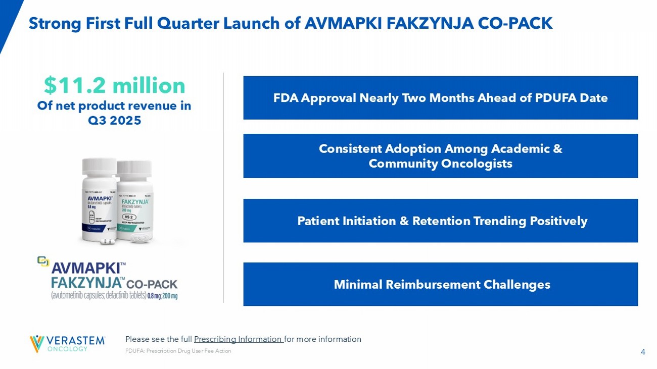 3 3 Commercial Product and Pipeline Positioned to Deliver Long - Term Shareholder Value • Strong commercial launch execution and broad HCP adoption • AVMAPKI FAKZYNJA CO - PACK is the first - ever FDA approved therapy specifically for KRAS - mutated recurrent low - grade serous ovarian cancer (LGSOC), with a Category 2A listing in the NCCN guidelines • Consistent adoption by academic and community oncologists drove robust first full quarter of net product revenue • Advancing potential best - in - class oral KRAS G12D (ON/OFF) inhibitor for pancreatic, lung, colorectal, and other KRAS G12D mutant solid tumor cancers • VS - 7375 - 101: Encouraging preliminary data from the first two dose levels in U.S. trial with no DLTs reported, early signs of anti - tumor activity, and no nausea, vomiting or diarrhea greater than Grade 1 observed • Enrollment initiated for VS - 7375 in combination with cetuximab in advanced solid tumors, including colorectal cancer • Maximizing synergistic potential of avutometinib plus defactinib combination in other advanced solid tumors • RAMP 205: completed enrollment in DL1 expansion cohort of 29 patients in 1L metastatic pancreatic cancer; DL1 achieved confirmed ORR of 83% (10/12) • RAMP 203: advanced KRAS G12C mutant non - small cell lung cancer; no DLTs observed in the triplet combination cohort • Existing cash, investments, and anticipated future product sales give us a strong financial position and runway expected into the second half of 2026 KR AS: Kirsten Rat Sarcoma Virus; FDA: Food and Drug Administration; NCCN: National Comprehensive Cancer Network; DL: dose - level: DLT: dose - limiting toxicity; ORR: Overall Response Rate