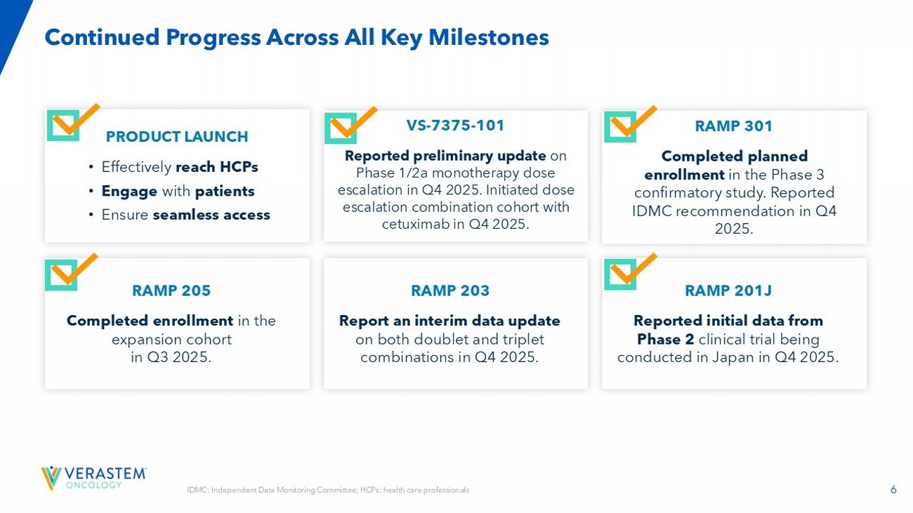 5 Anticipated Milestones FDA Approved Phase 3 Phase 2 Phase 1 Regimen Trial Name/ Therapeutic Area Asset RAF/MEK Clamp + FAKi RAMP 201, recurrent LGSOC Avutometinib + Defactinib Expect to complete enrollment of IDMC - recommended increase by Q1 2026 RAF/MEK Clamp + FAKi vs ICT RAMP 301, recurrent LGSOC Avutometinib + Defactinib Plan to report an interim safety and efficacy update in the 1H 2026 KRAS G12D (ON/OFF) inhibitor VS - 7375 - 101, Advanced solid tumors VS - 7375* Expect to report an update on the safety and efficacy of the expansion cohort in the 1H 2026 RAF/MEK Clamp + FAKi + gemcitabine, nab - paclitaxel PanCAN Collaboration RAMP 205, 1L mPDAC Avutometinib + Defactinib Report an interim safety and efficacy update in Q4 2025 RAF/MEK Clamp ± FAKi + KRAS G12Ci (sotorasib) Amgen Collaboration RAMP 203, advanced KRAS G12C NSCLC Avutometinib “ Defactinib RAF: Rapidly Accelerated Fibrosarcoma; MEK, Mitogen - Activated Extracellular Signal - regulated Kinase; RAS: Rat Sarcoma Virus; FAKi : focal adhesion kinase inhibitor; ICT: investigator choice of treatment; NSCLC: non - small cell lung cancer; mPDAC : metastatic Pancreatic Ductal Adenocarcinoma Our Pipeline: Addressing RAS/MAPK - Driven Cancers Not shown: *GenFleet Therapeutics has an ongoing Phase 1/2 clinical trial in China with VS - 7375, known as GFH375 in China. GenFleet retains greater China rights. Verastem has two undisclosed assets at discovery phase targeting the RAS/MAPK - pathway as part of the GenFleet collaboration.