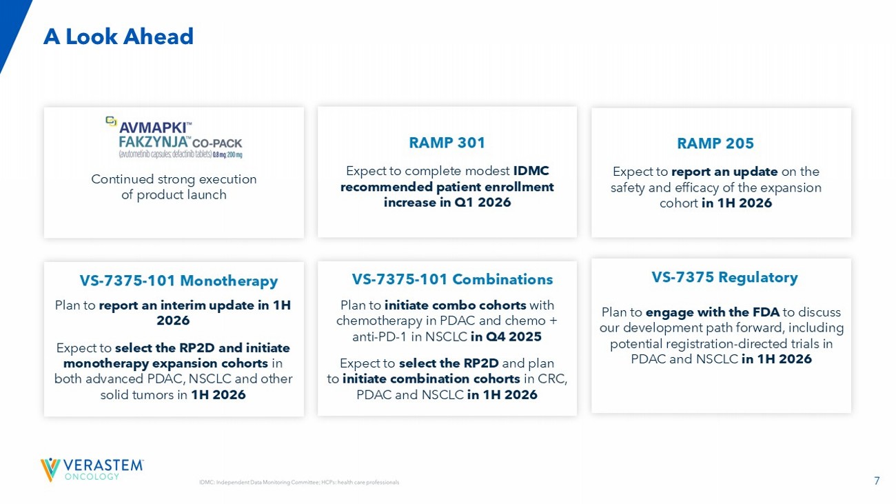 6 Continued Progress Across All Key Milestones RAMP 301 Completed planned enrollment in the Phase 3 confirmatory study. Reported IDMC recommendation in Q4 2025. RAMP 201J Reported initial data from Phase 2 clinical trial being conducted in Japan in Q4 2025. RAMP 203 Report an interim data update on both doublet and triplet combinations in Q4 2025. RAMP 205 Completed enrollment in the expansion cohort in Q3 2025. PRODUCT LAUNCH • Effectively reach HCPs • Engage with patients • Ensure seamless access VS - 7375 - 101 ​ Reported preliminary update on Phase 1/2a monotherapy dose escalation in Q4 2025. ​ Initiated dose escalation combination cohort with cetuximab in Q4 2025. IDMC: Independent Data Monitoring Committee; HCPs: health care professionals