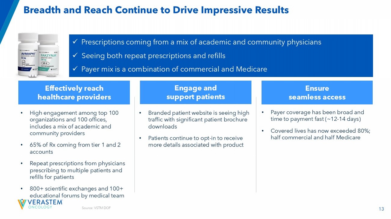 12 Continued Launch Momentum of AVMAPKI FAKZYNJA CO - PACK in Q325 Please see the full Prescribing Information for more information Source: VSTM DOF $11.2 million Of net product revenue in Q3 2025 133 Prescribers 65% Rx generated by top 100 organizations 60% Rx coming from GynOncs ; 40% from MedOncs 4 Specialty distributors now fully on board