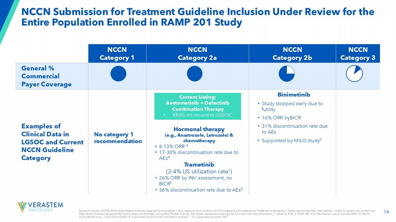 14 NCCN Submission for Treatment Guideline Inclusion Under Review for the Entire Population Enrolled in RAMP 201 Study NCCN Category 3 NCCN Category 2b NCCN Category 2a NCCN Category 1 General % Commercial Payer Coverage Binimetinib • Study stopped early due to futility • 16% ORR byBICR • 31% discontinuation rate due to AEs • Supported by MILO study 3 Hormonal therapy (e.g., Anastrozole, Letrozole) & chemotherapy • 6 - 13% ORR 4 • 17 - 30% discontinuation rate due to AEs 4 Trametinib (2 - 4% US utilization rate 1 ) • 26% ORR by INV assessment, no BICR 5 • 36% discontinuation rate due to AEs 5 No category 1 recommendation Examples of Clinical Data in LGSOC and Current NCCN Guideline Category General source: NCCN; McGivney Global Advisory research and analysis; L.E.K. research and analysis. NCCN categories of prefer enc e: Preferred intervention, Other recommended intervention, Useful in certain circumstances. High - level of evidence generally means large randomized controlled Phased 3 trials; Pie charts represent coverage by all major c ommercial players; 1. Data on File; 2. GOG 281 trial Gershenson et al., Lancet 2022; ​ 3. MILO Study Monk et al., J Clin Oncol 2020; 4. Supported by GOG 281 and MILO studies 2,3 ; 5. Supported by GOG 281 2 Current Listing: Avutometinib + Defactinib Combination Therapy • KRAS mt recurrent LGSOC