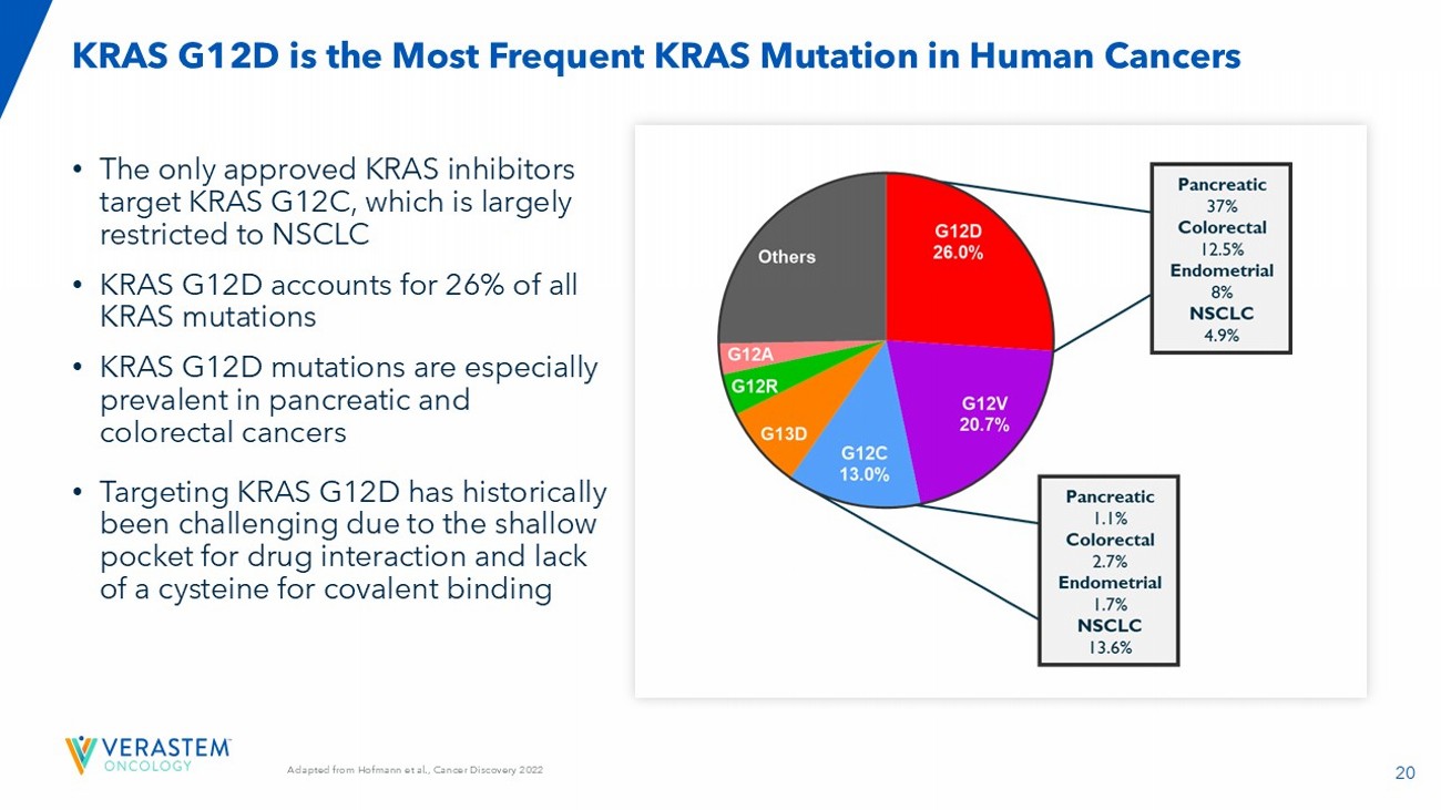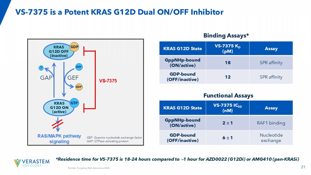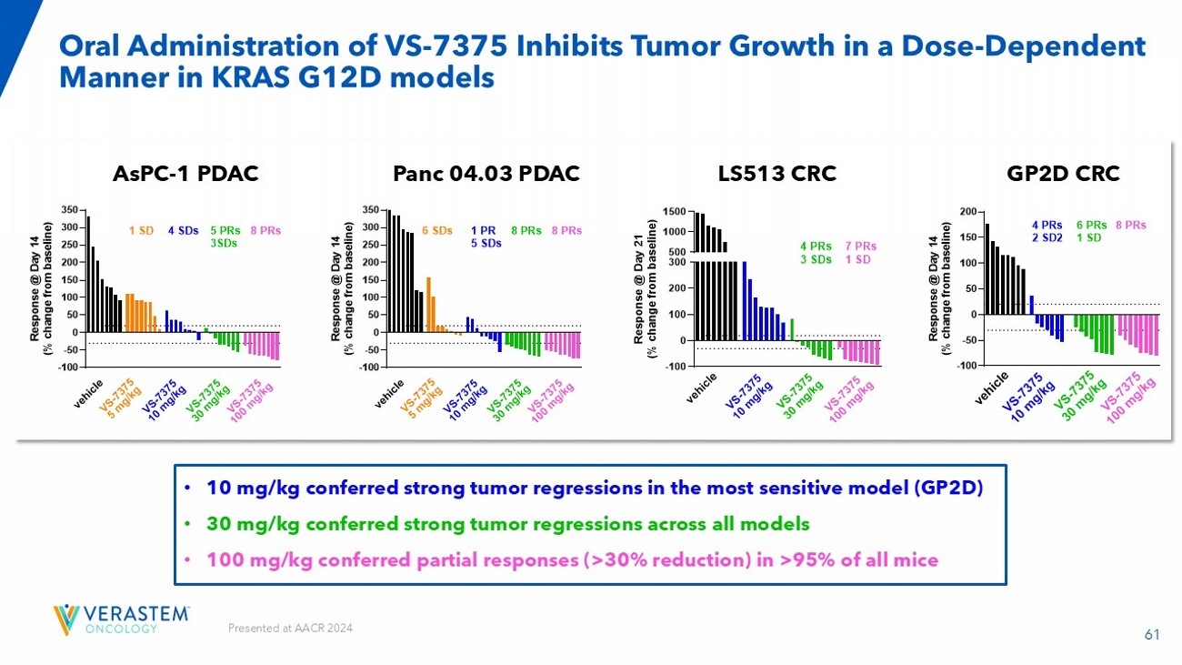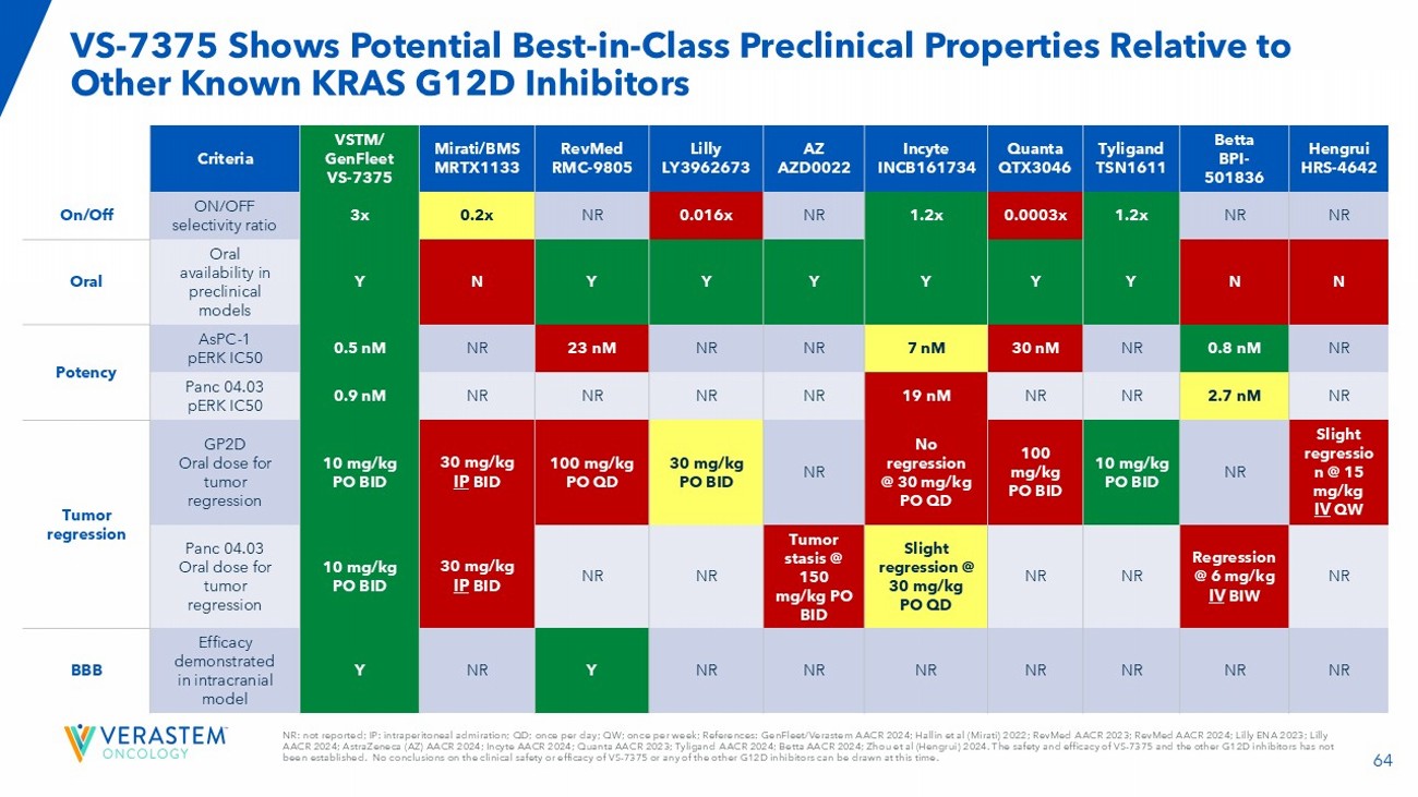64 NR: not reported; IP: intraperitoneal admiration; QD; once per day; QW; once per week; References: GenFleet /Verastem AACR 2024; Hallin et al (Mirati) 2022; RevMed AACR 2023; RevMed AACR 2024; Lilly ENA 2023; Lilly AACR 2024; AstraZeneca (AZ) AACR 2024; Incyte AACR 2024; Quanta AACR 2023; Tyligand AACR 2024; Betta AACR 2024; Zhou et al ( Hengrui ) 2024. The safety and efficacy of VS - 7375 and the other G12D inhibitors has not been established. No conclusions on the clinical safety or efficacy of VS - 7375 or any of the other G12D inhibitors can be drawn at this time. VS - 7375 Shows Potential Best - in - Class Preclinical Properties Relative to Other Known KRAS G12D Inhibitors Hengrui HRS - 4642 Betta BPI - 501836 Tyligand TSN1611 Quanta QTX3046 Incyte INCB161734 AZ AZD0022 Lilly LY3962673 RevMed RMC - 9805 Mirati/BMS MRTX1133 VSTM/ GenFleet VS - 7375 Criteria NR NR 1.2x 0.0003x 1.2x NR 0.016x NR 0.2x 3x ON/OFF selectivity ratio On/Off N N Y Y Y Y Y Y N Y Oral availability in preclinical models Oral NR 0.8 nM NR 30 nM 7 nM NR NR 23 nM NR 0.5 nM AsPC - 1 pERK IC50 Potency NR 2.7 nM NR NR 19 nM NR NR NR NR 0.9 nM Panc 04.03 pERK IC50 Slight regressio n @ 15 mg/kg IV QW NR 10 mg/kg PO BID 100 mg/kg PO BID No regression @ 30 mg/kg PO QD NR 30 mg/kg PO BID 100 mg/kg PO QD 30 mg/kg IP BID 10 mg/kg PO BID GP2D Oral dose for tumor regression Tumor regression NR Regression @ 6 mg/kg IV BIW NR NR Slight regression @ 30 mg/kg PO QD Tumor stasis @ 150 mg/kg PO BID NR NR 30 mg/kg IP BID 10 mg/kg PO BID Panc 04.03 Oral dose for tumor regression NR NR NR NR NR NR NR Y NR Y Efficacy demonstrated in intracranial model BBB