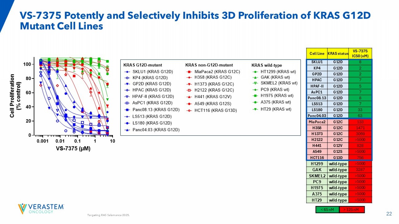 21 VS - 7375 is a Potent KRAS G12D Dual ON/OFF Inhibitor GEF GTP GDP GTP GDP VS - 7375 RAS/MAPK pathway signaling GEF: Guanine nucleotide exchange factor GAP: GTPase - activating protein GAP P KRAS G12D OFF (inactive) KRAS G12D ON (active) Assay VS - 7375 IC 50 ( nM ) KRAS G12D State RAF1 binding 2 1 GppNHp - bound (ON/active) Nucleotide exchange 6 1 GDP - bound (OFF/inactive) Assay VS - 7375 K D ( pM ) KRAS G12D State SPR affinity 18 GppNHp - bound (ON/active) SPR affinity 12 GDP - bound (OFF/inactive) Binding Assays* Functional Assays *Residence time for VS - 7375 is 18 - 24 hours compared to 1 hour for AZD0022 (G12Di) or AMG410 (pan - KRASi ) Pachter, Targeting RAS Salamanca 2025.