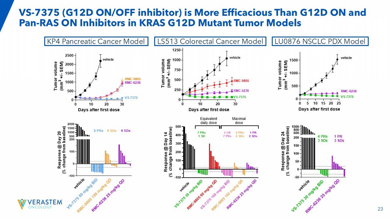 22 VS - 7375 Potently and Selectively Inhibits 3D Proliferation of KRAS G12D Mutant Cell Lines VS - 7375 IC50 (nM) KRAS status Cell Line 8 G12D SKLU1 2 G12D KP4 2 G12D GP2D 7 G12D HPAC 5 G12D HPAF - II 7 G12D AsPC1 8 G12D Panc08.13 7 G12D LS513 33 G12D LS180 63 G12D Panc04.03 133 G12C MiaPaca2 1471 G12C H358 3069 G12C H1373 >5000 G12C H2122 828 G12V H441 >5000 G12S A549 756 G13D HCT116 >5000 wild - type H1299 3287 wild - type GAK >5000 wild - type SKMEL2 >5000 wild - type PC9 >5000 wild - type H1975 >5000 wild - type A375 >5000 wild - type HT29 0.001 0.01 0.1 1 10 0 20 40 60 80 100 VS-7375 (µM) C e l l P r o l i f e r a t i o n ( % c o n t r o l ) LS180 (KRAS G12D) Panc04.03 (KRAS G12D) SKLU1 (KRAS G12D) AsPC1 (KRAS G12D) HPAF-II (KRAS G12D) KP4 (KRAS G12D) A549 (KRAS G12S) MiaPaca2 (KRAS G12C) H1975 (KRAS wt) A375 (KRAS wt) GAK (KRAS wt) H441 (KRAS G12V) VS-7375 HT29 (KRAS wt) H1373 (KRAS G12C) PC9 (KRAS wt) H358 (KRAS G12C) GP2D (KRAS G12D) Panc08.13 (KRAS G12D) H2122 (KRAS G12C) SKMEL2 (KRAS wt) KRAS G12D-mutant KRAS non-G12D-mutant KRAS wild-type HPAC (KRAS G12D) HCT116 (KRAS G13D) HT1299 (KRAS wt) LS513 (KRAS G12D) 0.001 0.01 0.1 1 10 0 20 40 60 80 100 VS-7375 (µM) C e l l P r o l i f e r a t i o n ( % c o n t r o l ) LS180 (KRAS G12D) Panc04.03 (KRAS G12D) SKLU1 (KRAS G12D) AsPC1 (KRAS G12D) HPAF-II (KRAS G12D) KP4 (KRAS G12D) A549 (KRAS G12S) MiaPaca2 (KRAS G12C) H1975 (KRAS wt) A375 (KRAS wt) GAK (KRAS wt) H441 (KRAS G12V) VS-7375 HT29 (KRAS wt) H1373 (KRAS G12C) PC9 (KRAS wt) H358 (KRAS G12C) GP2D (KRAS G12D) Panc08.13 (KRAS G12D) H2122 (KRAS G12C) SKMEL2 (KRAS wt) KRAS G12D-mutant KRAS non-G12D-mutant KRAS wild-type HPAC (KRAS G12D) HCT116 (KRAS G13D) HT1299 (KRAS wt) LS513 (KRAS G12D) Targeting RAS Salamanca 2025.