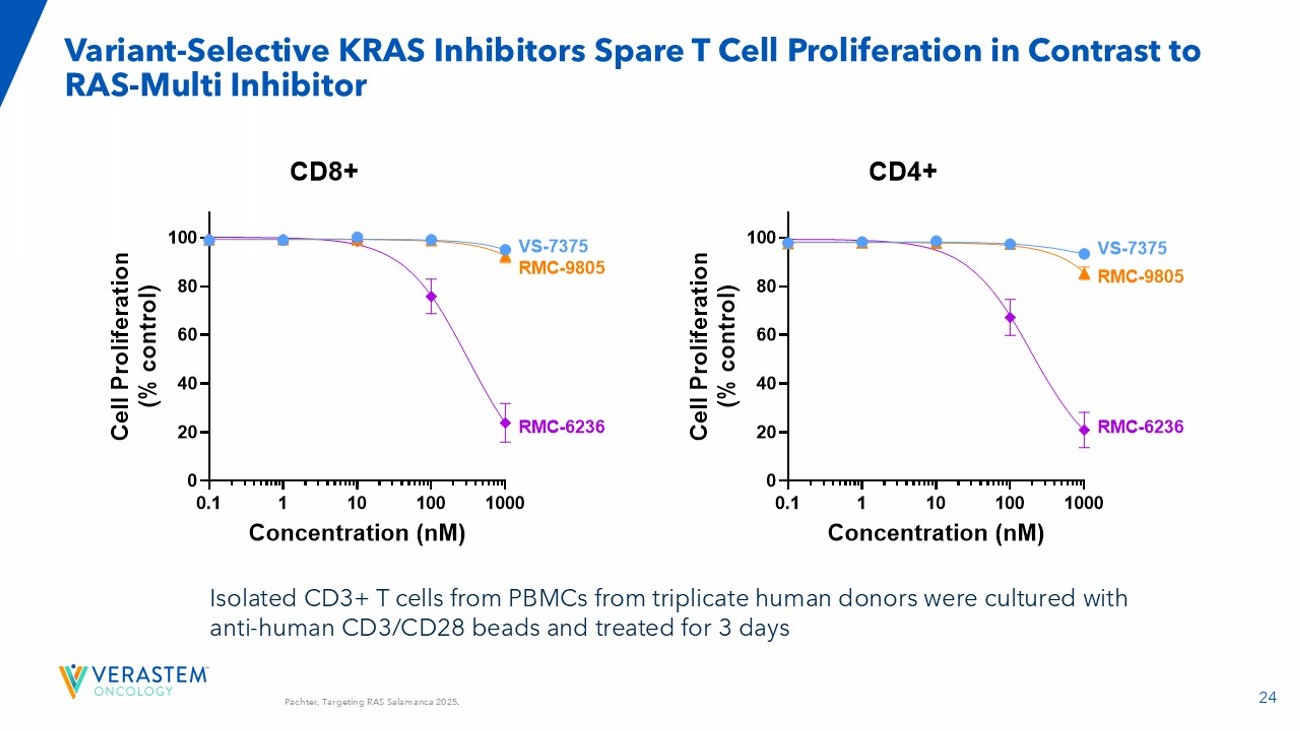 24 Variant - Selective KRAS Inhibitors Spare T Cell Proliferation in Contrast to RAS - Multi Inhibitor 0.1 1 10 100 1000 0 20 40 60 80 100 Concentration (nM) C e l l P r o l i f e r a t i o n ( % c o n t r o l ) VS-7375 RMC-9805 RMC-6236 VS-7375 RMC-9805 RMC-6236 CD8+ 0.1 1 10 100 1000 0 20 40 60 80 100 Concentration (nM) C e l l P r o l i f e r a t i o n ( % c o n t r o l ) VS-7375 RMC-9805 RMC-6236 VS-7375 RMC-9805 RMC-6236 CD4+ Isolated CD3+ T cells from PBMCs from triplicate human donors were cultured with anti - human CD3/CD28 beads and treated for 3 days Pachter, Targeting RAS Salamanca 2025.