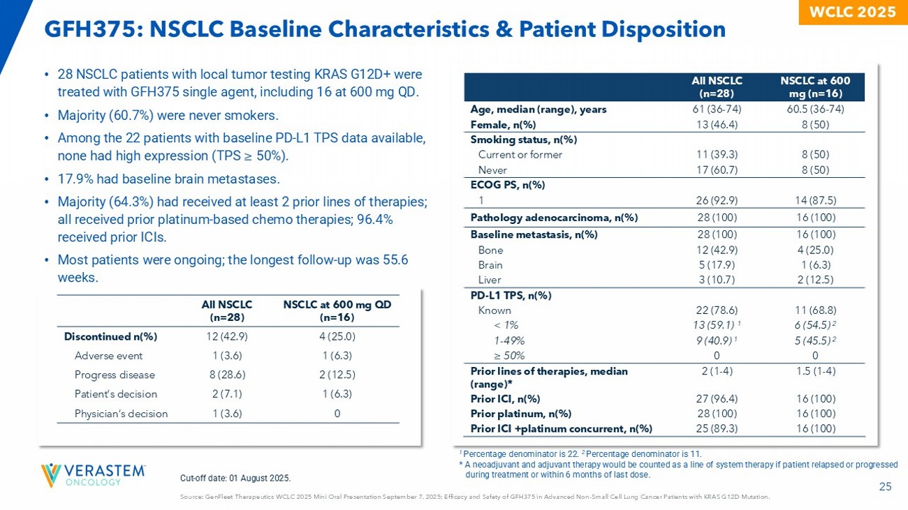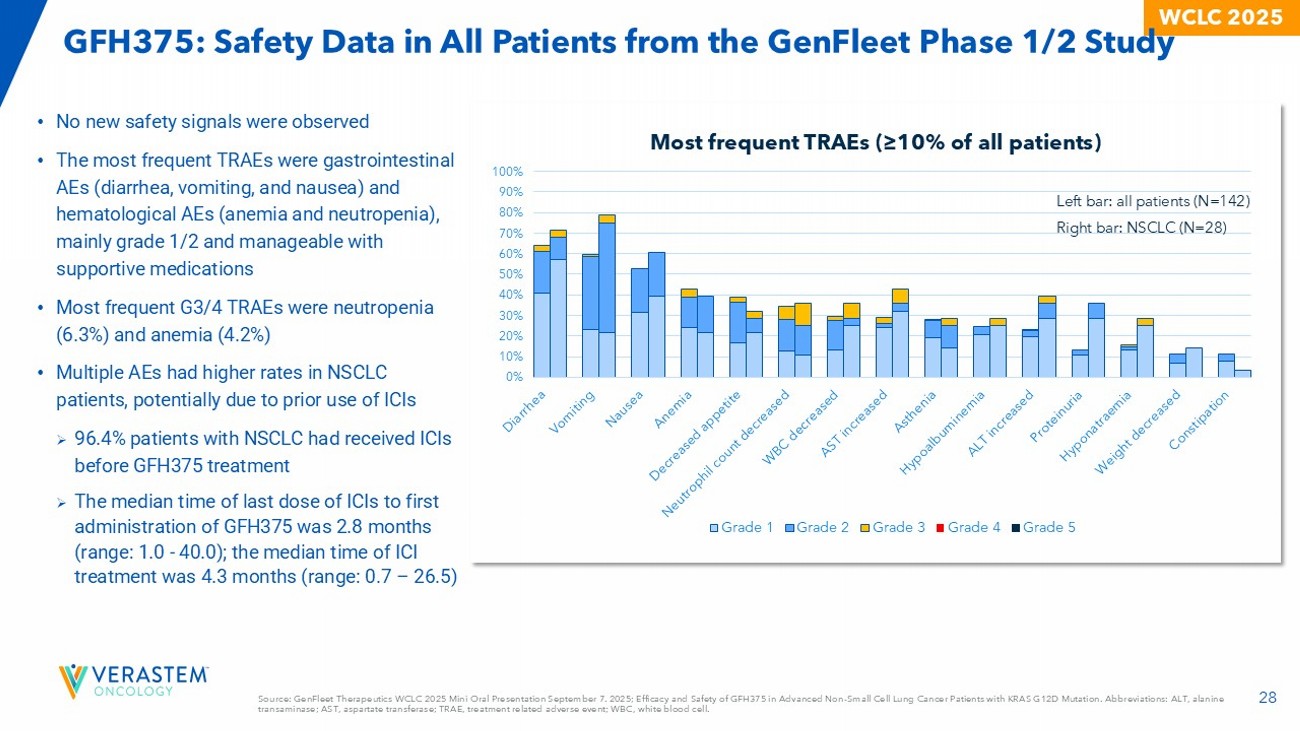 27 WCLC 2025 GFH375: Safety Data in All Patients from the GenFleet Phase 1/2 Study Source: GenFleet Therapeutics WCLC 2025 Mini Oral Presentation September 7. 2025; Efficacy and Safety of GFH375 in Advanced N on - Small Cell Lung Cancer Patients with KRAS G12D Mutation. • 142 patients, including 28 NSCLC, with advanced KRAS G12D mutation were treated with GFH375 single agent . » 93% had baseline ECOG PS = 1. » 75% had received at least ≥ 2 prior lines of therapies. • 97 patients, including 16 NSCLC, were treated at 600 mg QD. • No treatment related death. • 4.2% of patients discontinued treatment due to TRAEs. Dose intensity = 90%. • 27.5% of patients had grade 3/4 TRAEs. • Overall, GFH375 has manageable safety profile in previously treated advanced cancer patients. • Grade ≥3 TRAEs and SAEs are more frequent in NSCLC patients; however, discontinuation rate appears to be similar. 600 mg QD All dose levels Adverse events, n(%) NSCLC (N=16) All types (N=97) NSCLC 2 (N=28) All types 1 (N=142) TEAEs 16 (100) 96 (99.0) 28 (100) 141 (99.3) All grades 7 (43.8) 41 (42.3) 15 (53.6) 60 (42.3) Grade ≥ 3 3 (18.8) 19 (19.6) 6 (21.4) 27 (19.0) SAE 4 (25.0) 31 (32.0) 10 (35.7) 51 (35.9) Leading to interruption 3 (18.8) 7 ( 7.2) 5 (17.9) 12 ( 8.5) Leading to reduction 1 (6.3) 6 (6.2) 1 (3.6) 9 (6.3) Leading to discontinuation 0 3 (3.1) 0 4 (2.8) Leading to death ​ ​ TRAEs 16 (100) 96 (99.0) 28 (100) 139 (97.9) All grades 6 (37.5) 25 (25.8) ​ 13 (46.4) ​ 39 (27.5) ​ Grade ≥ 3 2 (12.5) 8 (8.2) 4 (14.3) 11 (7.7) SAE 3 (18.8) 19 (19.6) 9 (32.1) 33 (23.2) Leading to interruption 3 (18.8) 7 (7.2) 5 (17.9) 11 (7.7) Leading to reduction 1 ( 6.3) 4 (4.1) 1 ( 3.6) 6 (4.2) Leading to discontinuation 0 0 0 0 Leading to death Data c ut - off date: 17 Jun 2025 The median exposure time to GFH375 in all patients was 9.6 (range: 0.9 - 49.1) week s by the cut - off date. 1 Including all patients treated at all dose levels: 100 mg QD (n=1), 200 mg QD (n=1), 400 mg QD (n=29), 600 mg QD (n=97), 750 m g QD (n=8) , 900 mg QD (n=3), and 300 mg BID (n=3). 2 Including NSCLC patients treated at all dose levels: 100 mg QD (n=1), 200 mg QD (n=1), 400 mg QD (n=7), 600 mg QD (n=16), 7 50 mg QD (n=1) , and 300 mg BID (n=2). SAE, serious adverse event; TEAE, treatment emergent adverse event; TRAE, treatment related adverse event.
