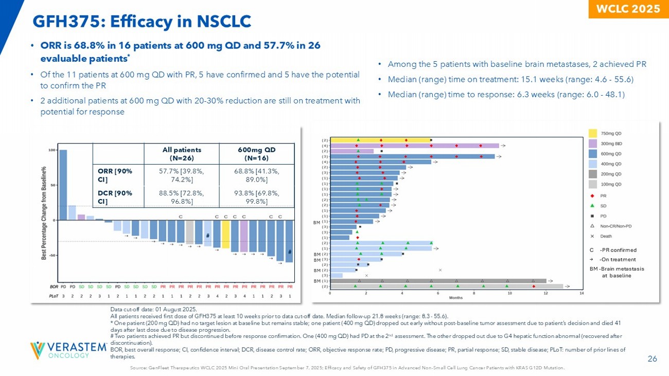25 Source: GenFleet Therapeutics WCLC 2025 Mini Oral Presentation September 7. 2025; Efficacy and Safety of GFH375 in Advanced N on - Small Cell Lung Cancer Patients with KRAS G12D Mutation. WCLC 2025 Cut - off date: 01 August 2025. NSCLC at 600 mg QD (n=16) All NSCLC (n=28) 4 (25.0) 12 (42.9) Discontinued n(%) 1 (6.3) 1 (3.6) Adverse event 2 (12.5) 8 (28.6) Progress disease 1 (6.3) 2 (7.1) Patient’s decision 0 1 (3.6) Physician’s decision • 28 NSCLC patients with local tumor testing KRAS G12D+ were treated with GFH375 single agent, including 16 at 600 mg QD. • Majority (60.7%) were never smokers. • Among the 22 patients with baseline PD - L1 TPS data available, none had high expression (TPS ≥ 50%). • 17.9% had baseline brain metastases. • Majority (64.3%) had received at least 2 prior lines of therapies; all received prior platinum - based chemo therapies; 96.4% received prior ICIs. • Most patients were ongoing; the longest follow - up was 55.6 weeks. NSCLC at 600 mg (n=16) All NSCLC (n=28) 60.5 (36 - 74) 61 (36 - 74) Age, median (range), years 8 (50) 13 (46.4) Female, n(%) Smoking status, n(%) 8 (50) ​​ 11 (39.3) Current or former 8 (50) ​ 17 (60.7) ​ Never ECOG PS, n(%) 14 (87.5) 26 (92.9) 1 16 (100) 28 (100) Pathology adenocarcinoma, n(%) 16 (100) 28 (100) Baseline metastasis, n(%) 4 (25.0) 12 (42.9) Bone 1 (6.3) 5 (17.9) Brain 2 (12.5) 3 (10.7) Liver PD - L1 TPS, n(%) ​ 11 (68.8) 22 (78.6) Known 6 (54.5) 2 13 (59.1) 1 < 1% 5 (45.5) 2 9 (40.9) 1 1 - 49% 0 0 ≥ 50% 1.5 (1 - 4) 2 (1 - 4) Prior lines of therapies, median (range) * 16 (100) 27 (96.4) Prior ICI, n(%) 16 (100) 28 (100) Prior platinum, n(%) 16 (100) 25 (89.3) Prior ICI +platinum concurrent, n(%) 1 Percentage denominator is 22. 2 Percentage denominator is 11. * A neoadjuvant and adjuvant therapy would be counted as a line of system therapy if patient relapsed or progressed during treatment or within 6 months of last dose. GFH375: NSCLC Baseline Characteristics & Patient Disposition