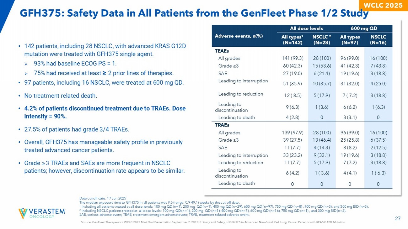 26 Source: GenFleet Therapeutics WCLC 2025 Mini Oral Presentation September 7. 2025; Efficacy and Safety of GFH375 in Advanced N on - Small Cell Lung Cancer Patients with KRAS G12D Mutation. WCLC 2025 600mg QD (N=16) All patients (N=26) 68.8% [41.3%, 89.0%] 57.7% [39.8%, 74.2%] ORR [90% CI] 93.8% [69.8%, 99.8%] 88.5% [72.8%, 96.8%] DCR [90% CI] • ORR is 68.8% in 16 patients at 600 mg QD and 57.7% in 26 evaluable patients * • Of the 11 patients at 600 mg QD with PR, 5 have confirmed and 5 have the potential to confirm the PR • 2 additional patients at 600 mg QD with 20 - 30% reduction are still on treatment with potential for response # # • Among the 5 patients with baseline brain metastases, 2 achieved PR • Median (range) time on treatment: 15.1 weeks (range: 4.6 - 55.6) • Median (range) time to response: 6.3 weeks (range: 6.0 - 48.1) C - PR confirmed → - On treatment BM - Brain metastasis at baseline BM BM BM BM BM Data cut - off date: 01 August 2025. All patients received first dose of GFH375 at least 10 weeks prior to data cut - off date. Median follow - up 21.8 weeks (range: 8.3 - 55.6). * One patient (200 mg QD) had no target lesion at baseline but remains stable; one patient (400 mg QD) dropped out early with out post - baseline tumor assessment due to patient’s decision and died 41 days after last dose due to disease progression. # Two patients achieved PR but discontinued before response confirmation. One (400 mg QD) had PD at the 2 nd assessment. The other dropped out due to G4 hepatic function abnormal (recovered after discontinuation). BOR, best overall response; CI, confidence interval; DCR, disease control rate; ORR, objective response rate; PD, progressive di sease; PR, partial response; SD, stable disease; PLoT : number of prior lines of therapies. GFH375: Efficacy in NSCLC