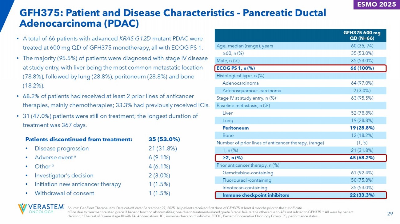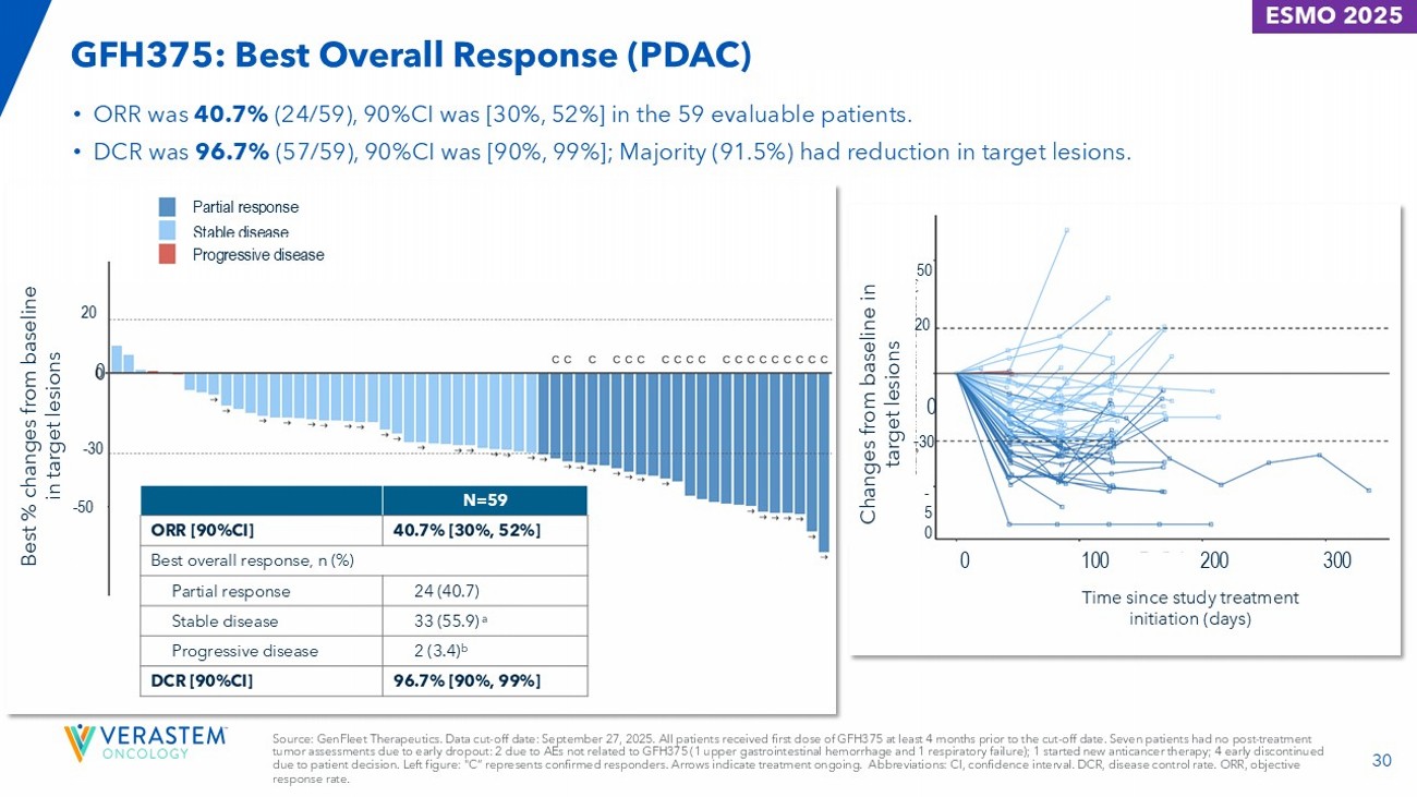 29 GFH375 600 mg QD (N=66) 60 (35, 74) Age, median (range), years 35 (53.0%) ≥ 60, n (%) 35 (53.0%) Male, n (%) 66 (100%) ECOG PS 1, n (%) Histological type, n (%) 64 (97.0%) Adenocarcinoma 2 (3.0%) Adenosquamous carcinoma 63 (95.5%) Stage IV at study entry, n (%) c Baseline metastasis, n (%) 52 (78.8%) Liver 19 (28.8%) Lung 19 (28.8%) Peritoneum 12 (18.2%) Bone (1, 5) Number of prior lines of anticancer therapy, (range) 21 (31.8%) 1, n (%) 45 (68.2%) ≥ 2, n (%) Prior anticancer therapy, n (%) 61 (92.4%) Gemcitabine - containing 50 (75.8%) Fluorouracil - containing 35 (53.0%) Irinotecan - containing 22 (33.3%) Immune checkpoint inhibitors • A total of 66 patients with advanced KRAS G12D mutant PDAC were treated at 600 mg QD of GFH375 monotherapy, all with ECOG PS 1. • The majority (95.5%) of patients were diagnosed with stage IV disease at study entry, with liver being the most common metastatic location (78.8%), followed by lung (28.8%), peritoneum (28.8%) and bone (18.2%). • 68.2% of patients had received at least 2 prior lines of anticancer therapies, mainly chemotherapies; 33.3% had previously received ICIs. • 31 (47.0%) patients were still on treatment; the longest duration of treatment was 367 days. 35 (53.0%) Patients discontinued from treatment: 21 (31.8%) • Disease progression 6 (9.1%) • Adverse event a 4 (6.1%) • Other b 2 (3.0%) • Investigator’s decision 1 (1.5%) • Initiation new anticancer therapy 1 (1.5%) • Withdrawal of consent Source: GenFleet Therapeutics. Data cut - off date: September 27, 2025. All patients received first dose of GFH375 at least 4 months prior to the cut - off date. a One due to treatment - related grade 3 hepatic function abnormalities; one due to treatment - related grade 3 renal failure; the oth ers due to AEs not related to GFH375. b All were by patient decision; c The rest of 3 were stage III with T4. Abbreviations: ICI, immune checkpoint inhibitor. ECOG, Eastern Cooperative Oncology Gro up. PS, performance status. GFH375: Patient and Disease Characteristics - Pancreatic Ductal Adenocarcinoma (PDAC) ESMO 2025