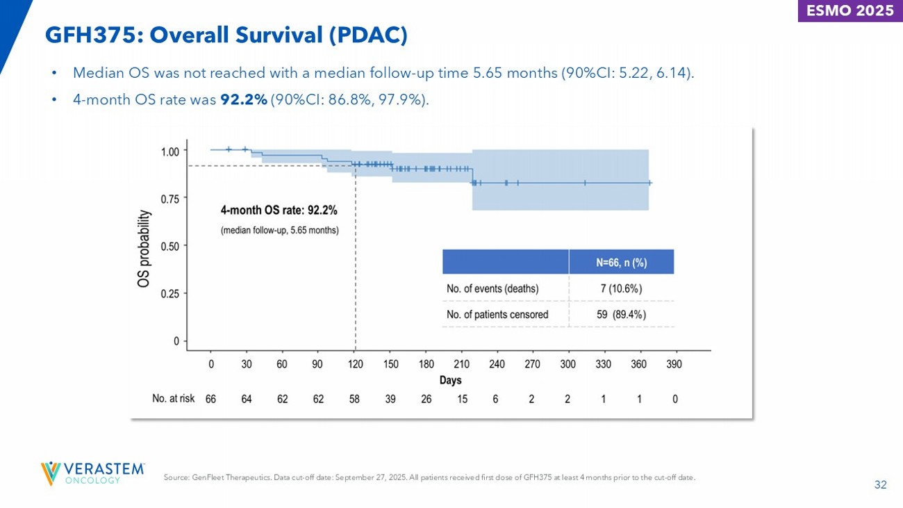 31 GFH375: Progression - Free Survival (PDAC) ESMO 2025 • Median PFS was 5.52 months ( 90%CI: 4.27, 7.20), with a median follow - up time 5.65 months ( 90%CI: 4.96, 6.08 ). • 4 - month PFS rate was 78.2% ( 90%CI: 69.8%, 87.5%). Source: GenFleet Therapeutics. Data cut - off date: September 27, 2025. All patients received first dose of GFH375 for at least 4 months prior to the cut - off date.