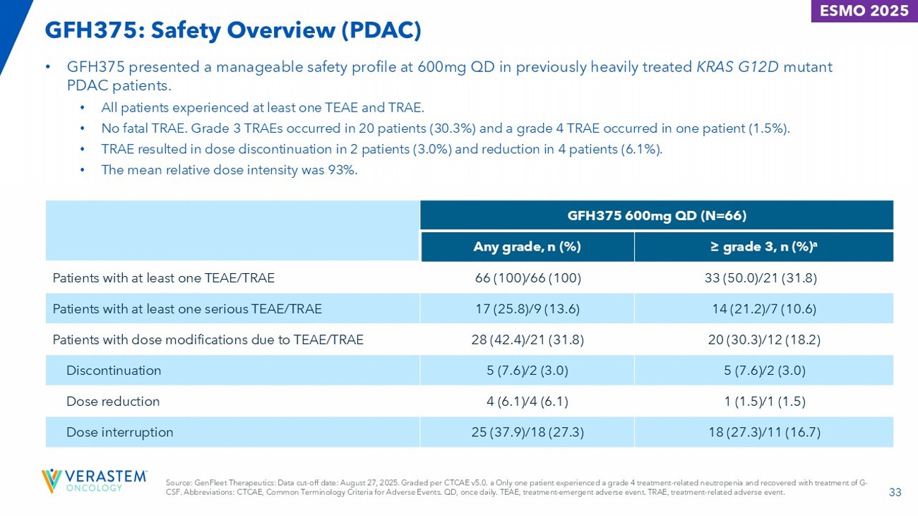 32 GFH375: Overall Survival (PDAC) ESMO 2025 • Median OS was not reached with a median follow - up time 5.65 months (90%CI: 5.22, 6.14). • 4 - month OS rate was 92.2% (90%CI: 86.8%, 97.9%). Source: GenFleet Therapeutics. Data cut - off date: September 27, 2025. All patients received first dose of GFH375 at least 4 months prior to the cut - off date.