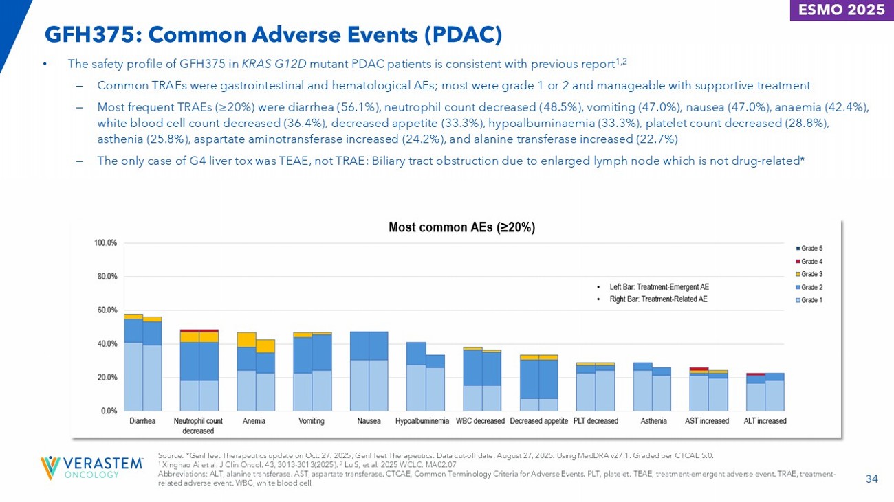 33 GFH375: Safety Overview (PDAC) • GFH375 presented a manageable safety profile at 600mg QD in previously heavily treated KRAS G12D mutant PDAC patients. • All patients experienced at least one TEAE and TRAE. • No fatal TRAE. Grade 3 TRAEs occurred in 20 patients (30.3%) and a grade 4 TRAE occurred in one patient (1.5%). • TRAE resulted in dose discontinuation in 2 patients (3.0%) and reduction in 4 patients (6.1%). • The mean relative dose intensity was 93%. GFH375 600mg QD (N=66) ≥ grade 3, n (%) a Any grade, n (%) 33 (50.0)/21 (31.8) a 66 (100)/66 (100) Patients with at least one TEAE/TRAE 14 (21.2)/7 (10.6) 17 (25.8)/9 (13.6) Patients with at least one serious TEAE/TRAE 20 (30.3)/12 (18.2) 28 (42.4)/21 (31.8) Patients with dose modifications due to TEAE/TRAE 5 (7.6)/2 (3.0) 5 (7.6)/2 (3.0) Discontinuation 1 (1.5)/1 (1.5) 4 (6.1)/4 (6.1) Dose reduction 18 (27.3)/11 (16.7) 25 (37.9)/18 (27.3) Dose interruption Source: GenFleet Therapeutics: Data cut - off date: August 27, 2025. Graded per CTCAE v5.0. a Only one patient experienced a grade 4 treatment - related neutropenia and recovered with treatment of G - CSF. Abbreviations: CTCAE, Common Terminology Criteria for Adverse Events. QD, once daily. TEAE, treatment - emergent adverse event. TRAE, treatment - related adverse event. ESMO 2025