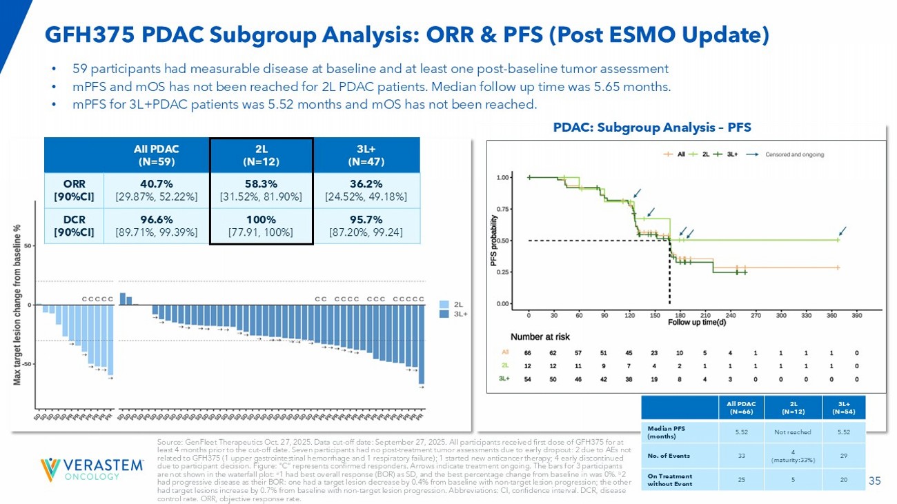 34 GFH375: Common Adverse Events (PDAC) ESMO 2025 • The safety profile of GFH375 in KRAS G12D mutant PDAC patients is consistent with previous report 1,2 – Common TRAEs were gastrointestinal and hematological AEs; most were grade 1 or 2 and manageable with supportive treatment – Most frequent TRAEs (≥20%) were diarrhea (56.1%), neutrophil count decreased (48.5%), vomiting (47.0%), nausea (47.0%), anaemia (42.4%), white blood cell count decreased (36.4%), decreased appetite (33.3%), hypoalbuminaemia (33.3%), platelet count decreased (28.8%), asthenia (25.8%), aspartate aminotransferase increased (24.2%), and alanine transferase increased (22.7%) – The only case of G4 liver tox was TEAE, not TRAE: Biliary tract obstruction due to enlarged lymph node which is not drug - related * Source: *GenFleet Therapeutics update on Oct. 27. 2025; GenFleet Therapeutics: Data cut - off date: August 27, 2025. Using MedDRA v27.1. Graded per CTCAE 5.0. 1 Xinghao Ai et al. J Clin Oncol. 43, 3013 - 3013(2025). 2 Lu S, et al. 2025 WCLC. MA02.07 Abbreviations: ALT, alanine transferase. AST, aspartate transferase. CTCAE, Common Terminology Criteria for Adverse Events. PLT, platelet. TEAE, treatment - emergent adverse event. TRAE, treatment - related adverse event. WBC, white blood cell.