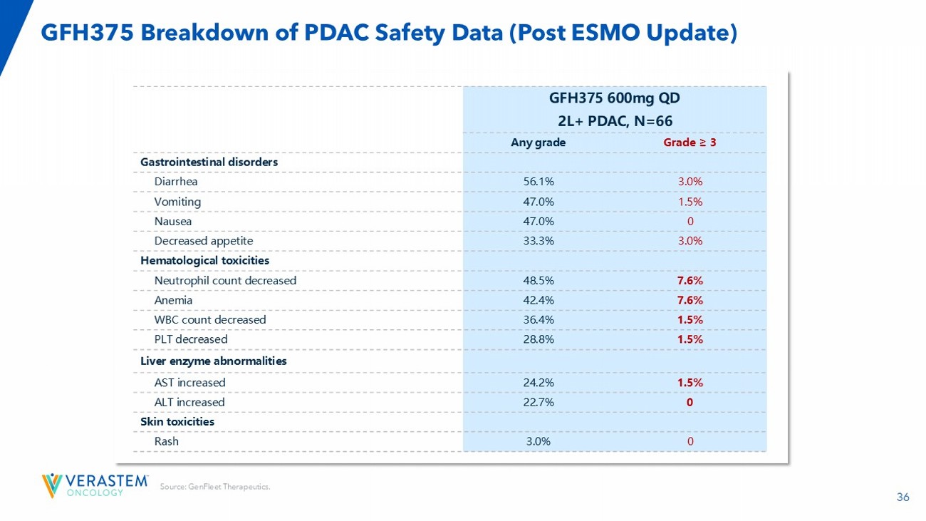 35 Source: GenFleet Therapeutics Oct. 27, 2025. Data cut - off date: September 27, 2025. All participants received first dose of GFH3 75 for at least 4 months prior to the cut - off date. Seven participants had no post - treatment tumor assessments due to early dropout: 2 due to AEs not related to GFH375 (1 upper gastrointestinal hemorrhage and 1 respiratory failure); 1 started new anticancer therapy; 4 early discontinued due to participant decision. Figure: "C“ represents confirmed responders. Arrows indicate treatment ongoing. The bars for 3 participants are not shown in the waterfall plot: a 1 had best overall response (BOR) as SD, and the best percentage change from baseline in was 0%. b 2 had progressive disease as their BOR: one had a target lesion decrease by 0.4% from baseline with non - target lesion progression; the other had target lesions increase by 0.7% from baseline with non - target lesion progression. Abbreviations: CI, confidence interval. DC R, disease control rate. ORR, objective response rate. GFH375 PDAC Subgroup Analysis: ORR & PFS (Post ESMO Update) • 59 participants had measurable disease at baseline and at least one post - baseline tumor assessment • mPFS and mOS has not been reached for 2L PDAC patients. Median follow up time was 5.65 months. • mPFS for 3L+PDAC patients was 5.52 months and mOS has not been reached. 3L+ (N=47) 2L (N=12) All PDAC (N=59) 36.2% [24.52%, 49.18%] 58.3% [31.52%, 81.90%] 40.7% [29.87%, 52.22%] ORR [90%CI] 95.7% [87.20%, 99.24] 100% [77.91, 100%] 96.6% [89.71%, 99.39%] DCR [90%CI] PDAC: Subgroup Analysis – PFS 3L+ (N=54) 2L (N=12) All PDAC (N=66) 5.52 Not reached 5.52 Median PFS (months) 29 4 (maturity:33%) 33 No. of Events 20 5 25 On Treatment without Event