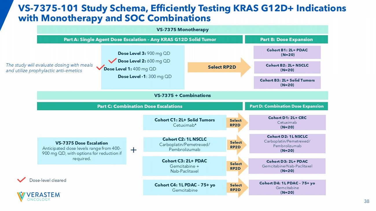 37 • Efficacious starting dose: • 400 mg QD starting dose supported by monotherapy efficacy/safety in FIH study • Evaluating GI side effect mitigations: • Use prophylactic anti - emetics • Evaluate dosing with and without food • Evaluate additional formulation • Multiple, high - value indication strategy: • Monotherapy expansion cohorts in PDAC & NSCLC • Combination cohorts with cetuximab for CRC, chemotherapy for PDAC, chemo plus I - O for NSCLC • Expand to geographies outside of U.S. Accelerated Development Approach Builds on Preliminary First - in - Human Study Findings Multi - Arm Clinical Study Evaluating Monotherapy and Combinations FDA Engagement Plans • Granted Fast Track Designation for: • First - line in patients with KRAS G12D locally advanced or metastatic PDAC • Patients with KRAS G12D locally advanced or mPDAC who received at least one prior line of standard systemic therapy in July 2025 • Plan to pursue Breakthrough Therapy Designation • Accelerated clinical development with FDA input