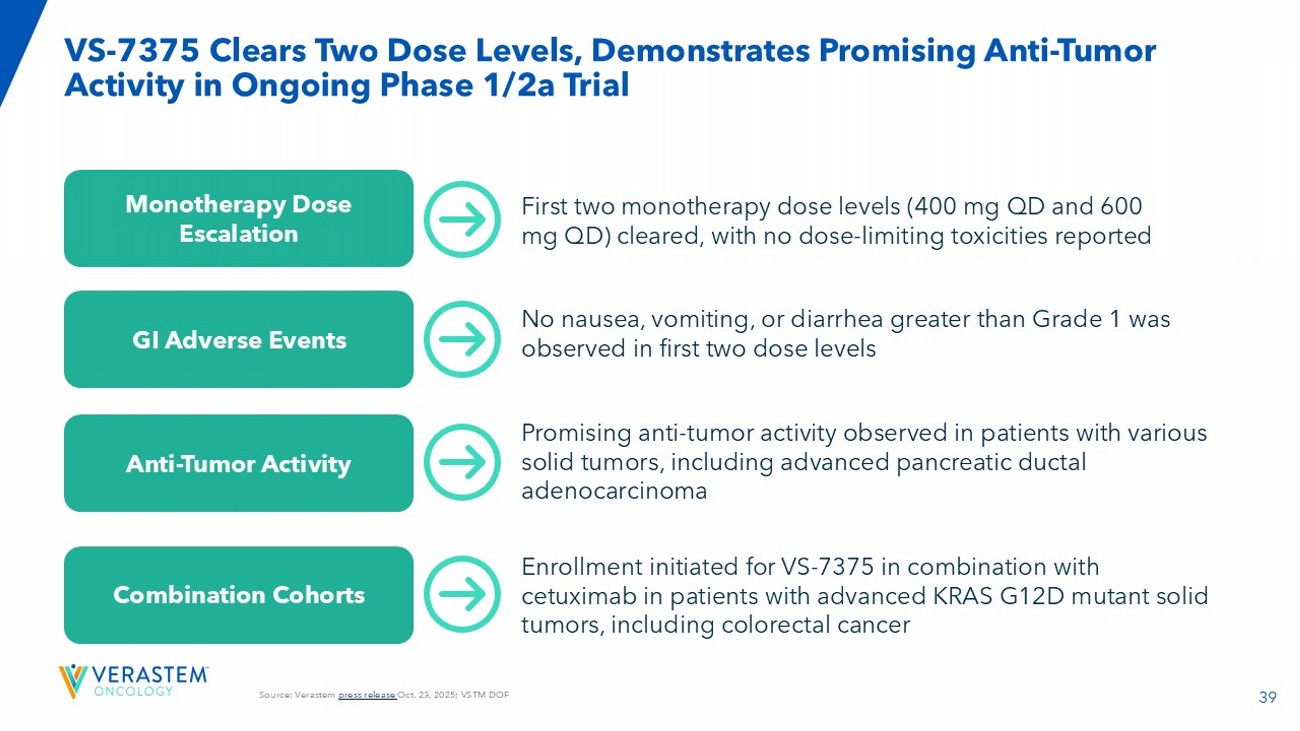 38 VS - 7375 - 101 Study Schema, Efficiently Testing KRAS G12D+ Indications with Monotherapy and SOC Combinations Part A: Single Agent Dose Escalation – Any KRAS G12D Solid Tumor Cohort B1: 2L+ PDAC (N=20) Cohort D1: 2L+ CRC Cetuximab (N=20) VS - 7375 + Combinations Part B: Dose Expansion Part C: Combination Dose Escalations Part D: Combination Dose Expansion Dose Level 3: 900 mg QD Dose Level 2: 600 mg QD Dose Level 1: 400 mg QD Dose Level - 1 : 300 mg QD Cohort B2: 2L+ NSCLC (N=20) Cohort B3: 2L+ Solid Tumors (N=20) VS - 7375 Dose Escalation Anticipated dose levels range from 400 - 900 mg QD, with options for reduction if required. + Cohort C1: 2L+ Solid Tumors Cetuximab* Cohort D2: 1L NSCLC Carboplatin/Pemetrexed/ Pembrolizumab (N=20) Select RP2D Select RP2D Cohort C3: 2L+ PDAC Gemcitabine + Nab - Paclitaxel Cohort D3: 2L+ PDAC Gemcitabine/Nab - Paclitaxel (N=20) Select RP2D Select RP2D Cohort C4: 1L PDAC – 75+ yo Gemcitabine Cohort D4: 1L PDAC – 75+ yo Gemcitabine (N=20) Select RP2D Cohort C2: 1L NSCLC Carboplatin/Pemetrexed/ Pembrolizumab The study will evaluate dosing with meals and utilize prophylactic anti - emetics Dose - level cleared VS - 7375 Monotherapy