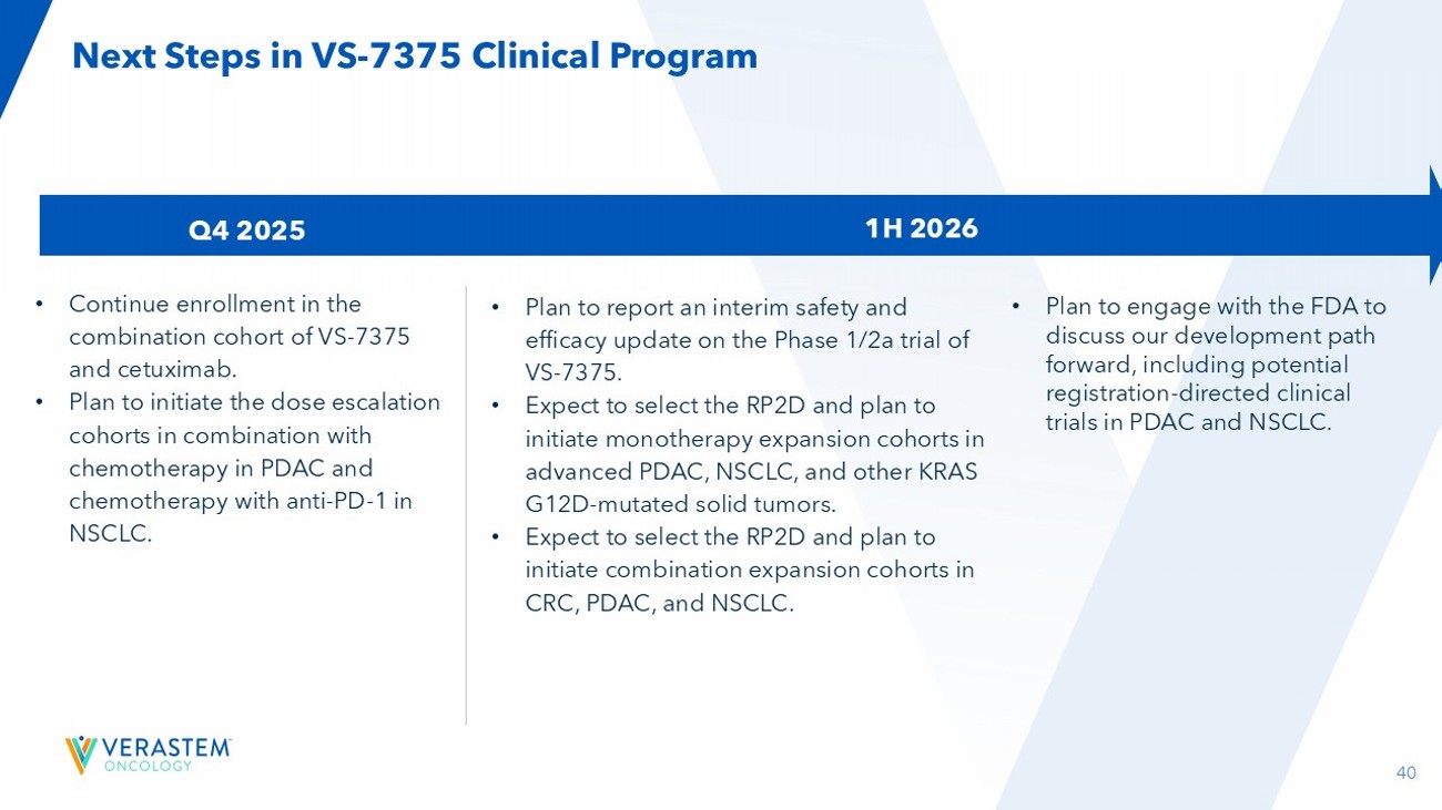 39 Source: Verastem press release Oct. 23, 2025; VSTM DOF VS - 7375 Clears Two Dose Levels, Demonstrates Promising Anti - Tumor Activity in Ongoing Phase 1/2a Trial Monotherapy Dose Escalation GI Adverse Events Combination Cohorts First two monotherapy dose levels (400 mg QD and 600 mg QD) cleared, with no dose - limiting toxicities reported No nausea, vomiting, or diarrhea greater than Grade 1 was observed in first two dose levels Enrollment initiated for VS - 7375 in combination with cetuximab in patients with advanced KRAS G12D mutant solid tumors, including colorectal cancer Anti - Tumor Activity Promising anti - tumor activity observed in patients with various solid tumors, including advanced pancreatic ductal adenocarcinoma