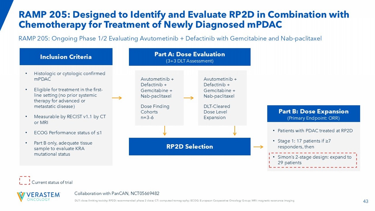43 DLT: dose - limiting toxicity; RP2D: recommended phase 2 dose; CT: computed tomography; ECOG: European Cooperative Oncology Group; MRI: magnetic resonance imaging RAMP 205: Designed to Identify and Evaluate RP2D in Combination with Chemotherapy for Treatment of Newly Diagnosed mPDAC RAMP 205: Ongoing Phase 1/2 Evaluating Avutometinib + Defactinib with Gemcitabine and Nab - paclitaxel Inclusion Criteria • Histologic or cytologic confirmed mPDAC • Eligible for treatment in the first - line setting (no prior systemic therapy for advanced or metastatic disease) • Measurable by RECIST v1.1 by CT or MRI • ECOG Performance status of ≤1 • Part B only, adequate tissue sample to evaluate KRA mutational status Collaboration with PanCAN , NCT05669482 ​ Part A: Dose Evaluation (3+3 DLT Assessment) RP2D Selection Part B: Dose Expansion (Primary Endpoint: ORR) Avutometinib + Defactinib + Gemcitabine + Nab - paclitaxel Dose Finding Cohorts n=3 - 6 Avutometinib + Defactinib + Gemcitabine + Nab - paclitaxel DLT - Cleared Dose Level Expansion • Patients with PDAC treated at RP2D • Stage 1: 17 patients if ≥7 responders, then • Simon’s 2 - stage design: expand to 29 patients Current status of trial