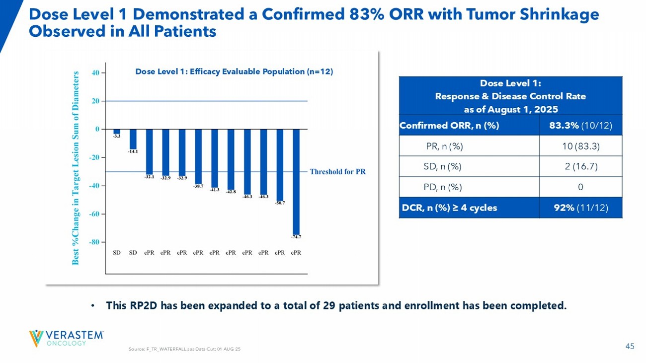 44 Updated 05/01/25 Enrolled N=60 Days Chemo Dosing Nab - Paclitaxel Gemcitabine Defactinib Avutometinib Dose Level 12 1 - 8 - 15 125 800 200 2.4 1 12 1 - 8 - 15 100 800 200 3.2 0 12 1 - 8 - 15 100 800 200 2.4 - 1 12 1 - 15 125 800 200 3.2 1a 12 1 - 15 125 1000 200 3.2 2a PART A Enrollment Summary Dose Levels & Administration Schedule (28 - day) Cycle RAMP 205: 12 Patients Enrolled in Each Dose Cohort • Enrolled: (n=60) • Treatment Ongoing: (n=19) • Ended Study: (n=30) • Survival Follow Up: (n=11) Dose level 1 selected as the RP2D