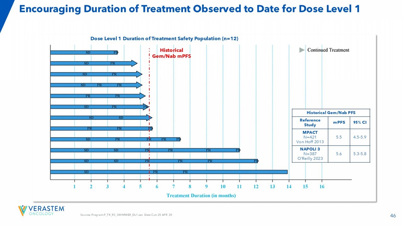 46 Source: Program:F_TX_RS_SWIMMER_DL1.sas Data Cut: 25 APR 25 Encouraging Duration of Treatment Observed to Date for Dose Level 1 Dose Level 1 Duration of Treatment Safety Population (n=12) Historical Gem/Nab PFS 95% CI mPFS Reference Study 4.5 - 5.9 5.5 MPACT N=421 Von Hoff 2013 5.3 - 5.8 5.6 NAPOLI 3 N=387 O’Reilly 2023 Historical Gem/Nab mPFS