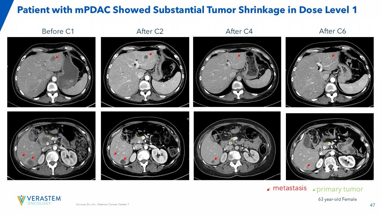 47 Source: Dr. Lim, Siteman Cancer Center 7 Patient with mPDAC Showed Substantial Tumor Shrinkage in Dose Level 1 Before C1 After C2 After C4 After C6 metastasis primary tumor 63 year - old Female