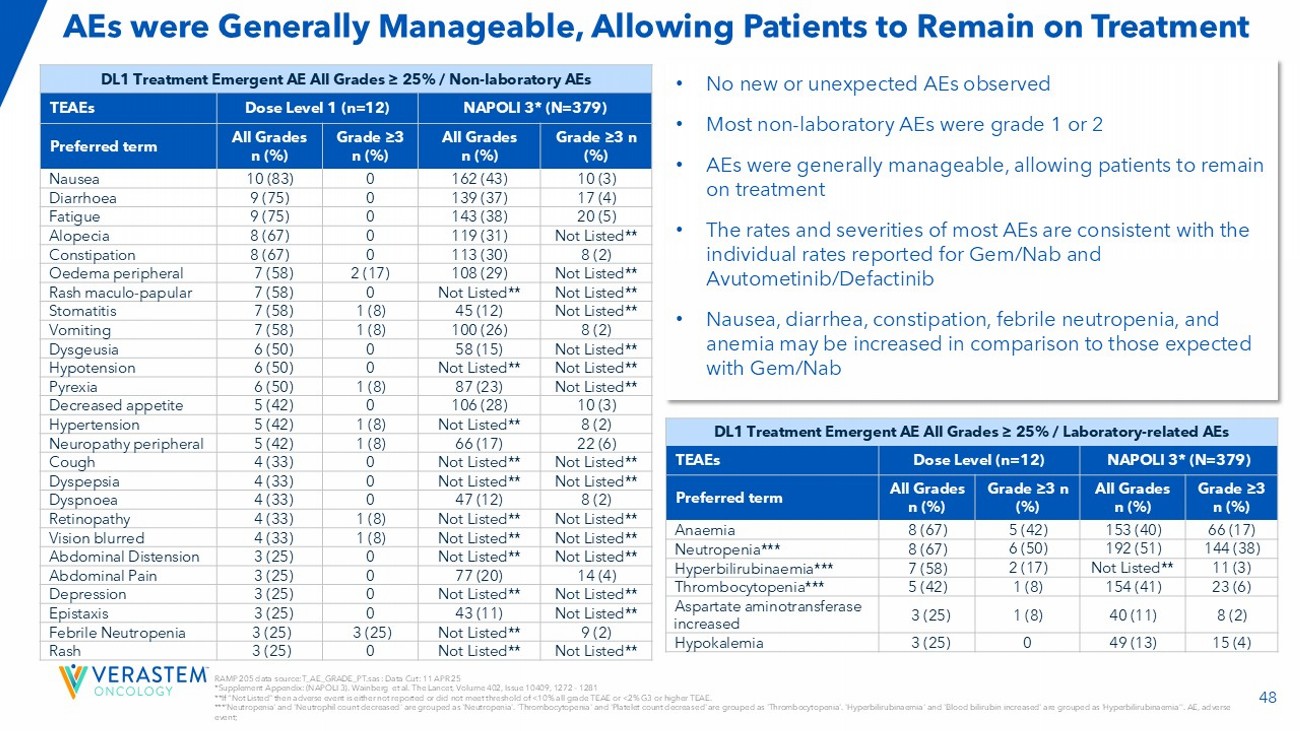 48 AEs were Generally Manageable, Allowing Patients to Remain on Treatment DL1 Treatment Emergent AE All Grades ≥ 25% / Non - laboratory AEs NAPOLI 3* (N=379) Dose Level 1 (n=12) TEAEs Grade ≥3 n (%) All Grades n (%) Grade ≥3 n (%) All Grades n (%) Preferred term 10 (3) 162 (43) 0 10 (83) Nausea 17 (4) 139 (37) 0 9 (75) Diarrhoea 20 (5) 143 (38) 0 9 (75) Fatigue Not Listed** 119 (31) 0 8 (67) Alopecia 8 (2) 113 (30) 0 8 (67) Constipation Not Listed** 108 (29) 2 (17) 7 (58) Oedema peripheral Not Listed** Not Listed** 0 7 (58) Rash maculo - papular Not Listed** 45 (12) 1 (8) 7 (58) Stomatitis 8 (2) 100 (26) 1 (8) 7 (58) Vomiting Not Listed** 58 (15) 0 6 (50) Dysgeusia Not Listed** Not Listed** 0 6 (50) Hypotension Not Listed** 87 (23) 1 (8) 6 (50) Pyrexia 10 (3) 106 (28) 0 5 (42) Decreased appetite 8 (2) Not Listed** 1 (8) 5 (42) Hypertension 22 (6) 66 (17) 1 (8) 5 (42) Neuropathy peripheral Not Listed** Not Listed** 0 4 (33) Cough Not Listed** Not Listed** 0 4 (33) Dyspepsia 8 (2) 47 (12) 0 4 (33) Dyspnoea Not Listed** Not Listed** 1 (8) 4 (33) Retinopathy Not Listed** Not Listed** 1 (8) 4 (33) Vision blurred Not Listed** Not Listed** 0 3 (25) Abdominal Distension 14 (4) 77 (20) 0 3 (25) Abdominal Pain Not Listed** Not Listed** 0 3 (25) Depression Not Listed** 43 (11) 0 3 (25) Epistaxis 9 (2) Not Listed** 3 (25) 3 (25) Febrile Neutropenia Not Listed** Not Listed** 0 3 (25) Rash • No new or unexpected AEs observed • Most non - laboratory AEs were grade 1 or 2 • AEs were generally manageable, allowing patients to remain on treatment • The rates and severities of most AEs are consistent with the individual rates reported for Gem/Nab and Avutometinib/Defactinib • Nausea, diarrhea, constipation, febrile neutropenia, and anemia may be increased in comparison to those expected with Gem/Nab DL1 Treatment Emergent AE All Grades ≥ 25% / Laboratory - related AEs NAPOLI 3* (N=379) Dose Level (n=12) TEAEs Grade ≥3 n (%) All Grades n (%) Grade ≥3 n (%) All Grades n (%) Preferred term 66 (17) 153 (40) 5 (42) 8 (67) Anaemia 144 (38) 192 (51) 6 (50) 8 (67) Neutropenia*** 11 (3) Not Listed** 2 (17) 7 (58) Hyperbilirubinaemia*** 23 (6) 154 (41) 1 (8) 5 (42) Thrombocytopenia*** 8 (2) 40 (11) 1 (8) 3 (25) Aspartate aminotransferase increased 15 (4) 49 (13) 0 3 (25) Hypokalemia RAMP 205 data source:T_AE_GRADE_PT.sas : Data Cut: 11 APR 25 *Supplement Appendix: (NAPOLI 3). Wainberg et al. The Lancet, Volume 402, Issue 10409, 1272 – 1281 **If “Not Listed” then adverse event is either not reported or did not meet threshold of <10% all grade TEAE or <2% G3 or hig her TEAE. * **'Neutropenia' and 'Neutrophil count decreased' are grouped as 'Neutropenia'. 'Thrombocytopenia' and 'Platelet count decreas ed' are grouped as 'Thrombocytopenia'. ' Hyperbilirubinaemia ' and 'Blood bilirubin increased' are grouped as ' Hyperbilirubinaemia ’’. AE, adverse event;