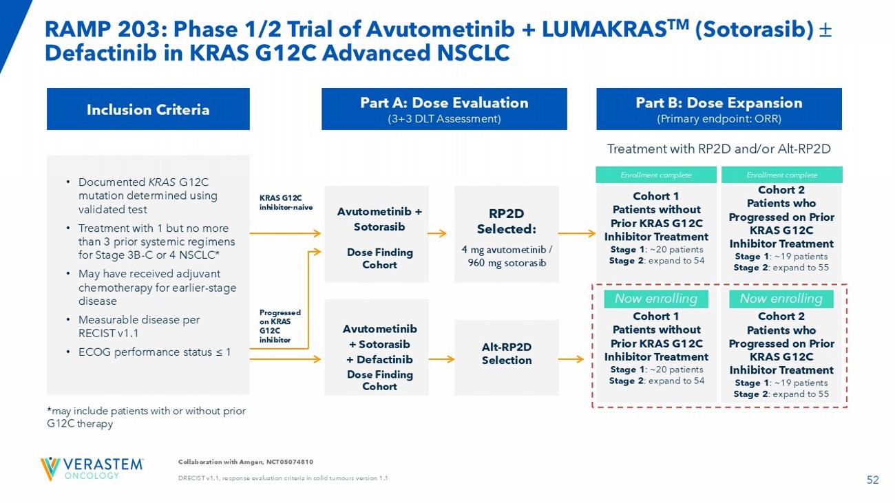51 Collaboration Verastem & Mariano Barbacid , CNIO (Spain) Addition of FAK inhibitor Augments the Efficacy of Sotorasib + Avutometinib and Reverses Sotorasib Resistance in KRAS G12C NSCLC Preclinical Models AVUTOMETINIB ENHANCES SOTORASIB EFFICACY. ADDITION OF FAK INHIBITOR INDUCES DEEP TUMOR REGRESSIONS IN ALL TREATED MICE ADDITION OF FAKi + AVUTOMETINIB REVERSES SOTORASIB RESISTANCE ADDITION OF AVUTOMETINIB IS INSUFFICIENT TO REVERSE SOTORASIB RESISTANCE -100 0 100 200 300 400 Response at Day 10 R e s p o n s e @ D a y 1 0 ( % c h a n g e f r o m b a s e l i n e ) v e h i c l e 10 PR a v u t o m e t i n i b F A K i s o t o r a s i b s o t o r a s i b + a v u t o m e t i n i b s o t o r a s i b + F A K i s o t o r a s i b + a v u t o m e t i n i b + F A K i 2 SD 1 SD1 SD 8 SD 2 PR 4 SD 3 PR Doses Tested Sotorasib : 30 mg/kg PO QD Avutometinib : 0.3 mg/kg PO QD FAKi : 50 mg/kg PO BID H2122 KRAS G12C NSCLC 0 50 100 150 0 5 10 15 20 25 Days after first sotorasib dose T u m o r v o l u m e ( m m 3 ) Sotorasib + Avutometinib + FAKiSotorasib 0 50 100 150 0 5 10 15 20 25 Days after first sotorasib dose T u m o r v o l u m e ( m m 3 ) Sotorasib + Avutometinib Sotorasib Mouse #1 Mouse #2 Mouse #3 Mouse #4