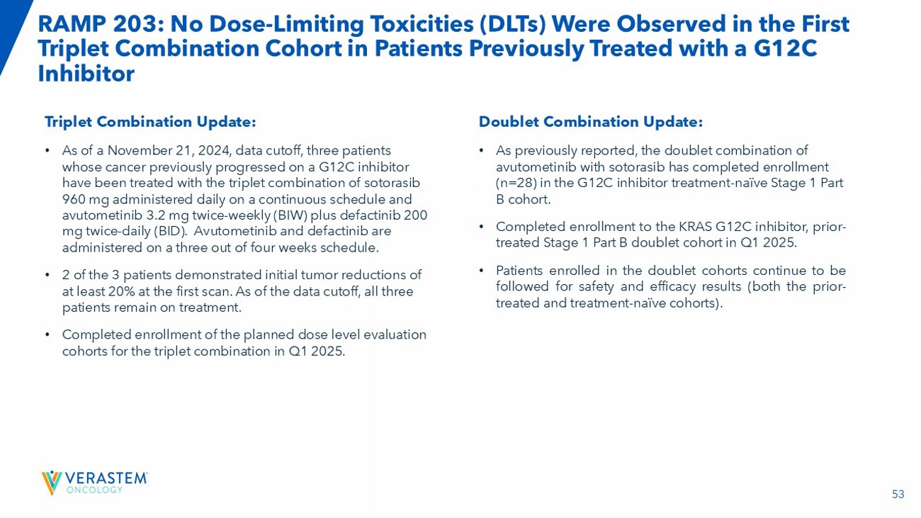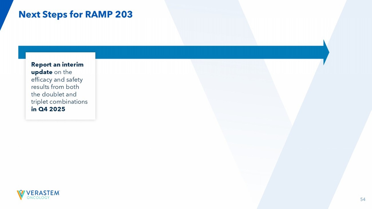53 RAMP 203: No Dose - Limiting Toxicities (DLTs) Were Observed in the First Triplet Combination Cohort in Patients Previously Treated with a G12C Inhibitor Triplet Combination Update: • As of a November 21, 2024, data cutoff, three patients whose cancer previously progressed on a G12C inhibitor have been treated with the triplet combination of sotorasib 960 mg administered daily on a continuous schedule and avutometinib 3.2 mg twice - weekly (BIW) plus defactinib 200 mg twice - daily (BID). Avutometinib and defactinib are administered on a three out of four weeks schedule. ​ • 2 of the 3 patients demonstrated initial tumor reductions of at least 20% at the first scan. As of the data cutoff, all three patients remain on treatment. ​ • Completed enrollment of the planned dose level evaluation cohorts for the triplet combination in Q1 2025. Doublet Combination Update: • As previously reported, the doublet combination of avutometinib with sotorasib has completed enrollment (n=28) in the G12C inhibitor treatment - naïve Stage 1 Part B cohort. ​ • Completed enrollment to the KRAS G 12 C inhibitor, prior - treated Stage 1 Part B doublet cohort in Q 1 2025 . • Patients enrolled in the doublet cohorts continue to be followed for safety and efficacy results (both the prior - treated and treatment - naïve cohorts) .