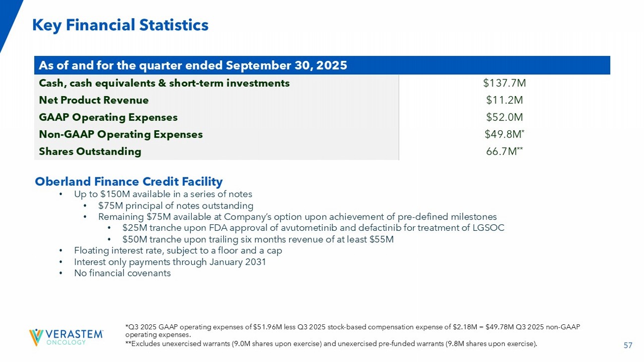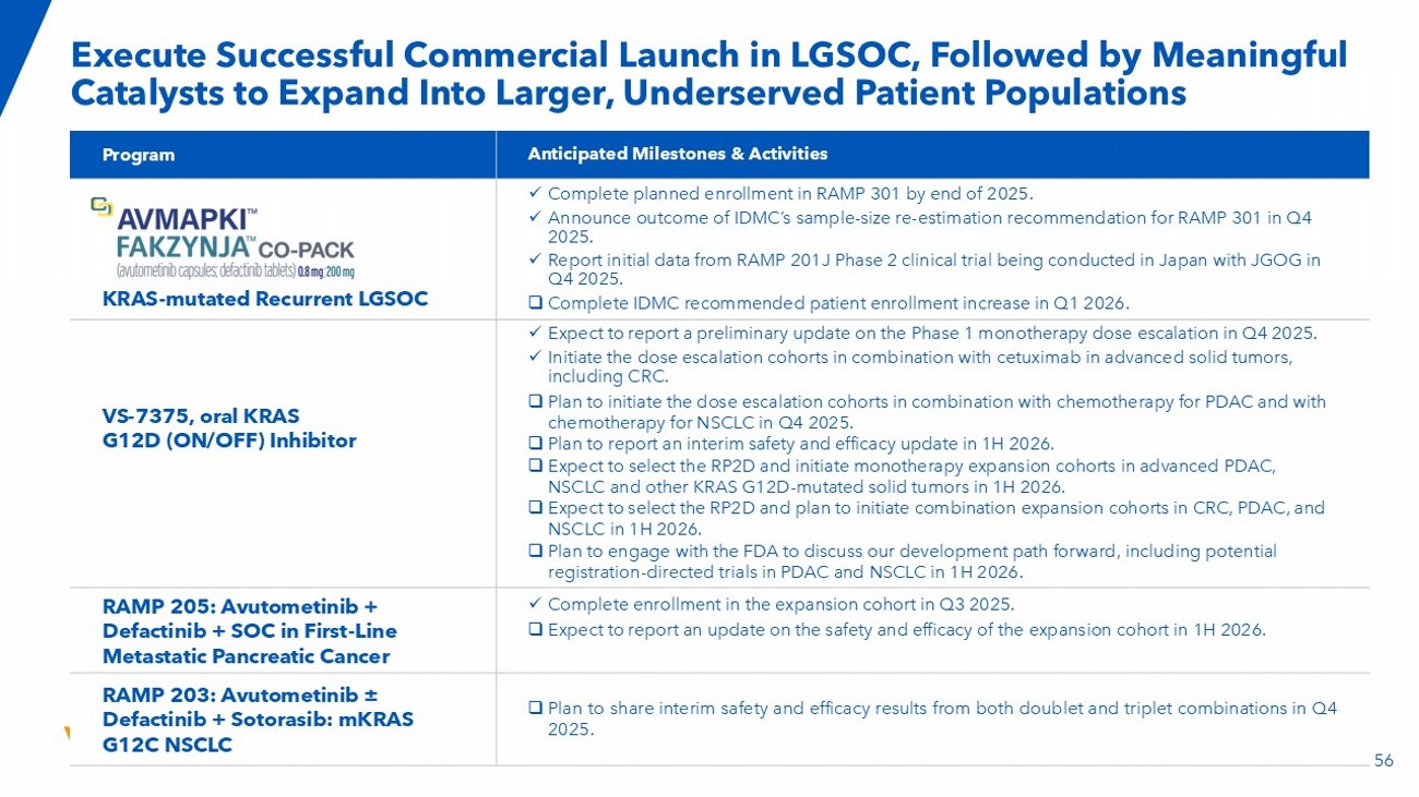 56 Execute Successful Commercial Launch in LGSOC, Followed by Meaningful Catalysts to Expand Into Larger, Underserved Patient Populations Anticipated Milestones & Activities Program x Complete planned enrollment in RAMP 301 by end of 2025. x Announce outcome of IDMC’s sample - size re - estimation recommendation for RAMP 301 in Q4 2025. x Report initial data from RAMP 201J Phase 2 clinical trial being conducted in Japan with JGOG in Q4 2025. □ Complete IDMC recommended patient enrollment increase in Q1 2026 . KRAS - mutated Recurrent LGSOC x Expect to report a preliminary update on the Phase 1 monotherapy dose escalation in Q4 2025. x Initiate the dose escalation cohorts in combination with cetuximab in advanced solid tumors, including CRC. □ Plan to initiate the dose escalation cohorts in combination with chemotherapy for PDAC and with chemotherapy for NSCLC in Q4 2025. □ Plan to report an interim safety and efficacy update in 1H 2026. □ Expect to select the RP2D and i nitiate monotherapy expansion cohorts in advanced PDAC, NSCLC and other KRAS G12D - mutated solid tumors in 1H 2026. □ Expect to select the RP2D and plan to initiate combination expansion cohorts in CRC, PDAC, and NSCLC in 1H 2026. □ Plan to engage with the FDA to discuss our development path forward ​ , including potential registration - directed trials in PDAC and NSCLC in 1H 2026 . x Complete enrollment in the expansion cohort in Q3 2025. □ Expect to report an update on the safety and efficacy of the expansion cohort in 1H 2026. RAMP 205: Avutometinib + Defactinib + SOC in First - Line Metastatic Pancreatic Cancer □ Plan to share interim safety and efficacy results from both doublet and triplet combinations in Q 4 2025 . RAMP 203: Avutometinib ± Defactinib + Sotorasib: mKRAS G12C NSCLC VS - 7375, oral KRAS G12D (ON/OFF) Inhibitor