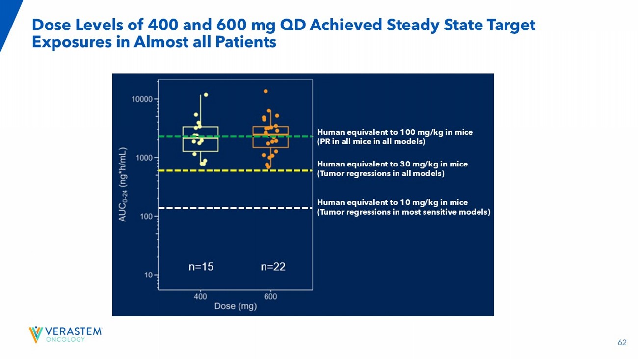 62 Dose Levels of 400 and 600 mg QD Achieved Steady State Target Exposures in Almost all Patients Human equivalent to 100 mg/kg in mice (PR in all mice in all models) Human equivalent to 30 mg/kg in mice (Tumor regressions in all models) Human equivalent to 10 mg/kg in mice (Tumor regressions in most sensitive models)