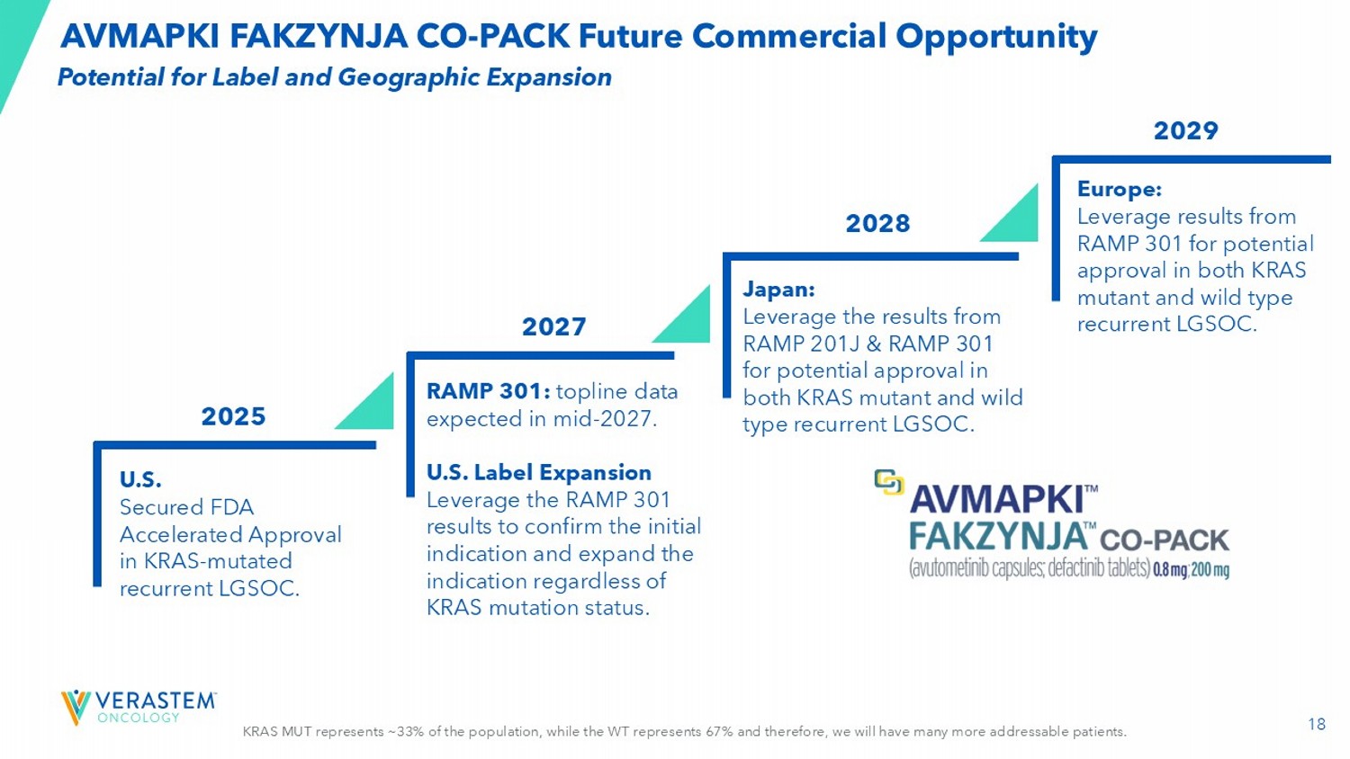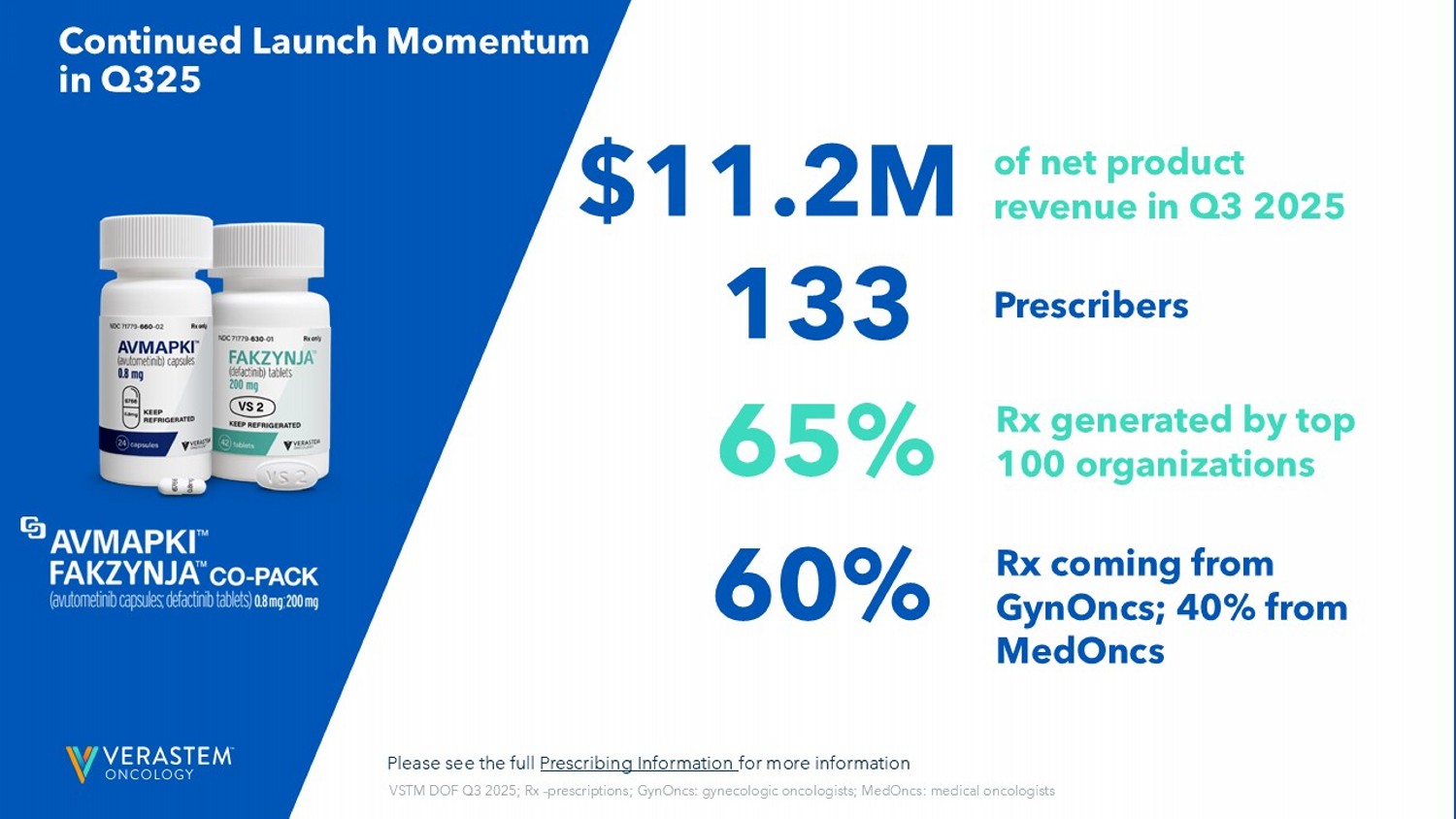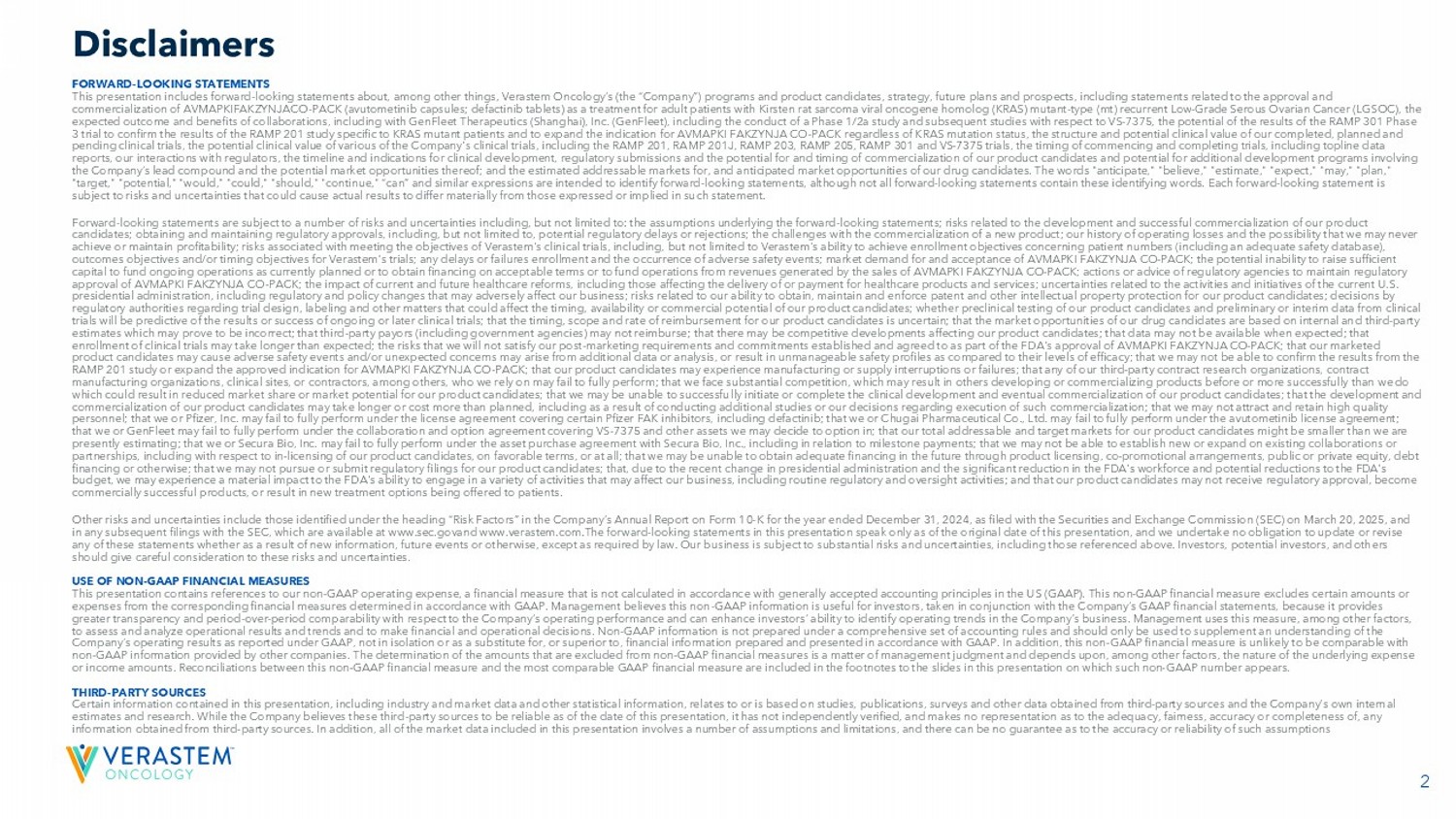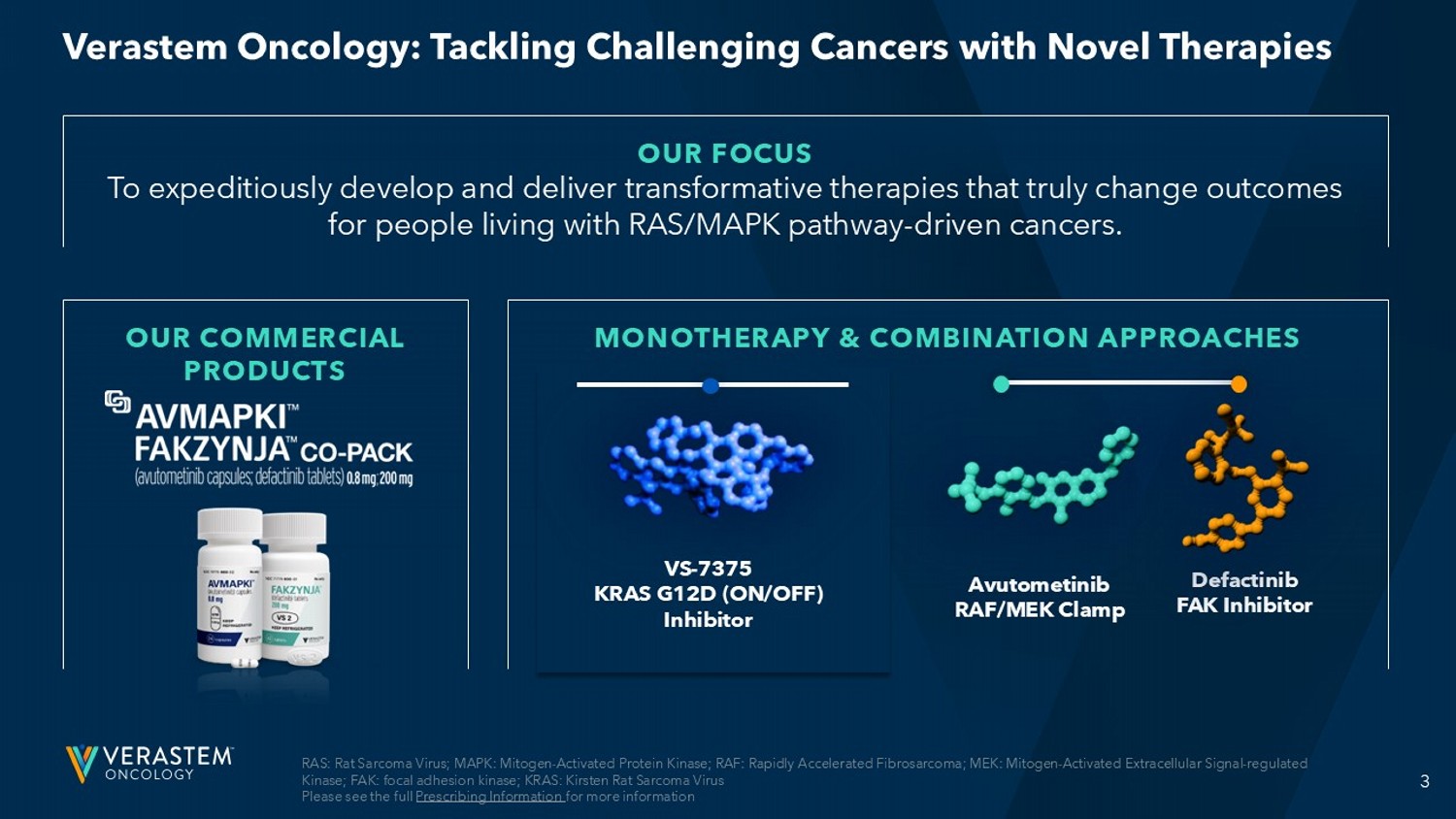 2 FORWARD - LOOKING STATEMENTS This presentation includes forward - looking statements about, among other things, Verastem Oncology’s (the “Company”) programs an d product candidates, strategy, future plans and prospects, including statements related to the approval and commercialization of AVMAPKIFAKZYNJACO - PACK (avutometinib capsules; defactinib tablets) as a treatment for adult patients with K irsten rat sarcoma viral oncogene homolog (KRAS) mutant - type (mt) recurrent Low - Grade Serous Ovarian Cancer (LGSOC), the expected outcome and benefits of collaborations, including with GenFleet Therapeutics (Shanghai), Inc. (GenFleet), including the conduct of a Phase 1/2a study and subsequent studies with respect to VS - 7375, the potential of the results of the RAMP 301 Phas e 3 trial to confirm the results of the RAMP 201 study specific to KRAS mutant patients and to expand the indication for AVMAPK I F AKZYNJA CO - PACK regardless of KRAS mutation status, the structure and potential clinical value of our completed, planned and pending clinical trials, the potential clinical value of various of the Company's clinical trials, including the RAMP 201, RA MP 201J, RAMP 203, RAMP 205, RAMP 301 and VS - 7375 trials, the timing of commencing and completing trials, including topline data reports, our interactions with regulators, the timeline and indications for clinical development, regulatory submissions and the potential for and timing of commercialization of our product candidates and potential for additional development programs inv ol ving the Company’s lead compound and the potential market opportunities thereof; and the estimated addressable markets for, and an tic ipated market opportunities of our drug candidates. The words "anticipate," "believe," "estimate," "expect," "may," "plan," "target," "potential," "would," "could," "should," "continue," “can” and similar expressions are intended to identify forward - lo oking statements, although not all forward - looking statements contain these identifying words. Each forward - looking statement is subject to risks and uncertainties that could cause actual results to differ materially from those expressed or implied in su ch statement. Forward - looking statements are subject to a number of risks and uncertainties including, but not limited to: the assumptions und erlying the forward - looking statements; risks related to the development and successful commercialization of our product candidates; obtaining and maintaining regulatory approvals, including, but not limited to, potential regulatory delays or rej ect ions; the challenges with the commercialization of a new product; our history of operating losses and the possibility that we ma y never achieve or maintain profitability; risks associated with meeting the objectives of Verastem's clinical trials, including, but no t limited to Verastem's ability to achieve enrollment objectives concerning patient numbers (including an adequate safety dat aba se), outcomes objectives and/or timing objectives for Verastem's trials; any delays or failures enrollment and the occurrence of a dve rse safety events; market demand for and acceptance of AVMAPKI FAKZYNJA CO - PACK; the potential inability to raise sufficient capital to fund ongoing operations as currently planned or to obtain financing on acceptable terms or to fund operations from re venues generated by the sales of AVMAPKI FAKZYNJA CO - PACK; actions or advice of regulatory agencies to maintain regulatory approval of AVMAPKI FAKZYNJA CO - PACK; the impact of current and future healthcare reforms, including those affecting the deliver y of or payment for healthcare products and services; uncertainties related to the activities and initiatives of the current U.S . presidential administration, including regulatory and policy changes that may adversely affect our business; risks related to ou r ability to obtain, maintain and enforce patent and other intellectual property protection for our product candidates; decis ion s by regulatory authorities regarding trial design, labeling and other matters that could affect the timing, availability or comme rci al potential of our product candidates; whether preclinical testing of our product candidates and preliminary or interim data fr om clinical trials will be predictive of the results or success of ongoing or later clinical trials; that the timing, scope and rate of r eim bursement for our product candidates is uncertain; that the market opportunities of our drug candidates are based on internal an d third - party estimates which may prove to be incorrect; that third - party payors (including government agencies) may not reimburse; that there may be competitive developments affecting our product candidates; that data may not be available when expected; that enrollment of clinical trials may take longer than expected; the risks that we will not satisfy our post - marketing requirements and commitments established and agreed to as part of the FDA's approval of AVMAPKI FAKZYNJA CO - PACK; that our marketed product candidates may cause adverse safety events and/or unexpected concerns may arise from additional data or analysis, or res ult in unmanageable safety profiles as compared to their levels of efficacy; that we may not be able to confirm the results f rom the RAMP 201 study or expand the approved indication for AVMAPKI FAKZYNJA CO - PACK; that our product candidates may experience manufa cturing or supply interruptions or failures; that any of our third - party contract research organizations, contract manufacturing organizations, clinical sites, or contractors, among others, who we rely on may fail to fully perform; that we fac e substantial competition, which may result in others developing or commercializing products before or more successfully than we do which could result in reduced market share or market potential for our product candidates; that we may be unable to successfu 