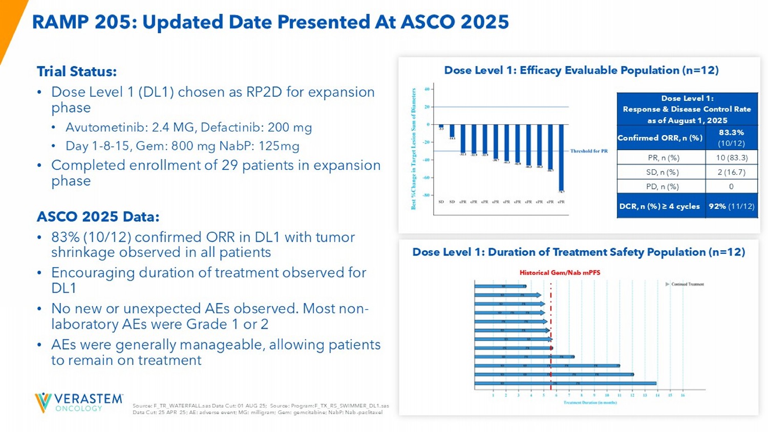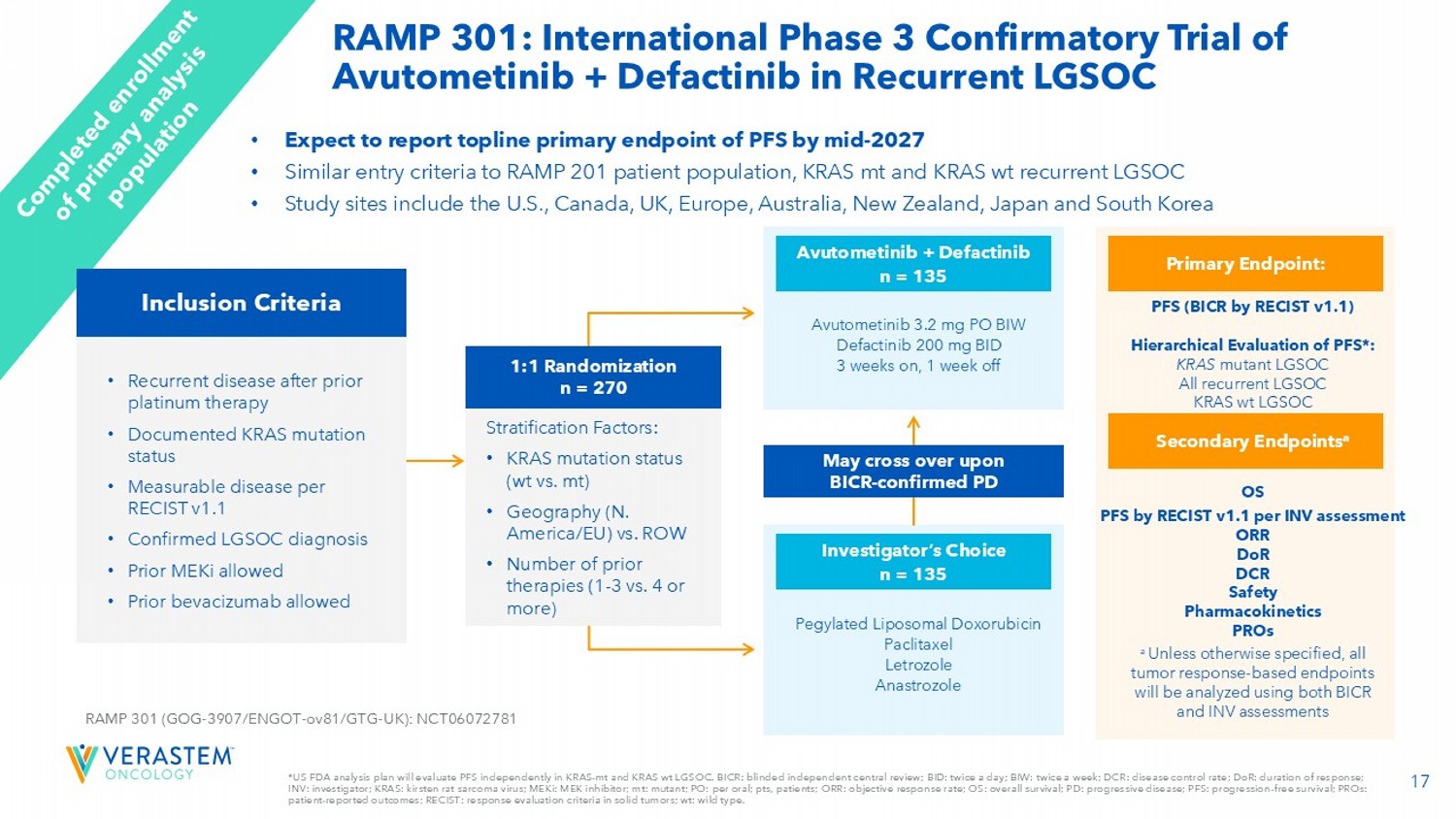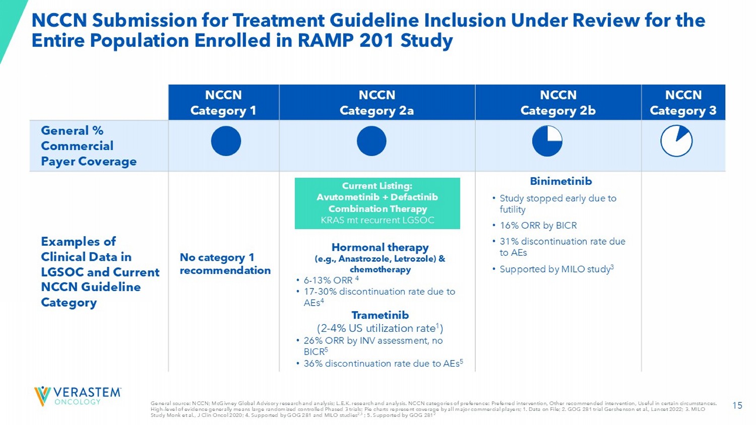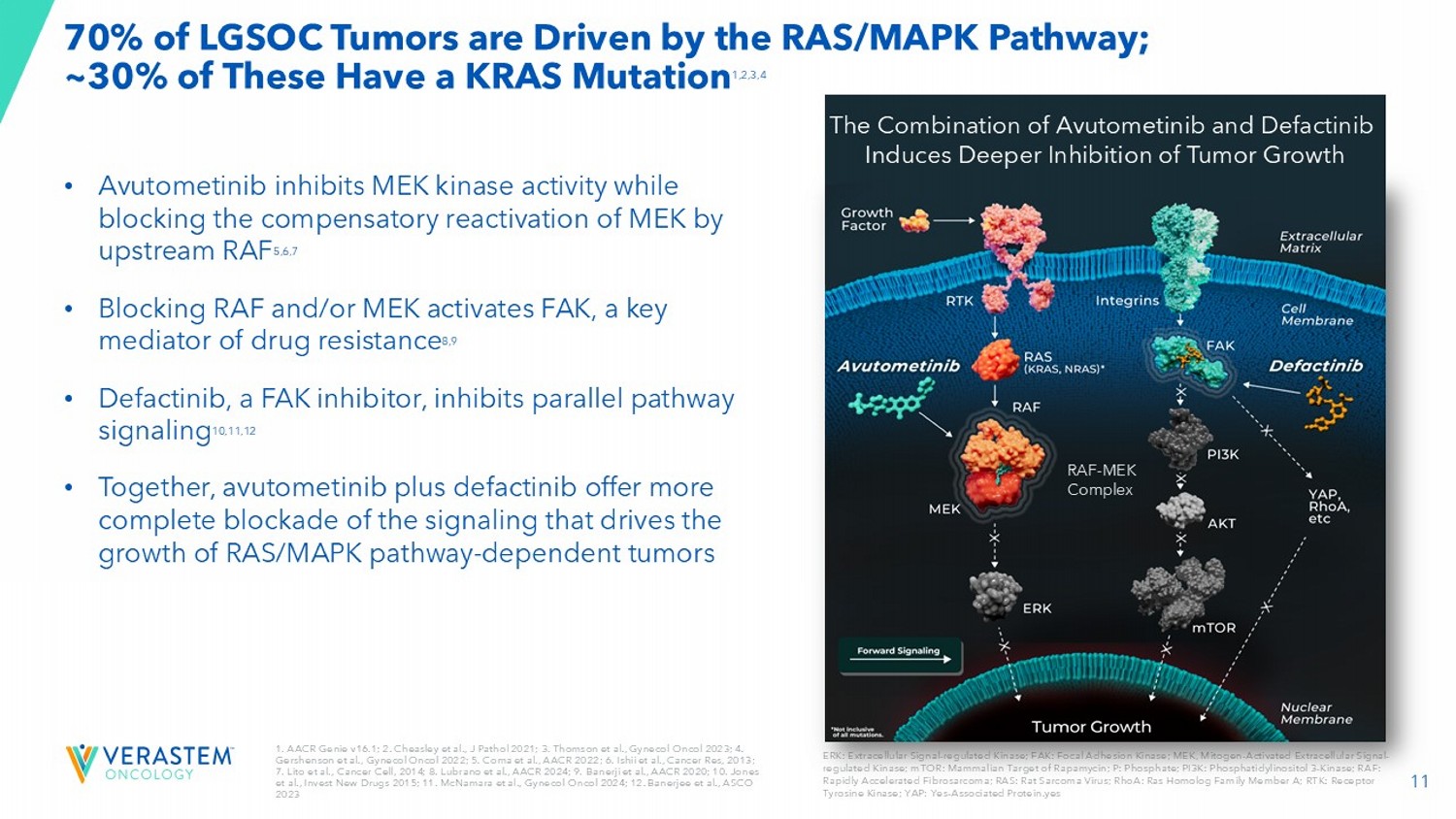 2 FORWARD - LOOKING STATEMENTS This presentation includes forward - looking statements about, among other things, Verastem Oncology’s (the “Company”) programs an d product candidates, strategy, future plans and prospects, including statements related to the approval and commercialization of AVMAPKIFAKZYNJACO - PACK (avutometinib capsules; defactinib tablets) as a treatment for adult patients with K irsten rat sarcoma viral oncogene homolog (KRAS) mutant - type (mt) recurrent Low - Grade Serous Ovarian Cancer (LGSOC), the expected outcome and benefits of collaborations, including with GenFleet Therapeutics (Shanghai), Inc. (GenFleet), including the conduct of a Phase 1/2a study and subsequent studies with respect to VS - 7375, the potential of the results of the RAMP 301 Phas e 3 trial to confirm the results of the RAMP 201 study specific to KRAS mutant patients and to expand the indication for AVMAPK I F AKZYNJA CO - PACK regardless of KRAS mutation status, the structure and potential clinical value of our completed, planned and pending clinical trials, the potential clinical value of various of the Company's clinical trials, including the RAMP 201, RA MP 201J, RAMP 203, RAMP 205, RAMP 301 and VS - 7375 trials, the timing of commencing and completing trials, including topline data reports, our interactions with regulators, the timeline and indications for clinical development, regulatory submissions and the potential for and timing of commercialization of our product candidates and potential for additional development programs inv ol ving the Company’s lead compound and the potential market opportunities thereof; and the estimated addressable markets for, and an tic ipated market opportunities of our drug candidates. The words "anticipate," "believe," "estimate," "expect," "may," "plan," "target," "potential," "would," "could," "should," "continue," “can” and similar expressions are intended to identify forward - lo oking statements, although not all forward - looking statements contain these identifying words. Each forward - looking statement is subject to risks and uncertainties that could cause actual results to differ materially from those expressed or implied in su ch statement. Forward - looking statements are subject to a number of risks and uncertainties including, but not limited to: the assumptions und erlying the forward - looking statements; risks related to the development and successful commercialization of our product candidates; obtaining and maintaining regulatory approvals, including, but not limited to, potential regulatory delays or rej ect ions; the challenges with the commercialization of a new product; our history of operating losses and the possibility that we ma y never achieve or maintain profitability; risks associated with meeting the objectives of Verastem's clinical trials, including, but no t limited to Verastem's ability to achieve enrollment objectives concerning patient numbers (including an adequate safety dat aba se), outcomes objectives and/or timing objectives for Verastem's trials; any delays or failures enrollment and the occurrence of a dve rse safety events; market demand for and acceptance of AVMAPKI FAKZYNJA CO - PACK; the potential inability to raise sufficient capital to fund ongoing operations as currently planned or to obtain financing on acceptable terms or to fund operations from re venues generated by the sales of AVMAPKI FAKZYNJA CO - PACK; actions or advice of regulatory agencies to maintain regulatory approval of AVMAPKI FAKZYNJA CO - PACK; the impact of current and future healthcare reforms, including those affecting the deliver y of or payment for healthcare products and services; uncertainties related to the activities and initiatives of the current U.S . presidential administration, including regulatory and policy changes that may adversely affect our business; risks related to ou r ability to obtain, maintain and enforce patent and other intellectual property protection for our product candidates; decis ion s by regulatory authorities regarding trial design, labeling and other matters that could affect the timing, availability or comme rci al potential of our product candidates; whether preclinical testing of our product candidates and preliminary or interim data fr om clinical trials will be predictive of the results or success of ongoing or later clinical trials; that the timing, scope and rate of r eim bursement for our product candidates is uncertain; that the market opportunities of our drug candidates are based on internal an d third - party estimates which may prove to be incorrect; that third - party payors (including government agencies) may not reimburse; that there may be competitive developments affecting our product candidates; that data may not be available when expected; that enrollment of clinical trials may take longer than expected; the risks that we will not satisfy our post - marketing requirements and commitments established and agreed to as part of the FDA's approval of AVMAPKI FAKZYNJA CO - PACK; that our marketed product candidates may cause adverse safety events and/or unexpected concerns may arise from additional data or analysis, or res ult in unmanageable safety profiles as compared to their levels of efficacy; that we may not be able to confirm the results f rom the RAMP 201 study or expand the approved indication for AVMAPKI FAKZYNJA CO - PACK; that our product candidates may experience manufa cturing or supply interruptions or failures; that any of our third - party contract research organizations, contract manufacturing organizations, clinical sites, or contractors, among others, who we rely on may fail to fully perform; that we fac e substantial competition, which may result in others developing or commercializing products before or more successfully than we do which could result in reduced market share or market potential for our product candidates; that we may be unable to successfu 