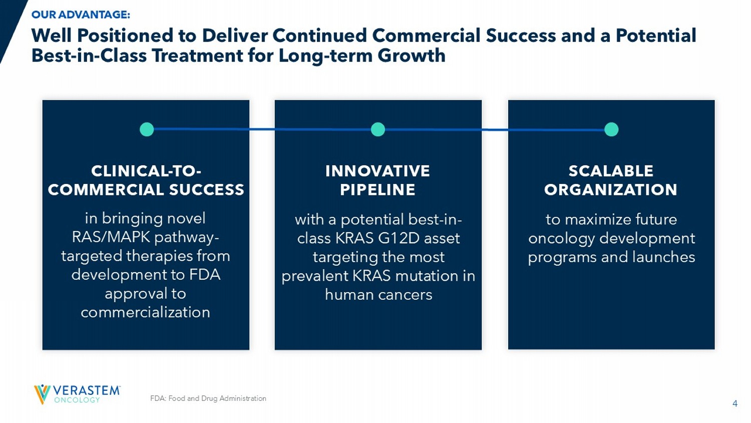 3 OUR COMMERCIAL PRODUCTS MONOTHERAPY & COMBINATION APPROACHES Verastem Oncology: Tackling Challenging Cancers with Novel Therapies OUR FOCUS To expeditiously develop and deliver transformative therapies that truly change outcomes for people living with RAS/MAPK pathway - driven cancers. RAS: Rat Sarcoma Virus; MAPK: Mitogen - Activated Protein Kinase; RAF: Rapidly Accelerated Fibrosarcoma; MEK: Mitogen - Activated Ex tracellular Signal - regulated Kinase; FAK: focal adhesion kinase; KRAS: Kirsten Rat Sarcoma Virus Please see the full Prescribing Information for more information Avutometinib RAF/MEK Clamp Defactinib FAK Inhibitor VS - 7375 KRAS G12D (ON/OFF) Inhibitor