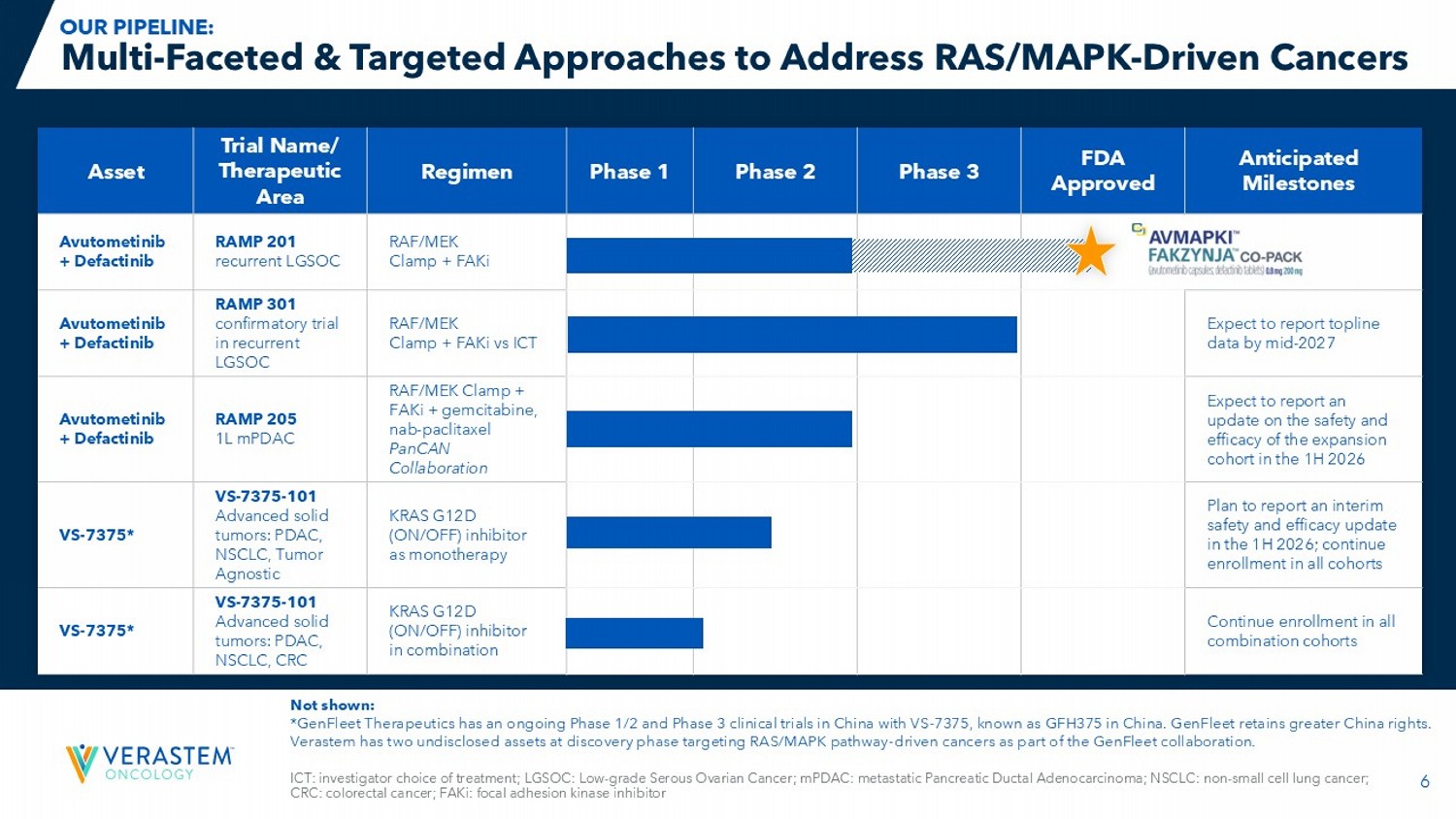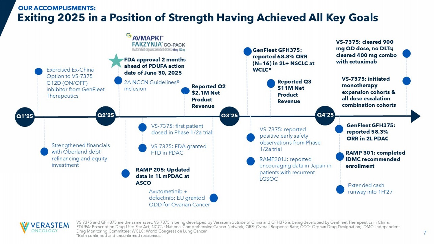 6 Anticipated Milestones FDA Approved Phase 3 Phase 2 Phase 1 Regimen Trial Name/ Therapeutic Area Asset RAF/MEK Clamp + FAKi RAMP 201 recurrent LGSOC Avutometinib + Defactinib Expect to report topline data by mid - 2027 RAF/MEK Clamp + FAKi vs ICT RAMP 301 confirmatory trial in recurrent LGSOC Avutometinib + Defactinib Expect to report an update on the safety and efficacy of the expansion cohort in the 1H 2026 RAF/MEK Clamp + FAKi + gemcitabine, nab - paclitaxel PanCAN Collaboration RAMP 205 1L mPDAC Avutometinib + Defactinib Plan to report an interim safety and efficacy update in the 1H 2026; continue enrollment in all cohorts KRAS G12D (ON/OFF) inhibitor as monotherapy VS - 7375 - 101 Advanced solid tumors: PDAC, NSCLC, Tumor Agnostic VS - 7375* Continue enrollment in all combination cohorts KRAS G12D (ON/OFF) inhibitor in combination VS - 7375 - 101 Advanced solid tumors: PDAC, NSCLC, CRC VS - 7375* ICT: investigator choice of treatment; LGSOC: Low - grade Serous Ovarian Cancer; mPDAC : metastatic Pancreatic Ductal Adenocarcinoma; NSCLC: non - small cell lung cancer; CRC: colorectal cancer; FAKi: focal adhesion kinase inhibitor Multi - Faceted & Targeted Approaches to Address RAS/MAPK - Driven Cancers Not shown: *GenFleet Therapeutics has an ongoing Phase 1/2 and Phase 3 clinical trials in China with VS - 7375, known as GFH375 in China. Gen Fleet retains greater China rights. Verastem has two undisclosed assets at discovery phase targeting RAS/MAPK pathway - driven cancers as part of the GenFleet collabo ration. OUR PIPELINE: