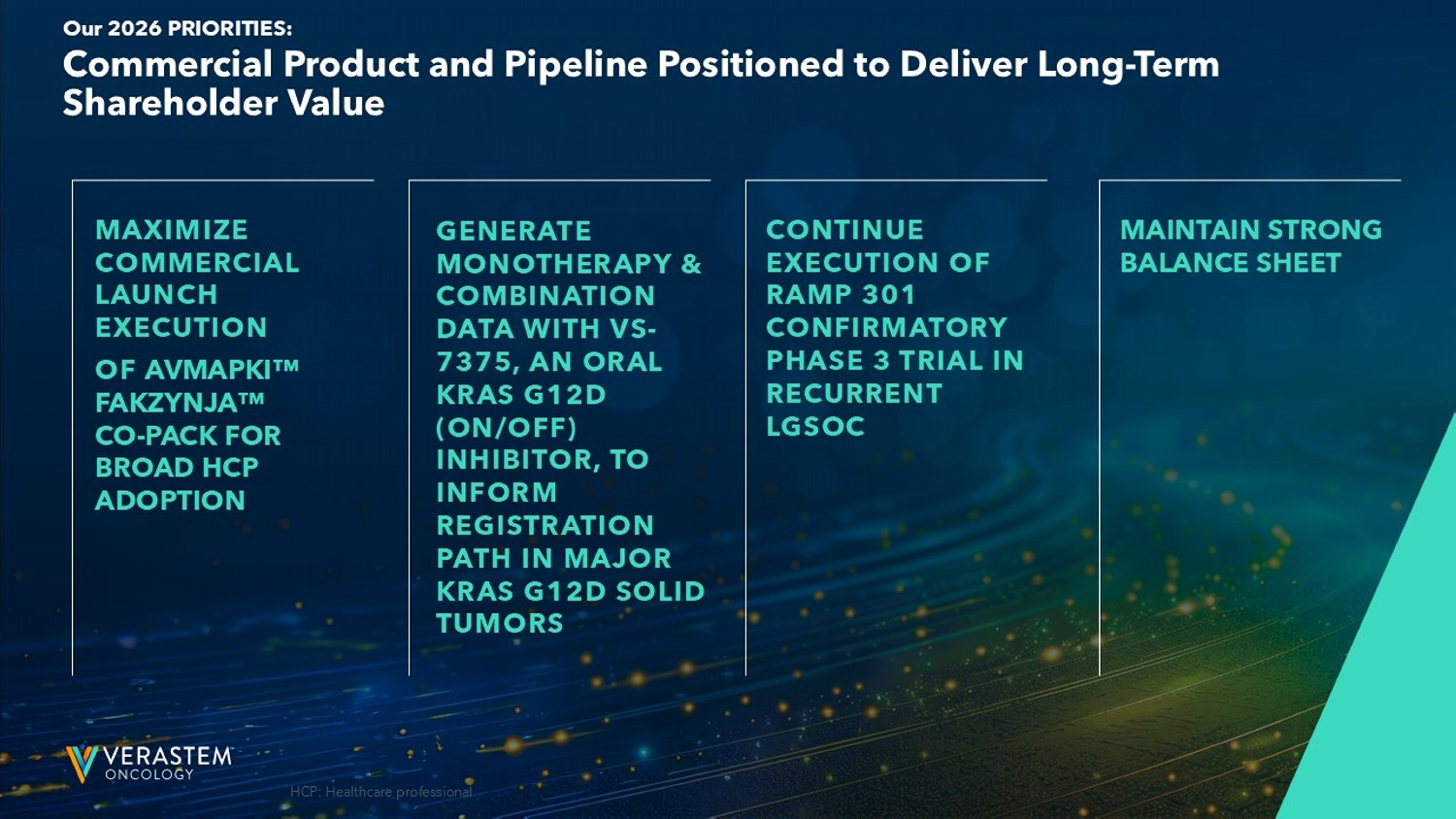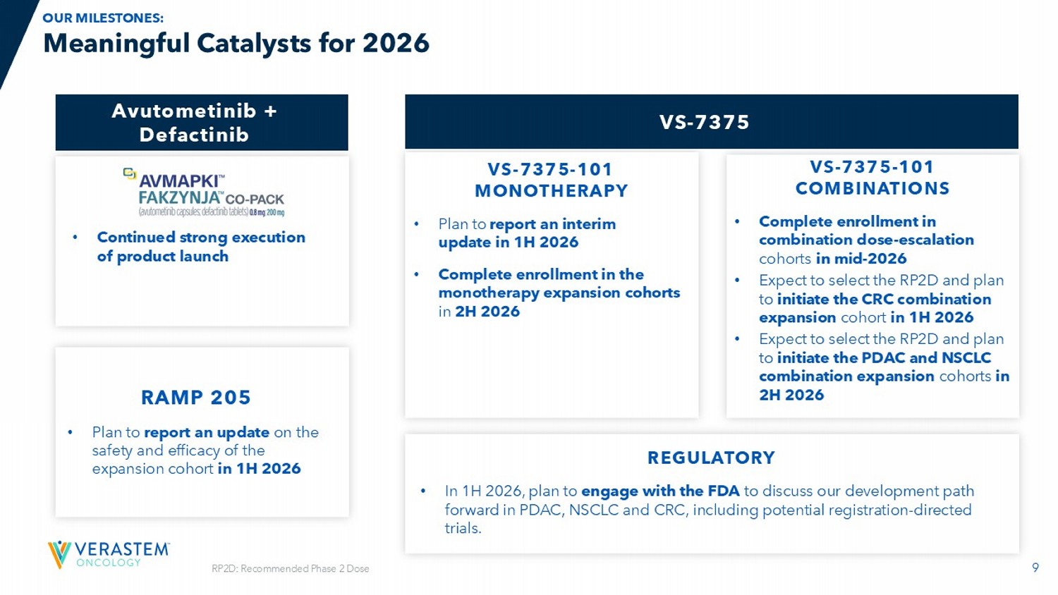 8 8 Commercial Product and Pipeline Positioned to Deliver Long - Term Shareholder Value Our 2026 PRIORITIES: MAXIMIZE COMMERCIAL LAUNCH EXECUTION OF AVMAPKI FAKZYNJA CO - PACK FOR BROAD HCP ADOPTION CONTINUE EXECUTION OF RAMP 301 CONFIRMATORY PHASE 3 TRIAL IN RECURRENT LGSOC MAINTAIN STRONG BALANCE SHEET HCP: Healthcare professional GENERATE MONOTHERAPY & COMBINATION DATA WITH VS - 7375, AN ORAL KRAS G12D (ON/OFF) INHIBITOR, TO INFORM REGISTRATION PATH IN MAJOR KRAS G12D SOLID TUMORS