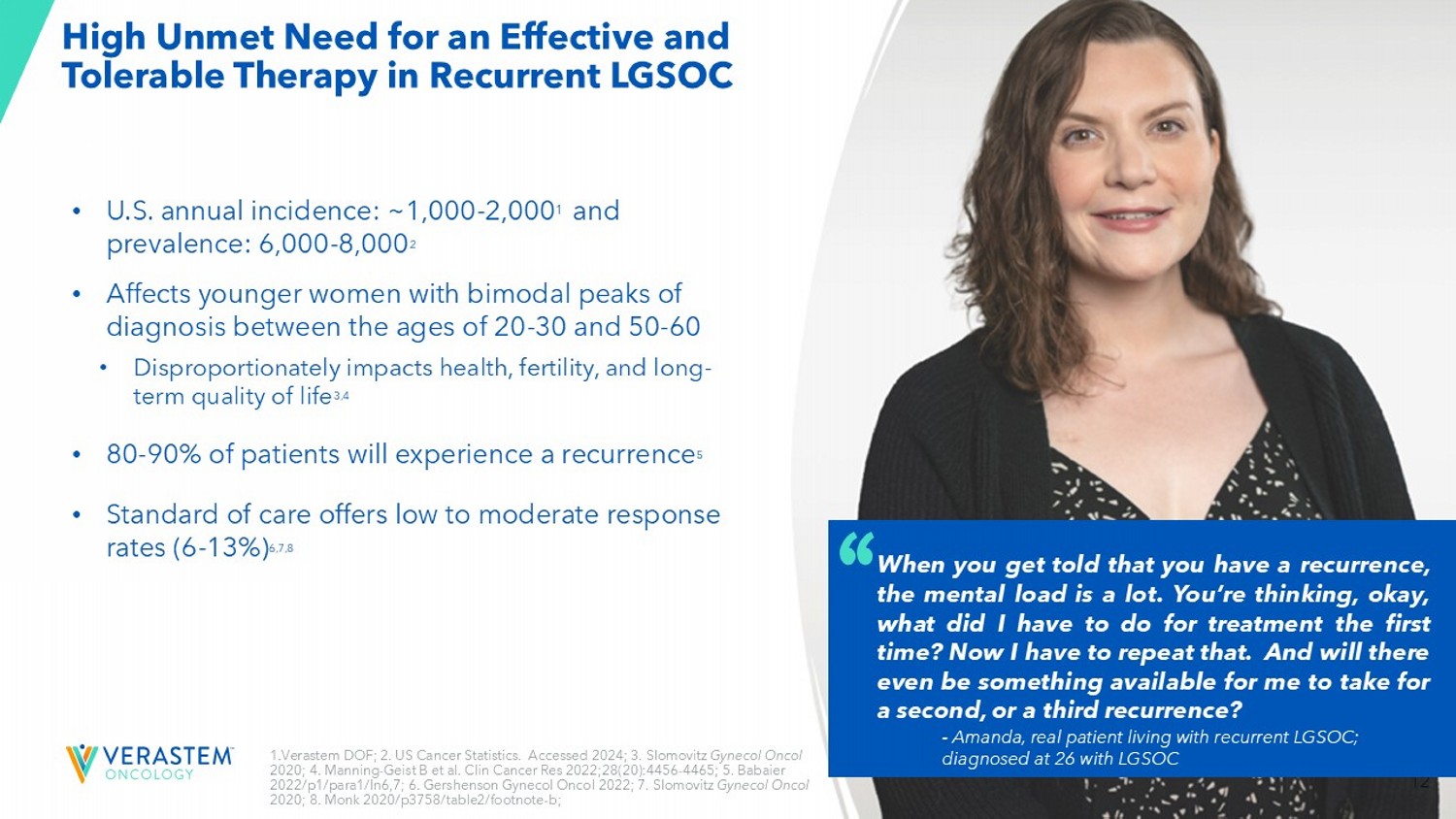 12 High Unmet Need for an Effective and Tolerable Therapy in Recurrent LGSOC • U.S. annual incidence: ~1,000 - 2,000 1 and prevalence: 6,000 - 8,000 2 • A ffects younger women with bimodal peaks of diagnosis between the ages of 20 - 30 and 50 - 60 • Disproportionately impacts health, fertility, and long - term quality of life 3,4 • 80 - 90% of patients will experience a recurrence 5 • Standard of care offers low to moderate response rates (6 - 13%) 6,7,8 1. Verastem DOF; 2. US Cancer Statistics. Accessed 2024 ; 3 . Slomovitz Gynecol Oncol 2020; 4. Manning - Geist B et al. Clin Cancer Res 2022;28(20):4456 - 4465; 5. Babaier 2022/p1/para1/ln6,7; 6. Gershenson Gynecol Oncol 2022; 7. Slomovitz Gynecol Oncol 2020; 8. Monk 2020/p3758/table2/footnote - b; When you get told that you have a recurrence, the mental load is a lot . You’re thinking, okay, what did I have to do for treatment the first time? Now I have to repeat that . And will there even be something available for me to take for a second, or a third recurrence? - Amanda, real patient living with recurrent LGSOC; diagnosed at 26 with LGSOC