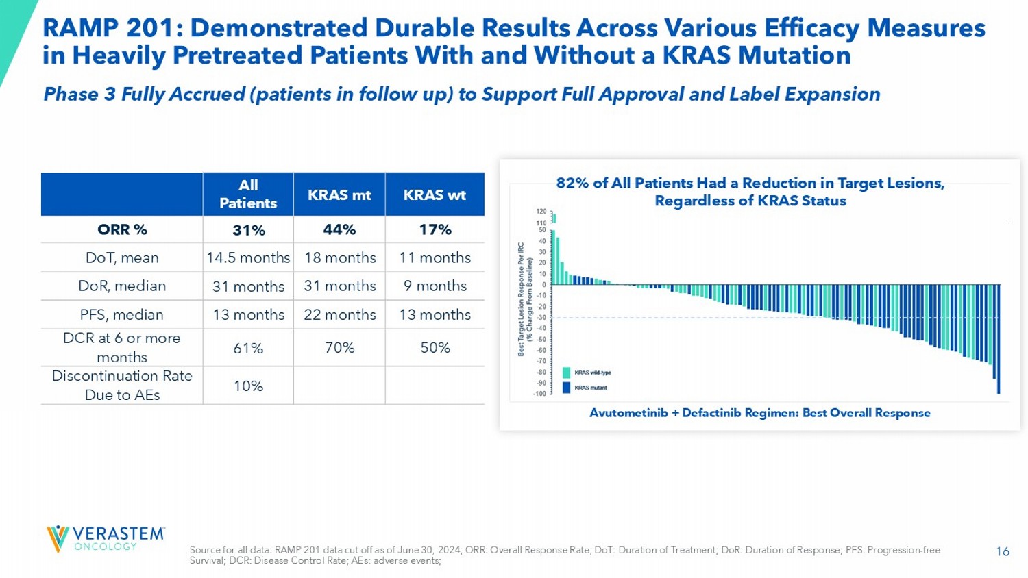 15 NCCN Submission for Treatment Guideline Inclusion Under Review for the Entire Population Enrolled in RAMP 201 Study NCCN Category 3 NCCN Category 2b NCCN Category 2a NCCN Category 1 General % Commercial Payer Coverage Binimetinib • Study stopped early due to futility • 16% ORR by BICR • 31% discontinuation rate due to AEs • Supported by MILO study 3 Hormonal therapy (e.g., Anastrozole, Letrozole) & chemotherapy • 6 - 13% ORR 4 • 17 - 30% discontinuation rate due to AEs 4 Trametinib (2 - 4% US utilization rate 1 ) • 26% ORR by INV assessment, no BICR 5 • 36% discontinuation rate due to AEs 5 No category 1 recommendation Examples of Clinical Data in LGSOC and Current NCCN Guideline Category General source: NCCN; McGivney Global Advisory research and analysis; L.E.K. research and analysis. NCCN categories of prefer enc e: Preferred intervention, Other recommended intervention, Useful in certain circumstances. High - level of evidence generally means large randomized controlled Phased 3 trials; Pie charts represent coverage by all major c ommercial players; 1. Data on File; 2. GOG 281 trial Gershenson et al., Lancet 2022; ​ 3. MILO Study Monk et al., J Clin Oncol 2020; 4. Supported by GOG 281 and MILO studies 2,3 ; 5. Supported by GOG 281 2 Current Listing: Avutometinib + Defactinib Combination Therapy KRAS mt recurrent LGSOC