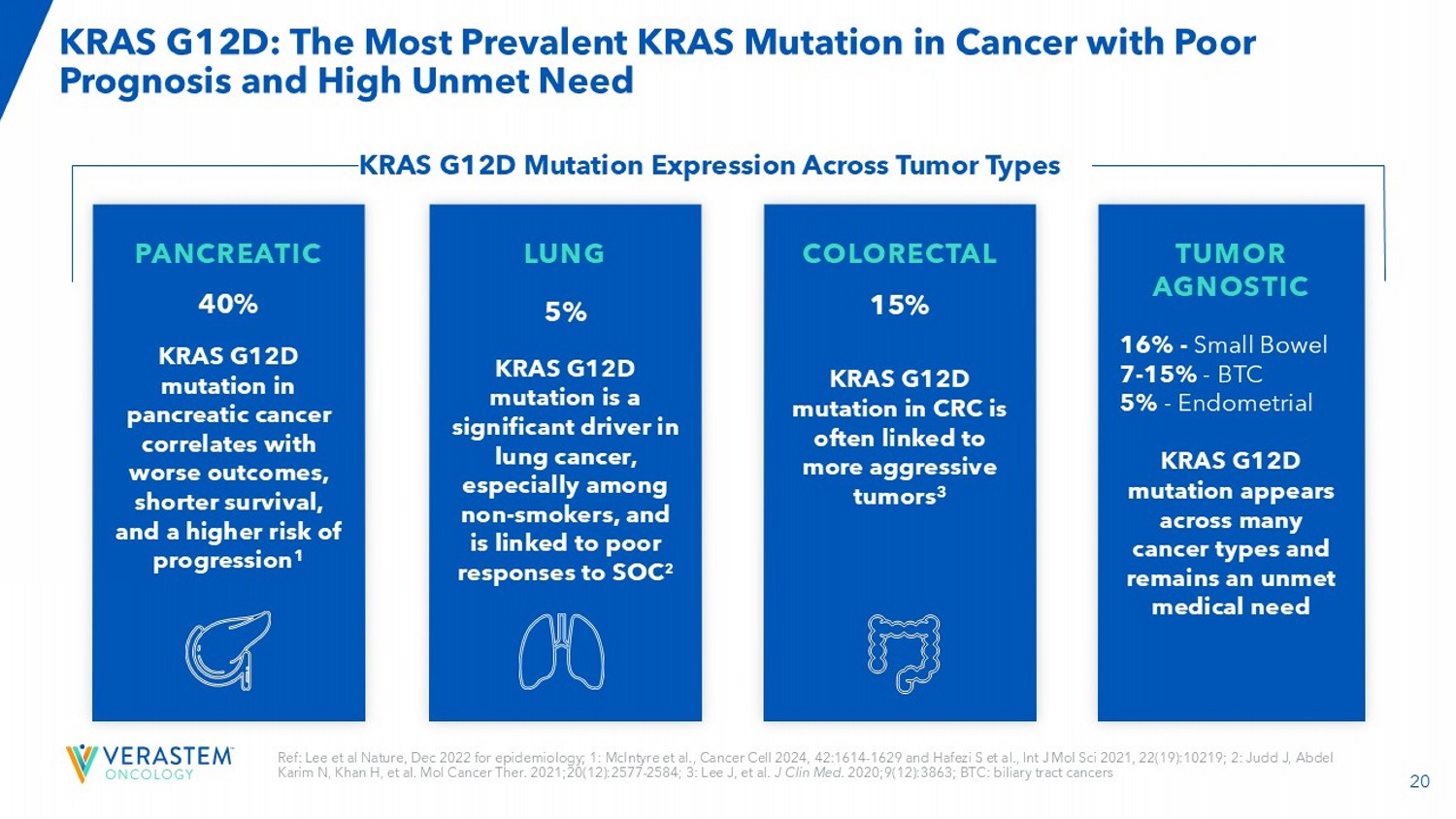 20 Ref: Lee et al Nature, Dec 2022 for epidemiology; 1: McIntyre et al., Cancer Cell 2024, 42:1614 - 1629 and Hafezi S et al., Int J Mol Sci 2021, 22(19):10219; 2: Judd J, Abdel Karim N, Khan H, et al. Mol Cancer Ther. 2021;20(12):2577 - 2584; 3: Lee J, et al. J Clin Med . 2020;9(12):3863; BTC: biliary tract cancers KRAS G12D: The Most Prevalent KRAS Mutation in Cancer with Poor Prognosis and High Unmet Need PANCREATIC 40% KRAS G12D mutation in pancreatic cancer correlates with worse outcomes, shorter survival, and a higher risk of progression 1 LUNG 5% KRAS G12D mutation is a significant driver in lung cancer, especially among non - smokers, and is linked to poor responses to SOC 2 COLORECTAL 15% KRAS G12D mutation in CRC is often linked to more aggressive tumors 3 TUMOR AGNOSTIC 16% - Small Bowel 7 - 15% - BTC 5% - Endometrial KRAS G12D mutation appears across many cancer types and remains an unmet medical need KRAS G12D Mutation Expression Across Tumor Types