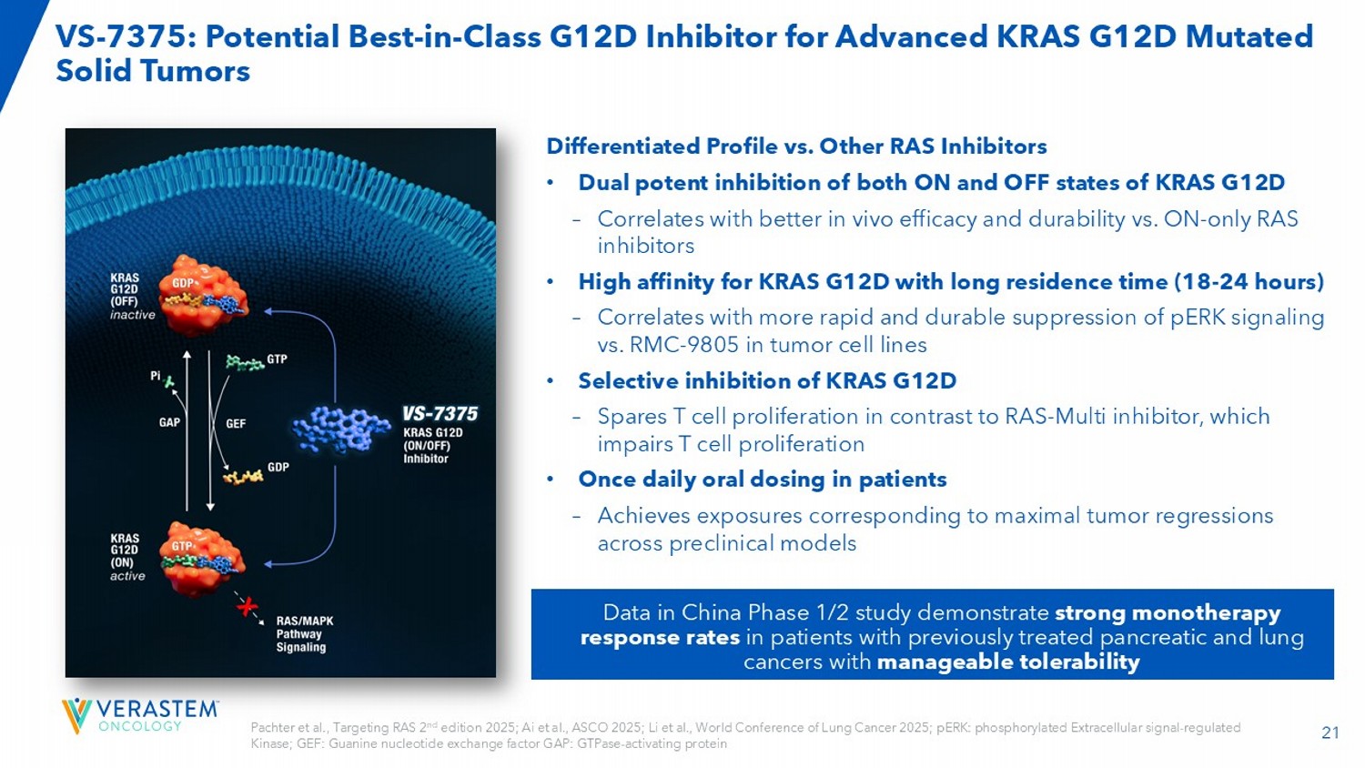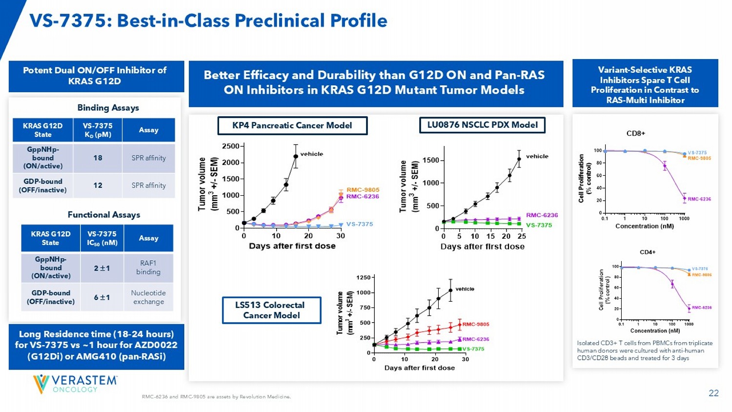 21 VS - 7375: Potential Best - in - Class G12D Inhibitor for Advanced KRAS G12D Mutated Solid Tumors Differentiated Profile vs. Other RAS Inhibitors • Dual potent inhibition of both ON and OFF states of KRAS G12D – Correlates with better in vivo efficacy and durability vs. ON - only RAS inhibitors • High affinity for KRAS G12D with long residence time (18 - 24 hours) – Correlates with more rapid and durable suppression of pERK signaling vs. RMC - 9805 in tumor cell lines • Selective inhibition of KRAS G12D – Spares T cell proliferation in contrast to RAS - Multi inhibitor, which impairs T cell proliferation • Once daily oral dosing in patients – Achieves exposures corresponding to maximal tumor regressions across preclinical models Data in China Phase 1/2 study demonstrate strong monotherapy response rates in patients with previously treated pancreatic and lung cancers with manageable tolerability Pachter et al., Targeting RAS 2 nd edition 2025; Ai et al., ASCO 2025; Li et al., World Conference of Lung Cancer 2025; pERK : phosphorylated Extracellular signal - regulated Kinase; GEF: Guanine nucleotide exchange factor GAP: GTPase - activating protein