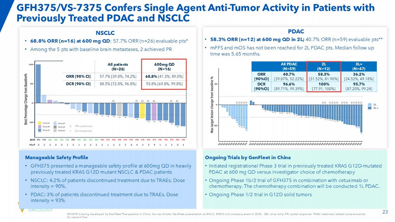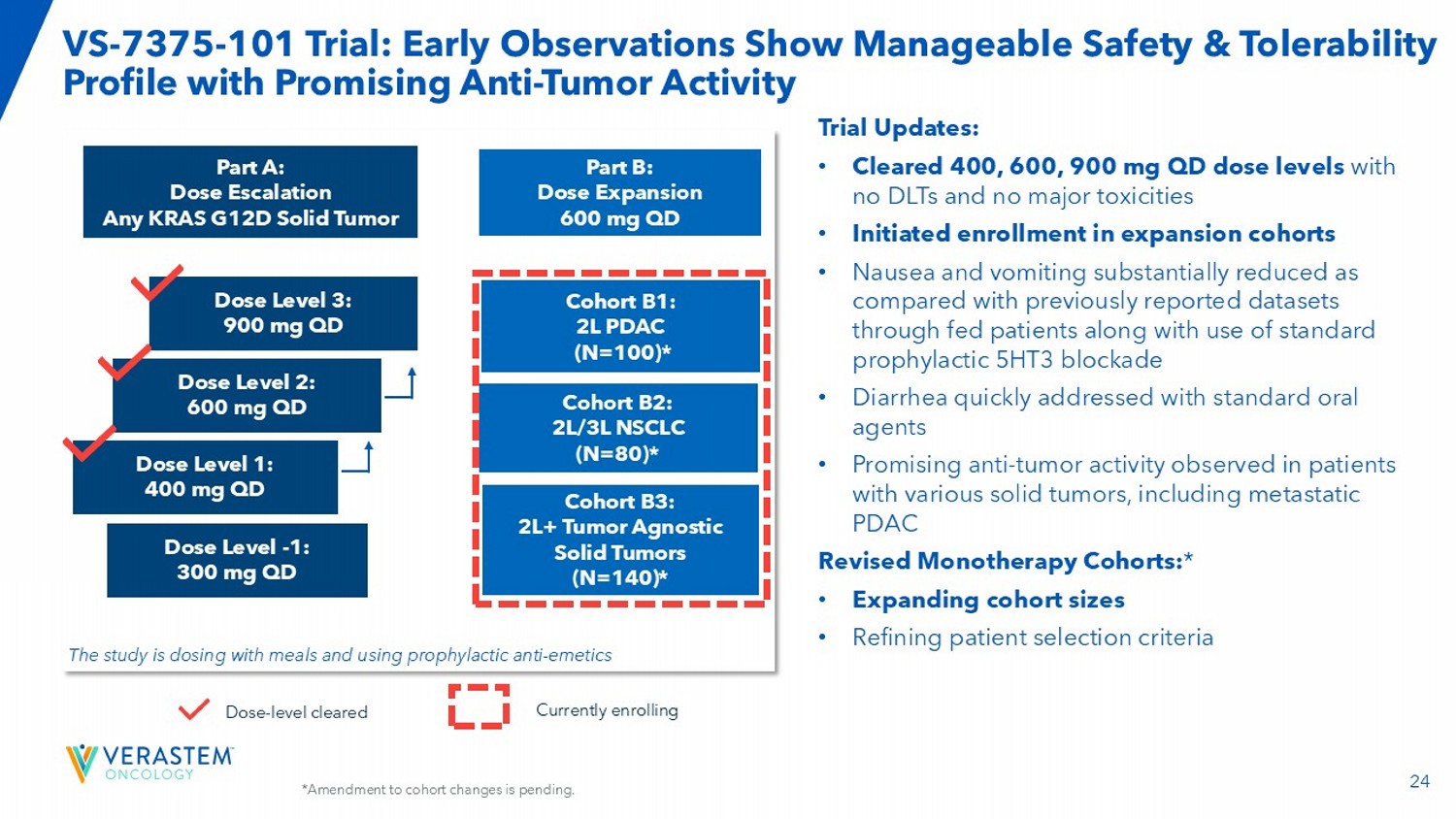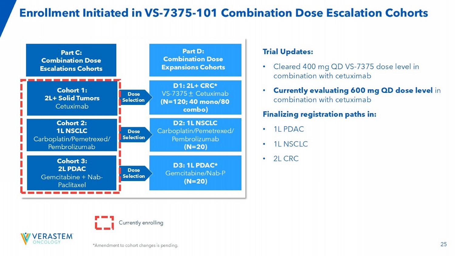 24 VS - 7375 - 101 Trial: Early Observations Show Manageable Safety & Tolerability Profile with Promising Anti - Tumor Activity Part A: Dose Escalation Any KRAS G12D Solid Tumor Part B: Dose Expansion 600 mg QD Dose Level 2: 600 mg QD Dose Level 3: 900 mg QD Dose Level 1: 400 mg QD Dose Level - 1: 300 mg QD Cohort B1: 2L PDAC (N=100) * Cohort B2: 2L/3L NSCLC (N=80) * Cohort B3: 2L+ Tumor Agnostic Solid Tumors (N=140) * The study is dosing with meals and using prophylactic anti - emetics Trial Updates: • Cleared 400, 600, 900 mg QD dose levels with no DLTs and no major toxicities • Initiated enrollment in expansion cohorts • Nausea and vomiting substantially reduced as compared with previously reported datasets through fed patients along with use of standard prophylactic 5HT3 blockade • Diarrhea quickly addressed with standard oral agents • Promising anti - tumor activity observed in patients with various solid tumors, including metastatic PDAC Revised Monotherapy Cohorts: * • Expanding cohort sizes • Refining patient selection criteria Dose - level cleared Currently enrolling *Amendment to cohort changes is pending.