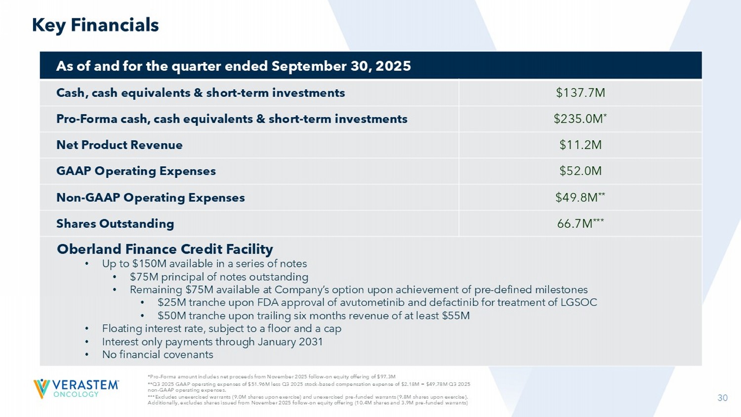 30 *Pro - Forma amount includes net proceeds from November 2025 follow - on equity offering of $97.3M **Q3 2025 GAAP operating expenses of $51.96M less Q3 2025 stock - based compensation expense of $2.18M = $49.78M Q3 2025 non - GAAP operating expenses. ***Excludes unexercised warrants (9.0M shares upon exercise) and unexercised pre - funded warrants (9.8M shares upon exercise). Additionally, excludes shares issued from November 2025 follow - on equity offering (10.4M shares and 3.9M pre - funded warrants) Key Financials As of and for the quarter ended September 30, 2025 $137.7M Cash, cash equivalents & short - term investments $235.0M * Pro - Forma cash, cash equivalents & short - term investments $11.2M Net Product Revenue $52.0M GAAP Operating Expenses $49.8M ** Non - GAAP Operating Expenses 66.7M *** Shares Outstanding Oberland Finance Credit Facility • Up to $150M available in a series of notes • $75M principal of notes outstanding • Remaining $75M available at Company’s option upon achievement of pre - defined milestones • $25M tranche upon FDA approval of avutometinib and defactinib for treatment of LGSOC • $50M tranche upon trailing six months revenue of at least $55M • Floating interest rate, subject to a floor and a cap • Interest only payments through January 2031 • No financial covenants
