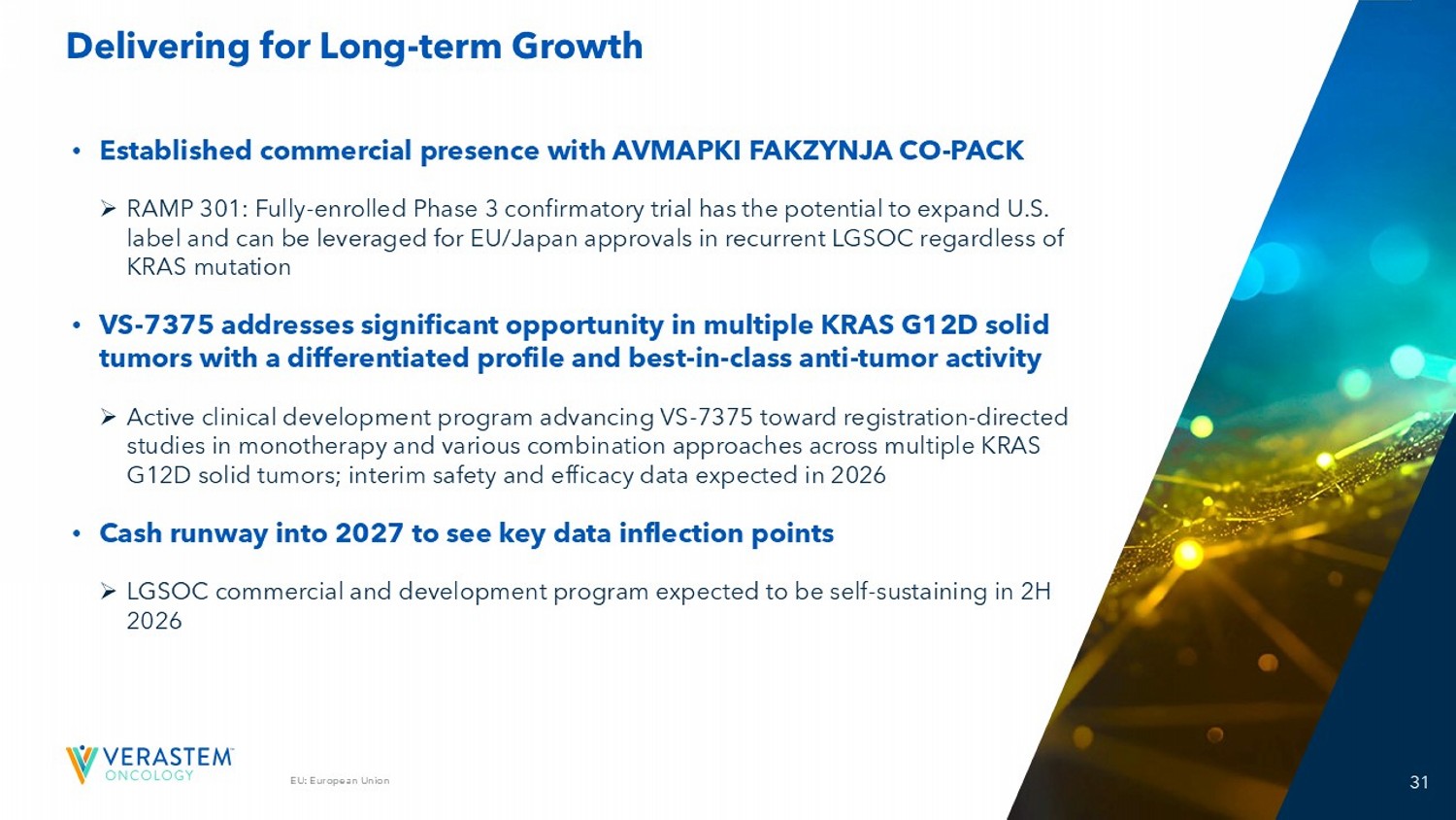 31 31 EU: European Union Delivering for Long - term Growth • Established commercial presence with AVMAPKI FAKZYNJA CO - PACK » RAMP 301: Fully - enrolled Phase 3 confirmatory trial has the potential to expand U.S. label and can be leveraged for EU/Japan approvals in recurrent LGSOC regardless of KRAS mutation • VS - 7375 addresses significant opportunity in multiple KRAS G12D solid tumors with a differentiated profile and best - in - class anti - tumor activity » Active clinical development program advancing VS - 7375 toward registration - directed studies in monotherapy and various combination approaches across multiple KRAS G12D solid tumors; interim safety and efficacy data expected in 2026 • Cash runway into 2027 to see key data inflection points » LGSOC commercial and development program expected to be self - sustaining in 2H 2026