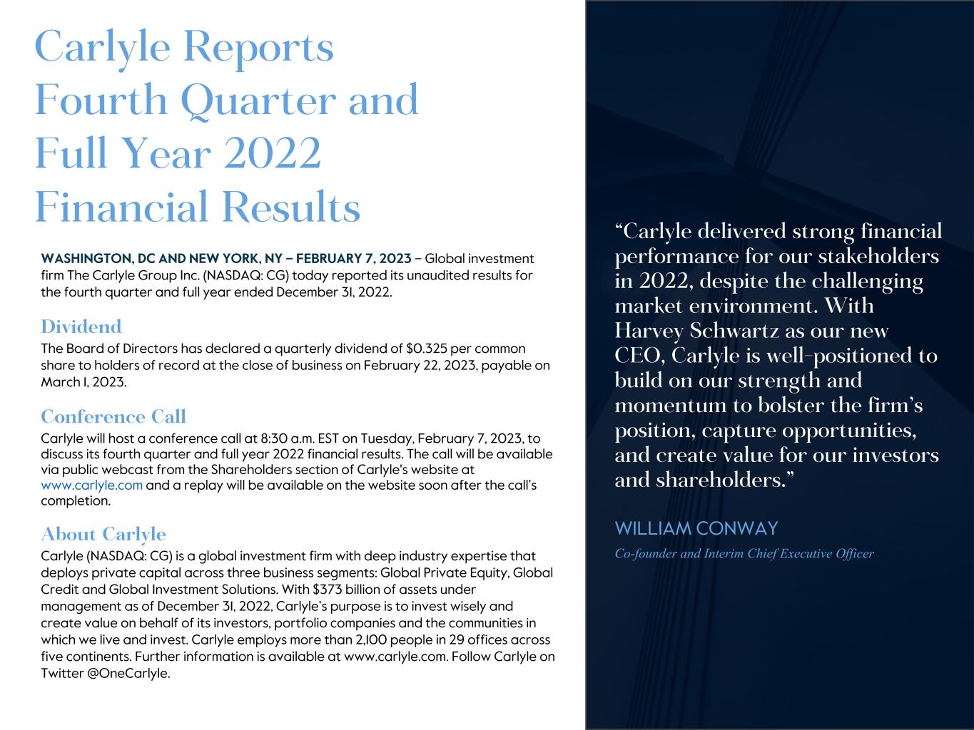 Carlyle Reports Fourth Quarter and Full Year 2022 Financial Results WASHINGTON, DC AND NEW YORK, NY – FEBRUARY 7, 2023 – Global investment firm The Carlyle Group Inc. (NASDAQ: CG) today reported its unaudited results for the fourth quarter and full year ended December 31, 2022. Dividend The Board of Directors has declared a quarterly dividend of $0.325 per common share to holders of record at the close of business on February 22, 2023, payable on March 1, 2023. Conference Call Carlyle will host a conference call at 8:30 a.m. EST on Tuesday, February 7, 2023, to discuss its fourth quarter and full year 2022 financial results. The call will be available via public webcast from the Shareholders section of Carlyle's website at www.carlyle.com and a replay will be available on the website soon after the call’s completion. About Carlyle Carlyle (NASDAQ: CG) is a global investment firm with deep industry expertise that deploys private capital across three business segments: Global Private Equity, Global Credit and Global Investment Solutions. With $373 billion of assets under management as of December 31, 2022, Carlyle’s purpose is to invest wisely and create value on behalf of its investors, portfolio companies and the communities in which we live and invest. Carlyle employs more than 2,100 people in 29 offices across five continents. Further information is available at www.carlyle.com. Follow Carlyle on Twitter @OneCarlyle. 2 “Carlyle delivered strong financial performance for our stakeholders in 2022, despite the challenging market environment. With Harvey Schwartz as our new CEO, Carlyle is well-positioned to build on our strength and momentum to bolster the firm’s position, capture opportunities, and create value for our investors and shareholders.” WILLIAM CONWAY Co-founder and Interim Chief Executive Officer