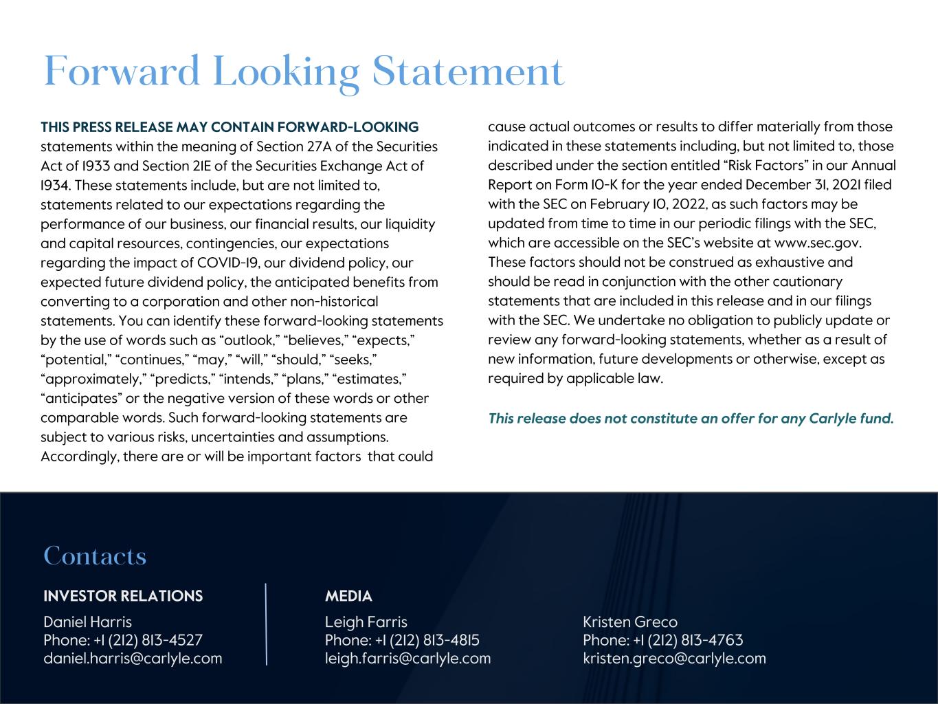 THIS PRESS RELEASE MAY CONTAIN FORWARD-LOOKING statements within the meaning of Section 27A of the Securities Act of 1933 and Section 21E of the Securities Exchange Act of 1934. These statements include, but are not limited to, statements related to our expectations regarding the performance of our business, our financial results, our liquidity and capital resources, contingencies, our expectations regarding the impact of COVID-19, our dividend policy, our expected future dividend policy, the anticipated benefits from converting to a corporation and other non-historical statements. You can identify these forward-looking statements by the use of words such as “outlook,” “believes,” “expects,” “potential,” “continues,” “may,” “will,” “should,” “seeks,” “approximately,” “predicts,” “intends,” “plans,” “estimates,” “anticipates” or the negative version of these words or other comparable words. Such forward-looking statements are subject to various risks, uncertainties and assumptions. Accordingly, there are or will be important factors that could Forward Looking Statement cause actual outcomes or results to differ materially from those indicated in these statements including, but not limited to, those described under the section entitled “Risk Factors” in our Annual Report on Form 10-K for the year ended December 31, 2021 filed with the SEC on February 10, 2022, as such factors may be updated from time to time in our periodic filings with the SEC, which are accessible on the SEC’s website at www.sec.gov. These factors should not be construed as exhaustive and should be read in conjunction with the other cautionary statements that are included in this release and in our filings with the SEC. We undertake no obligation to publicly update or review any forward-looking statements, whether as a result of new information, future developments or otherwise, except as required by applicable law. This release does not constitute an offer for any Carlyle fund. Contacts INVESTOR RELATIONS MEDIA Daniel Harris Leigh Farris Kristen Greco Phone: +1 (212) 813-4527 Phone: +1 (212) 813-4815 Phone: +1 (212) 813-4763 daniel.harris@carlyle.com leigh.farris@carlyle.com kristen.greco@carlyle.com
