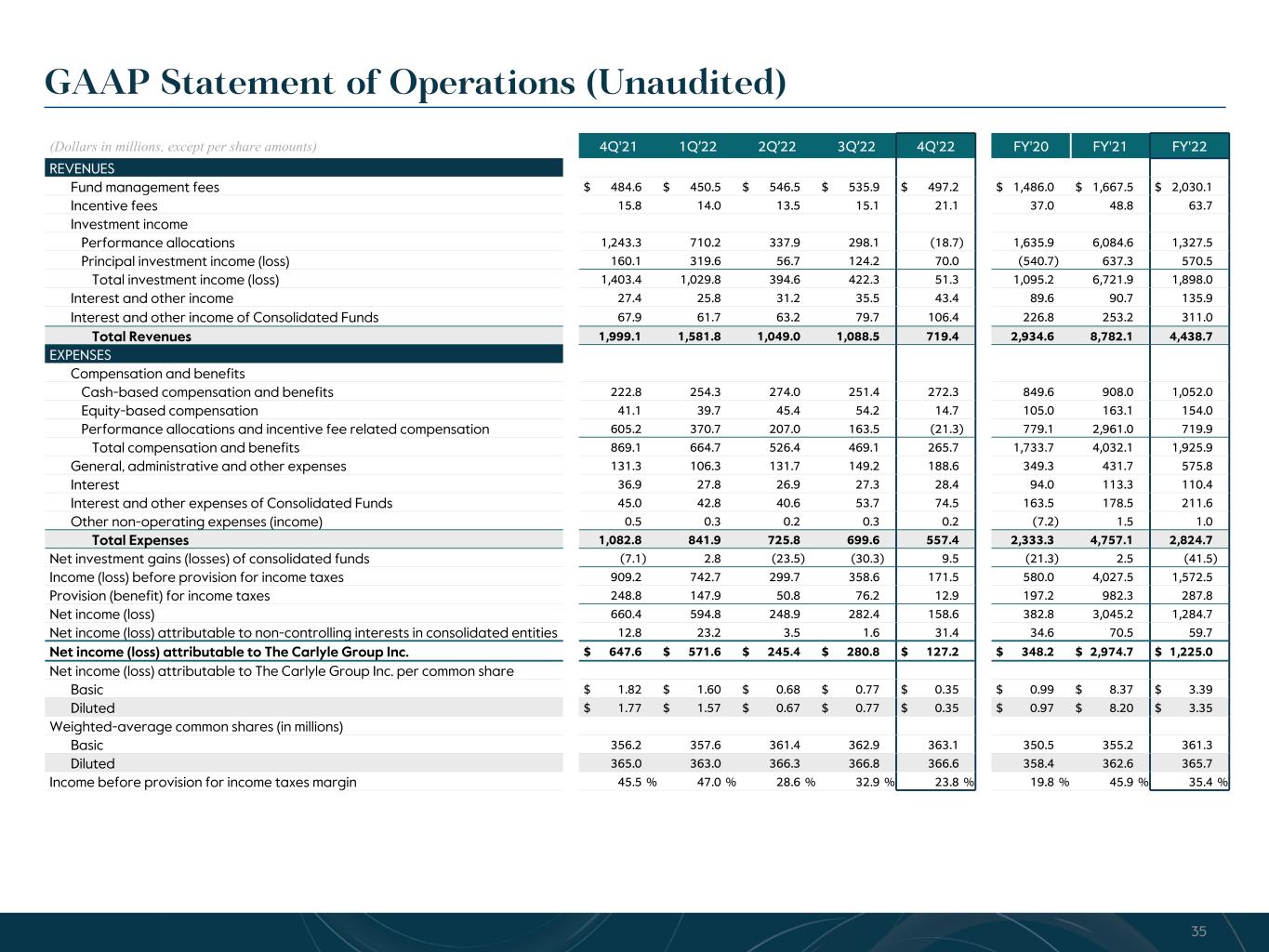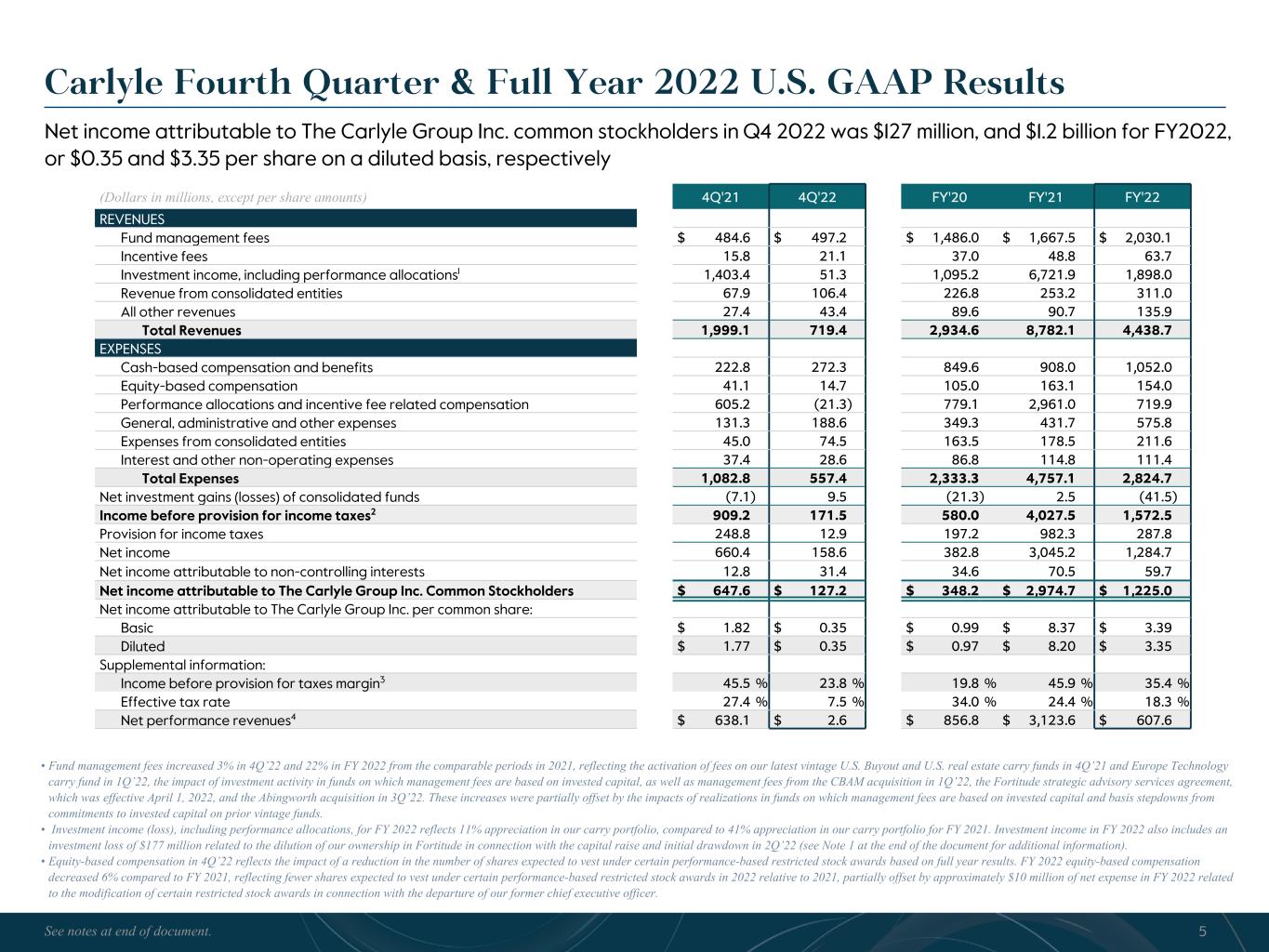 R-14 7 G-19 5 B-19 7 R-88 G-15 9 B-16 5 R-13 6 G-18 0 B-83 R-16 3 G-14 3 B-18 7 R-0 G-74 B-13 6 R-18 5 G-21 1 B-15 3 R-11 8 G-92 B-15 0 R-22 0 G-22 1 B-23 2 R-14 0 G-14 1 B-15 2R-12 0 G-16 9 B-22 2 Old Colors R-88 G-89 B-91 58595B R-23 G-234 B-234 EAEAEA R-208 G-232 B-247 D0E8F7 R-65 G-64 B-66 414042 R-8 G-51 B-94 08335E R-167 G-169 B-171 A7A9AB R-9 G-102 B-112 096670 R-220 G-221 B-222 DCDDDE R-97 G-161 B-224 61A1E0 R-237 G-217 B-157 EDD99D R-147 G-195 B-197 93C3C5 GAAP Statement of Operations (Unaudited) (Dollars in millions, except per share amounts) 4Q'21 1Q’22 2Q’22 3Q’22 4Q'22 FY'20 FY'21 FY'22 REVENUES Fund management fees $ 484.6 $ 450.5 $ 546.5 $ 535.9 $ 497.2 $ 1,486.0 $ 1,667.5 $ 2,030.1 Incentive fees 15.8 14.0 13.5 15.1 21.1 37.0 48.8 63.7 Investment income Performance allocations 1,243.3 710.2 337.9 298.1 (18.7) 1,635.9 6,084.6 1,327.5 Principal investment income (loss) 160.1 319.6 56.7 124.2 70.0 (540.7) 637.3 570.5 Total investment income (loss) 1,403.4 1,029.8 394.6 422.3 51.3 1,095.2 6,721.9 1,898.0 Interest and other income 27.4 25.8 31.2 35.5 43.4 89.6 90.7 135.9 Interest and other income of Consolidated Funds 67.9 61.7 63.2 79.7 106.4 226.8 253.2 311.0 Total Revenues 1,999.1 1,581.8 1,049.0 1,088.5 719.4 2,934.6 8,782.1 4,438.7 EXPENSES Compensation and benefits Cash-based compensation and benefits 222.8 254.3 274.0 251.4 272.3 849.6 908.0 1,052.0 Equity-based compensation 41.1 39.7 45.4 54.2 14.7 105.0 163.1 154.0 Performance allocations and incentive fee related compensation 605.2 370.7 207.0 163.5 (21.3) 779.1 2,961.0 719.9 Total compensation and benefits 869.1 664.7 526.4 469.1 265.7 1,733.7 4,032.1 1,925.9 General, administrative and other expenses 131.3 106.3 131.7 149.2 188.6 349.3 431.7 575.8 Interest 36.9 27.8 26.9 27.3 28.4 94.0 113.3 110.4 Interest and other expenses of Consolidated Funds 45.0 42.8 40.6 53.7 74.5 163.5 178.5 211.6 Other non-operating expenses (income) 0.5 0.3 0.2 0.3 0.2 (7.2) 1.5 1.0 Total Expenses 1,082.8 841.9 725.8 699.6 557.4 2,333.3 4,757.1 2,824.7 Net investment gains (losses) of consolidated funds (7.1) 2.8 (23.5) (30.3) 9.5 (21.3) 2.5 (41.5) Income (loss) before provision for income taxes 909.2 742.7 299.7 358.6 171.5 580.0 4,027.5 1,572.5 Provision (benefit) for income taxes 248.8 147.9 50.8 76.2 12.9 197.2 982.3 287.8 Net income (loss) 660.4 594.8 248.9 282.4 158.6 382.8 3,045.2 1,284.7 Net income (loss) attributable to non-controlling interests in consolidated entities 12.8 23.2 3.5 1.6 31.4 34.6 70.5 59.7 Net income (loss) attributable to The Carlyle Group Inc. $ 647.6 $ 571.6 $ 245.4 $ 280.8 $ 127.2 $ 348.2 $ 2,974.7 $ 1,225.0 Net income (loss) attributable to The Carlyle Group Inc. per common share Basic $ 1.82 $ 1.60 $ 0.68 $ 0.77 $ 0.35 $ 0.99 $ 8.37 $ 3.39 Diluted $ 1.77 $ 1.57 $ 0.67 $ 0.77 $ 0.35 $ 0.97 $ 8.20 $ 3.35 Weighted-average common shares (in millions) Basic 356.2 357.6 361.4 362.9 363.1 350.5 355.2 361.3 Diluted 365.0 363.0 366.3 366.8 366.6 358.4 362.6 365.7 Income before provision for income taxes margin 45.5 % 47.0 % 28.6 % 32.9 % 23.8 % 19.8 % 45.9 % 35.4 % 35