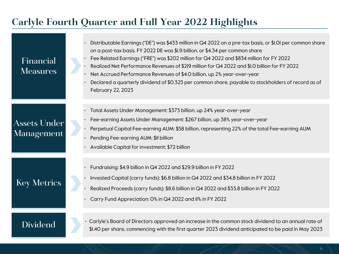 R-14 7 G-19 5 B-19 7 R-88 G-15 9 B-16 5 R-13 6 G-18 0 B-83 R-16 3 G-14 3 B-18 7 R-0 G-74 B-13 6 R-18 5 G-21 1 B-15 3 R-11 8 G-92 B-15 0 R-22 0 G-22 1 B-23 2 R-14 0 G-14 1 B-15 2R-12 0 G-16 9 B-22 2 Old Colors R-88 G-89 B-91 58595B R-23 G-234 B-234 EAEAEA R-208 G-232 B-247 D0E8F7 R-65 G-64 B-66 414042 R-8 G-51 B-94 08335E R-167 G-169 B-171 A7A9AB R-9 G-102 B-112 096670 R-220 G-221 B-222 DCDDDE R-97 G-161 B-224 61A1E0 R-237 G-217 B-157 EDD99D R-147 G-195 B-197 93C3C5 Carlyle Fourth Quarter & Full Year 2022 U.S. GAAP Results • Fund management fees increased 3% in 4Q’22 and 22% in FY 2022 from the comparable periods in 2021, reflecting the activation of fees on our latest vintage U.S. Buyout and U.S. real estate carry funds in 4Q’21 and Europe Technology carry fund in 1Q’22, the impact of investment activity in funds on which management fees are based on invested capital, as well as management fees from the CBAM acquisition in 1Q’22, the Fortitude strategic advisory services agreement, which was effective April 1, 2022, and the Abingworth acquisition in 3Q’22. These increases were partially offset by the impacts of realizations in funds on which management fees are based on invested capital and basis stepdowns from commitments to invested capital on prior vintage funds. • Investment income (loss), including performance allocations, for FY 2022 reflects 11% appreciation in our carry portfolio, compared to 41% appreciation in our carry portfolio for FY 2021. Investment income in FY 2022 also includes an investment loss of $177 million related to the dilution of our ownership in Fortitude in connection with the capital raise and initial drawdown in 2Q’22 (see Note 1 at the end of the document for additional information). • Equity-based compensation in 4Q’22 reflects the impact of a reduction in the number of shares expected to vest under certain performance-based restricted stock awards based on full year results. FY 2022 equity-based compensation decreased 6% compared to FY 2021, reflecting fewer shares expected to vest under certain performance-based restricted stock awards in 2022 relative to 2021, partially offset by approximately $10 million of net expense in FY 2022 related to the modification of certain restricted stock awards in connection with the departure of our former chief executive officer. 5 (Dollars in millions, except per share amounts) 4Q'21 4Q'22 FY'20 FY'21 FY'22 REVENUES Fund management fees $ 484.6 $ 497.2 $ 1,486.0 $ 1,667.5 $ 2,030.1 Incentive fees 15.8 21.1 37.0 48.8 63.7 Investment income, including performance allocations1 1,403.4 51.3 1,095.2 6,721.9 1,898.0 Revenue from consolidated entities 67.9 106.4 226.8 253.2 311.0 All other revenues 27.4 43.4 89.6 90.7 135.9 Total Revenues 1,999.1 719.4 2,934.6 8,782.1 4,438.7 EXPENSES Cash-based compensation and benefits 222.8 272.3 849.6 908.0 1,052.0 Equity-based compensation 41.1 14.7 105.0 163.1 154.0 Performance allocations and incentive fee related compensation 605.2 (21.3) 779.1 2,961.0 719.9 General, administrative and other expenses 131.3 188.6 349.3 431.7 575.8 Expenses from consolidated entities 45.0 74.5 163.5 178.5 211.6 Interest and other non-operating expenses 37.4 28.6 86.8 114.8 111.4 Total Expenses 1,082.8 557.4 2,333.3 4,757.1 2,824.7 Net investment gains (losses) of consolidated funds (7.1) 9.5 (21.3) 2.5 (41.5) Income before provision for income taxes2 909.2 171.5 580.0 4,027.5 1,572.5 Provision for income taxes 248.8 12.9 197.2 982.3 287.8 Net income 660.4 158.6 382.8 3,045.2 1,284.7 Net income attributable to non-controlling interests 12.8 31.4 34.6 70.5 59.7 Net income attributable to The Carlyle Group Inc. Common Stockholders $ 647.6 $ 127.2 $ 348.2 $ 2,974.7 $ 1,225.0 Net income attributable to The Carlyle Group Inc. per common share: Basic $ 1.82 $ 0.35 $ 0.99 $ 8.37 $ 3.39 Diluted $ 1.77 $ 0.35 $ 0.97 $ 8.20 $ 3.35 Supplemental information: Income before provision for taxes margin3 45.5 % 23.8 % 19.8 % 45.9 % 35.4 % Effective tax rate 27.4 % 7.5 % 34.0 % 24.4 % 18.3 % Net performance revenues4 $ 638.1 $ 2.6 $ 856.8 $ 3,123.6 $ 607.6 Net income attributable to The Carlyle Group Inc. common stockholders in Q4 2022 was $127 million, and $1.2 billion for FY2022, or $0.35 and $3.35 per share on a diluted basis, respectively See notes at end of document.