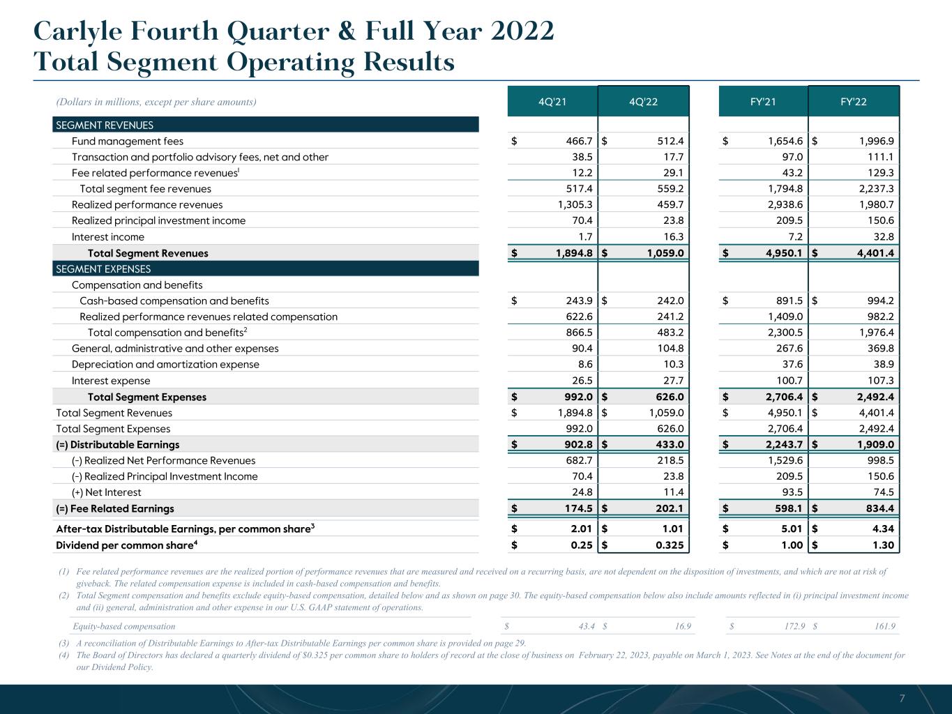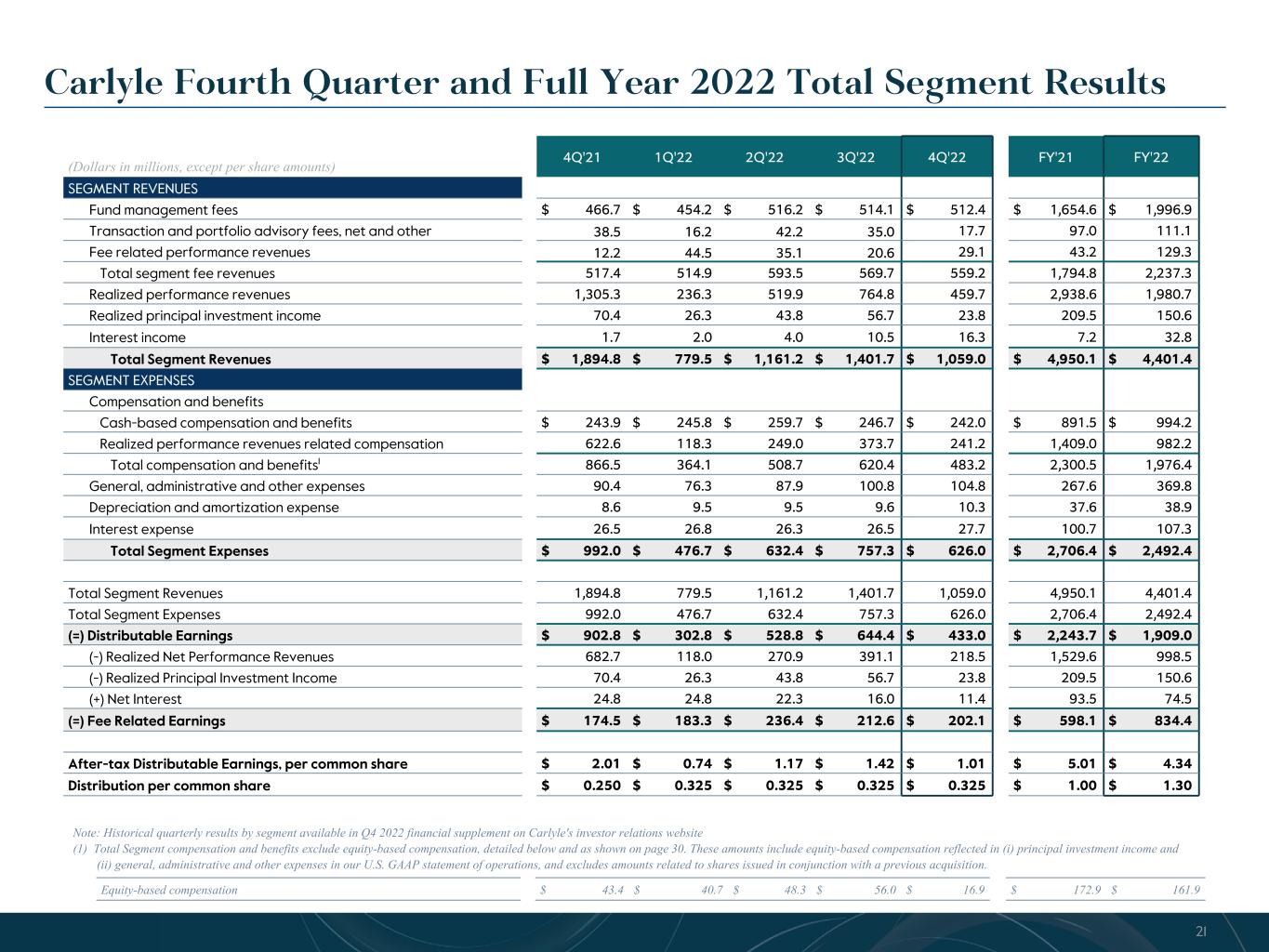 R-14 7 G-19 5 B-19 7 R-88 G-15 9 B-16 5 R-13 6 G-18 0 B-83 R-16 3 G-14 3 B-18 7 R-0 G-74 B-13 6 R-18 5 G-21 1 B-15 3 R-11 8 G-92 B-15 0 R-22 0 G-22 1 B-23 2 R-14 0 G-14 1 B-15 2R-12 0 G-16 9 B-22 2 Old Colors R-88 G-89 B-91 58595B R-23 G-234 B-234 EAEAEA R-208 G-232 B-247 D0E8F7 R-65 G-64 B-66 414042 R-8 G-51 B-94 08335E R-167 G-169 B-171 A7A9AB R-9 G-102 B-112 096670 R-220 G-221 B-222 DCDDDE R-97 G-161 B-224 61A1E0 R-237 G-217 B-157 EDD99D R-147 G-195 B-197 93C3C5 (Dollars in millions, except per share amounts) 4Q'21 1Q'22 2Q'22 3Q'22 4Q'22 FY'21 FY'22 SEGMENT REVENUES Fund management fees $ 466.7 $ 454.2 $ 516.2 $ 514.1 $ 512.4 $ 1,654.6 $ 1,996.9 Transaction and portfolio advisory fees, net and other 38.5 16.2 42.2 35.0 17.7 97.0 111.1 Fee related performance revenues 12.2 44.5 35.1 20.6 29.1 43.2 129.3 Total segment fee revenues 517.4 514.9 593.5 569.7 559.2 1,794.8 2,237.3 Realized performance revenues 1,305.3 236.3 519.9 764.8 459.7 2,938.6 1,980.7 Realized principal investment income 70.4 26.3 43.8 56.7 23.8 209.5 150.6 Interest income 1.7 2.0 4.0 10.5 16.3 7.2 32.8 Total Segment Revenues $ 1,894.8 $ 779.5 $ 1,161.2 $ 1,401.7 $ 1,059.0 $ 4,950.1 $ 4,401.4 SEGMENT EXPENSES Compensation and benefits Cash-based compensation and benefits $ 243.9 $ 245.8 $ 259.7 $ 246.7 $ 242.0 $ 891.5 $ 994.2 Realized performance revenues related compensation 622.6 118.3 249.0 373.7 241.2 1,409.0 982.2 Total compensation and benefits1 866.5 364.1 508.7 620.4 483.2 2,300.5 1,976.4 General, administrative and other expenses 90.4 76.3 87.9 100.8 104.8 267.6 369.8 Depreciation and amortization expense 8.6 9.5 9.5 9.6 10.3 37.6 38.9 Interest expense 26.5 26.8 26.3 26.5 27.7 100.7 107.3 Total Segment Expenses $ 992.0 $ 476.7 $ 632.4 $ 757.3 $ 626.0 $ 2,706.4 $ 2,492.4 Total Segment Revenues 1,894.8 779.5 1,161.2 1,401.7 1,059.0 4,950.1 4,401.4 Total Segment Expenses 992.0 476.7 632.4 757.3 626.0 2,706.4 2,492.4 (=) Distributable Earnings $ 902.8 $ 302.8 $ 528.8 $ 644.4 $ 433.0 $ 2,243.7 $ 1,909.0 (-) Realized Net Performance Revenues 682.7 118.0 270.9 391.1 218.5 1,529.6 998.5 (-) Realized Principal Investment Income 70.4 26.3 43.8 56.7 23.8 209.5 150.6 (+) Net Interest 24.8 24.8 22.3 16.0 11.4 93.5 74.5 (=) Fee Related Earnings $ 174.5 $ 183.3 $ 236.4 $ 212.6 $ 202.1 $ 598.1 $ 834.4 After-tax Distributable Earnings, per common share $ 2.01 $ 0.74 $ 1.17 $ 1.42 $ 1.01 $ 5.01 $ 4.34 Distribution per common share $ 0.250 $ 0.325 $ 0.325 $ 0.325 $ 0.325 $ 1.00 $ 1.30 Note: Historical quarterly results by segment available in Q4 2022 financial supplement on Carlyle's investor relations website (1) Total Segment compensation and benefits exclude equity-based compensation, detailed below and as shown on page 30. These amounts include equity-based compensation reflected in (i) principal investment income and (ii) general, administrative and other expenses in our U.S. GAAP statement of operations, and excludes amounts related to shares issued in conjunction with a previous acquisition. Carlyle Fourth Quarter and Full Year 2022 Total Segment Results Equity-based compensation $ 43.4 $ 40.7 $ 48.3 $ 56.0 $ 16.9 $ 172.9 $ 161.9 21
